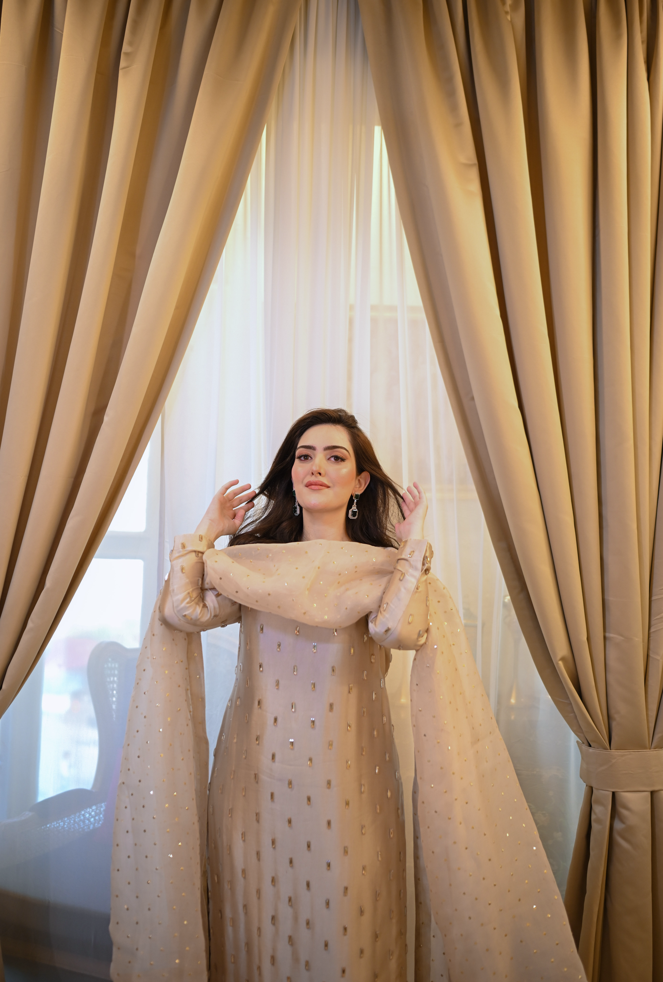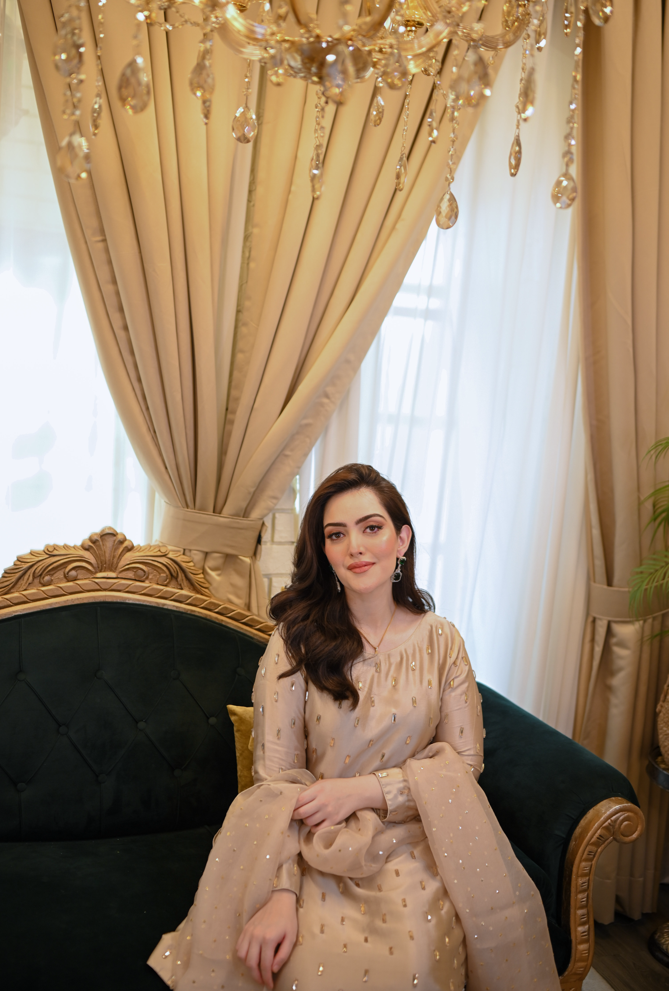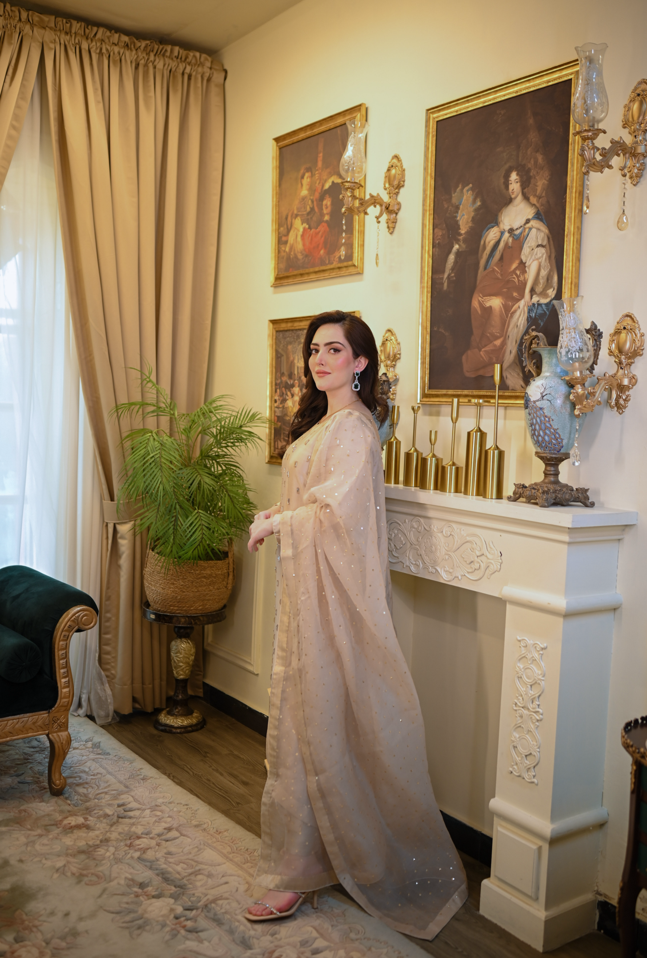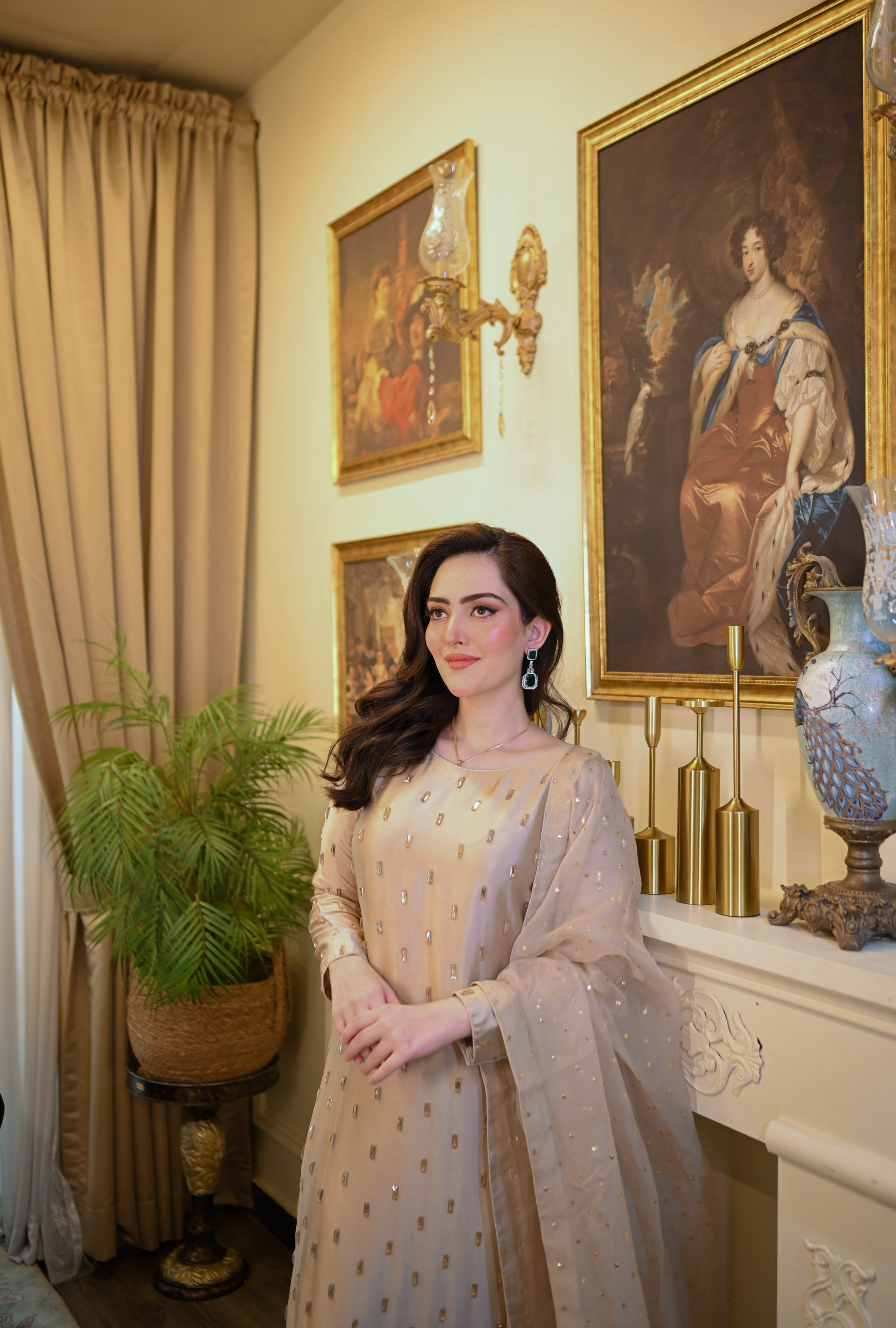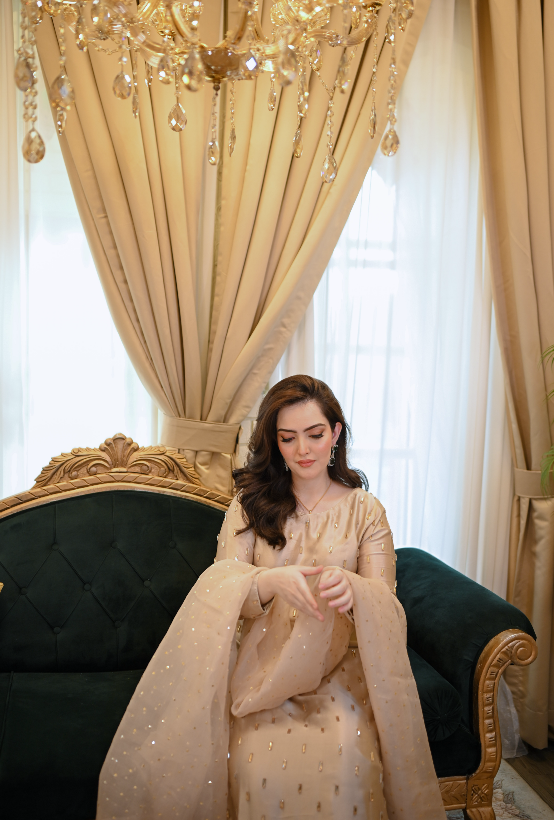 This exquisite skater gold dress is crafted from luxurious tassals silk fabric, known for its soft texture and elegant drape. The dress features intricate handmade work, showcasing a stunning combination of crystals and traditional baitki embroidery that adds a touch of opulence. Each element is meticulously designed to enhance the overall aesthetic, making it perfect for special occasions. The shimmering hues of skater and gold create a captivating visual appeal, ensuring you stand out in any crowd.