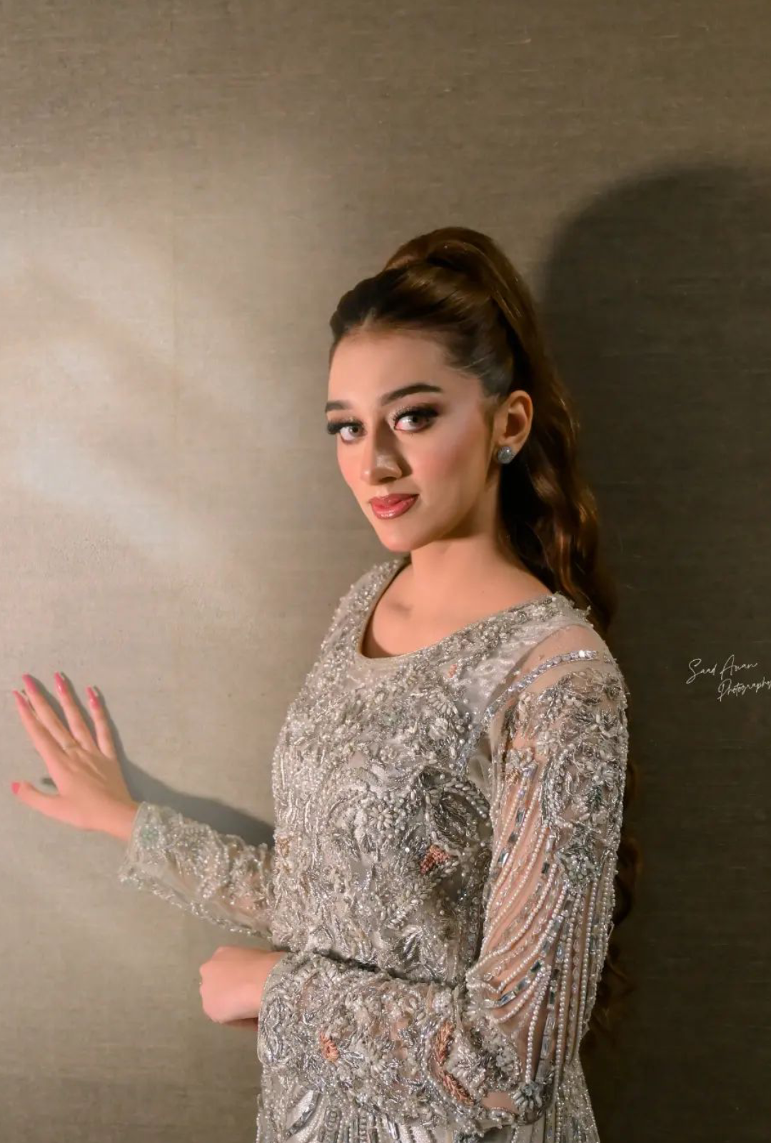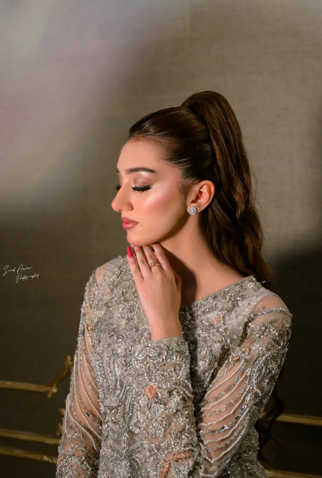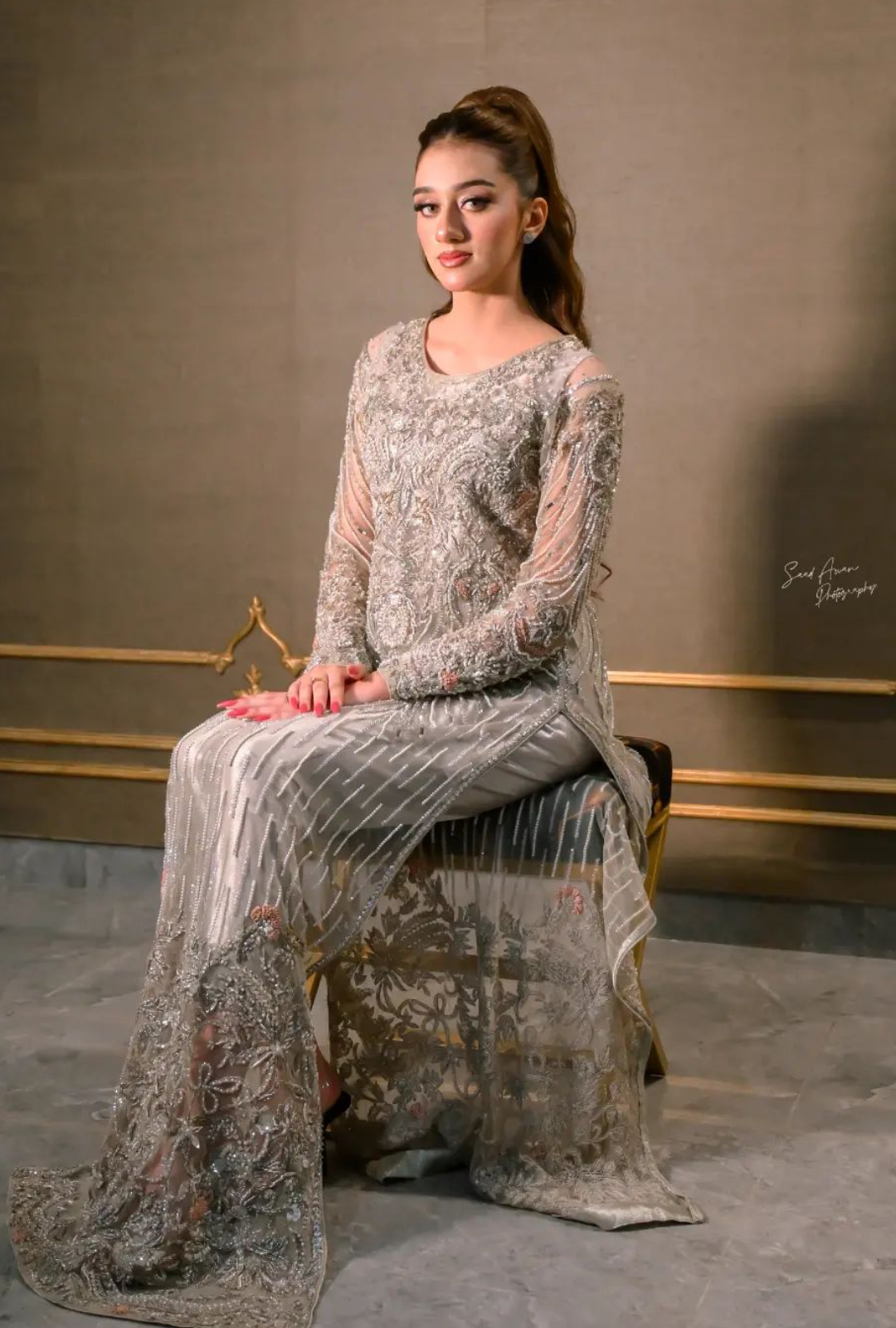 This exquisite almond white dress is crafted from delicate net fabric, providing a light and airy feel. The intricate embellishments include sparkling crystals, lustrous pearls, and shimmering sequins that create a stunning visual effect. Traditional embroidery techniques such as naqshi and resham add depth and texture to the design, while dabka work enhances its elegance. The addition of kingri and baitki details further elevates the overall aesthetic, making this dress perfect for special occasions. With its combination of modern and traditional elements, this dress is sure to make a statement.