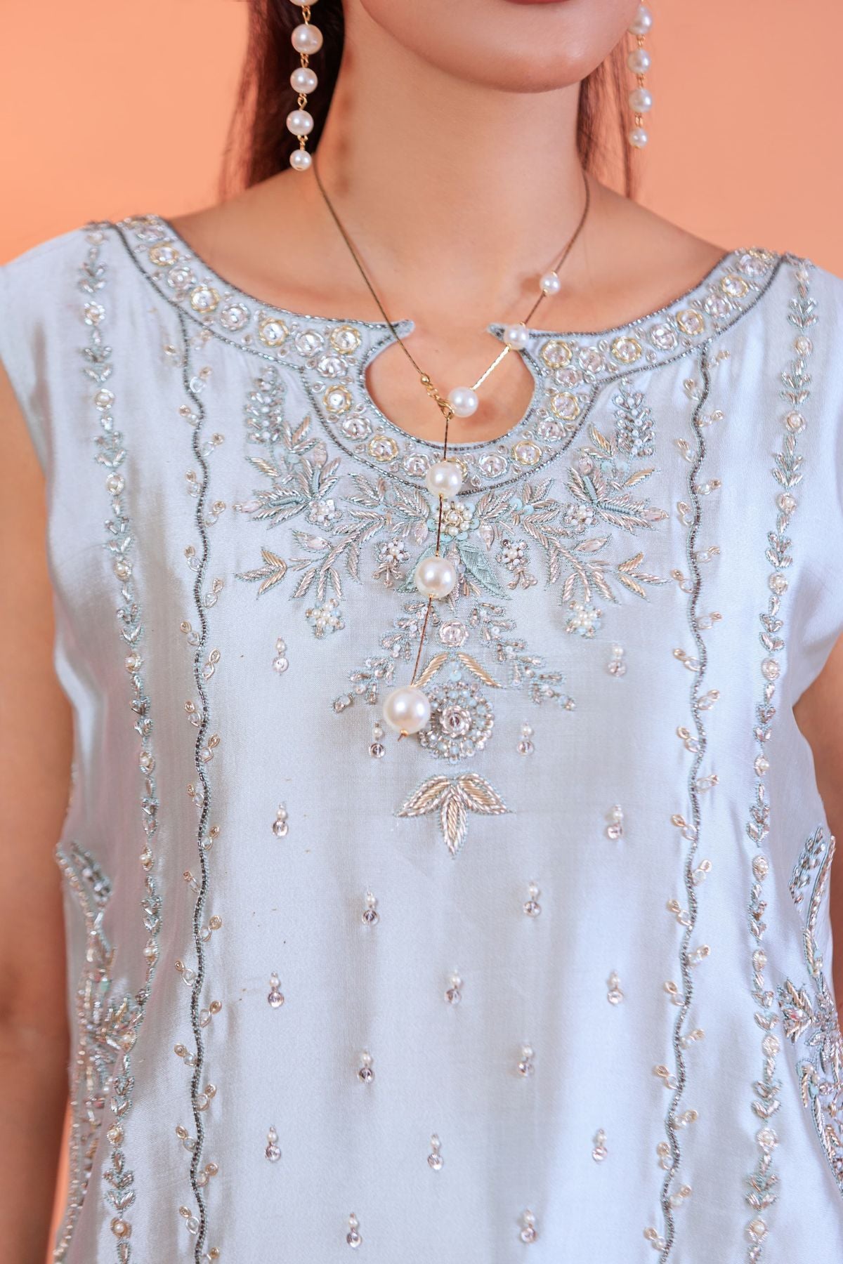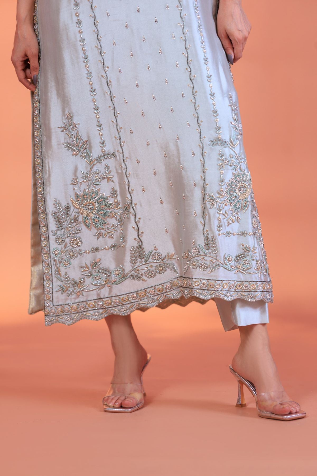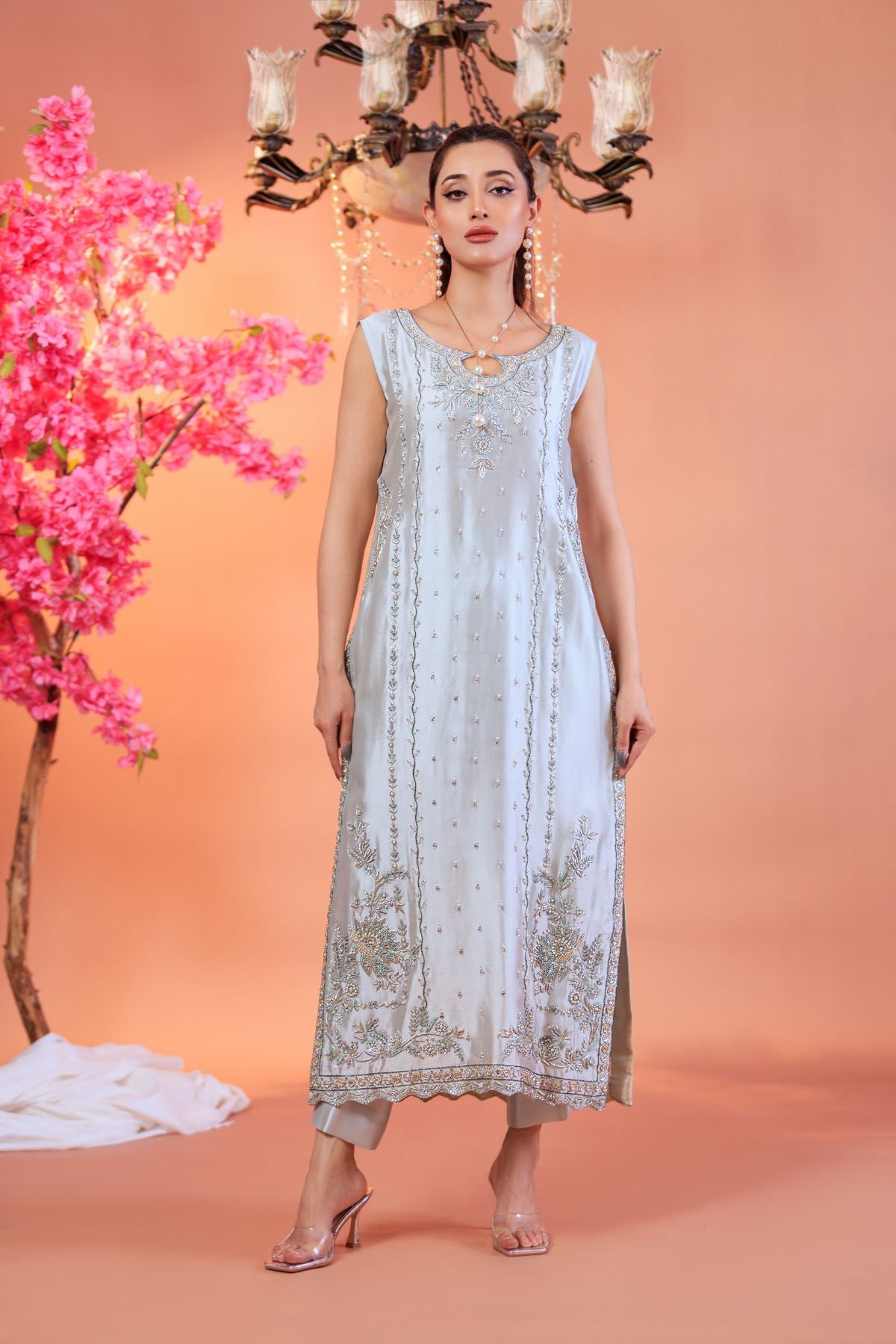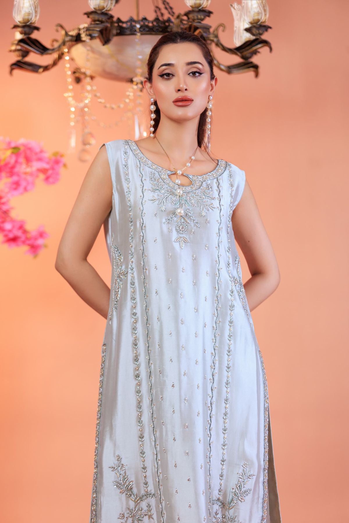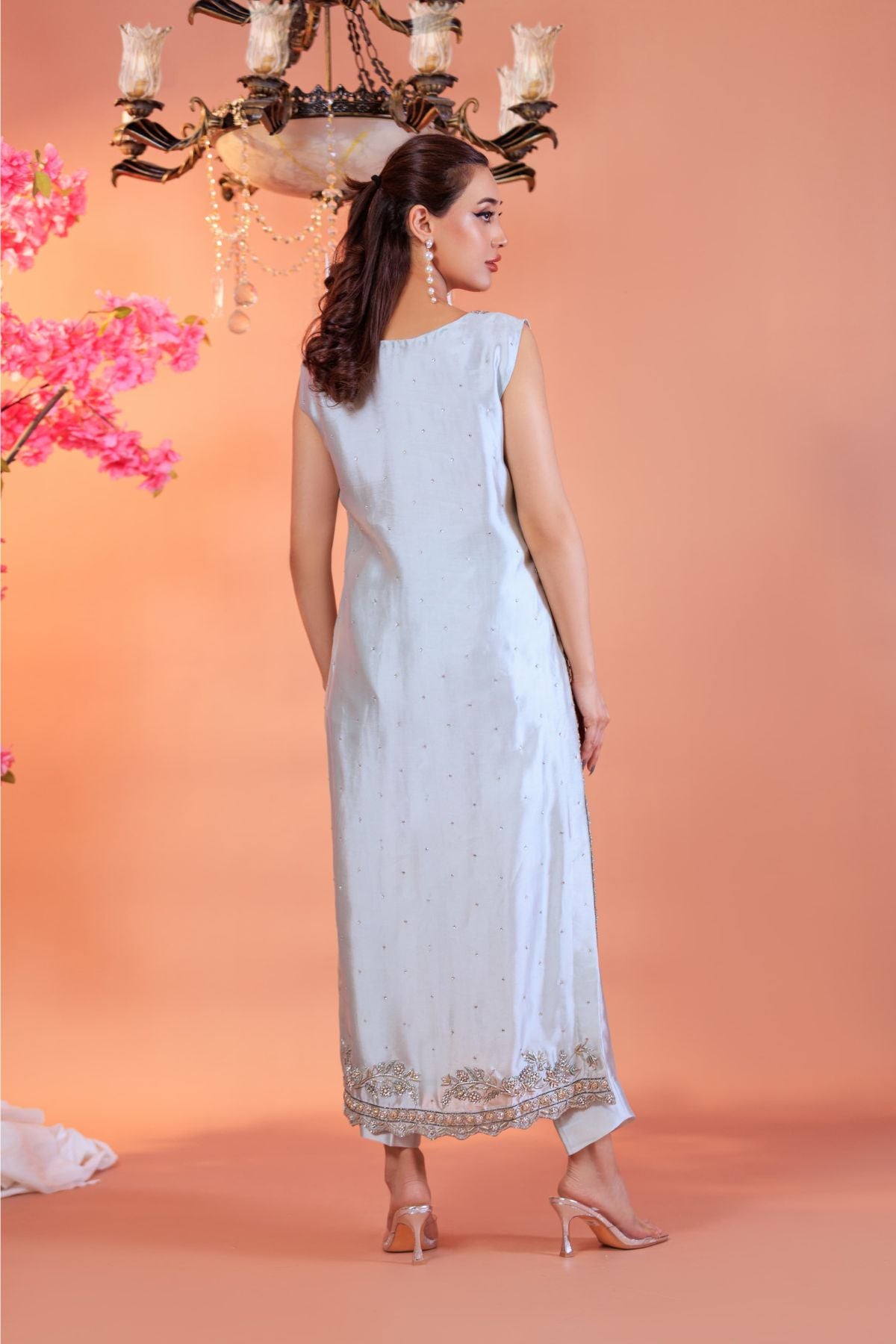 This elegant aqua white formal dress set embodies refined sophistication, perfect for upscale occasions. The sleeveless, floor-length kurta is adorned with intricate silver and gold embroidery, featuring delicate floral patterns that grace the front and borders, adding a touch of opulence. Paired with matching straight pants, this ensemble creates a sleek and graceful silhouette. Ideal for weddings, parties, or formal gatherings, this dress set blends traditional craftsmanship with contemporary style, ensuring a captivating and poised look.