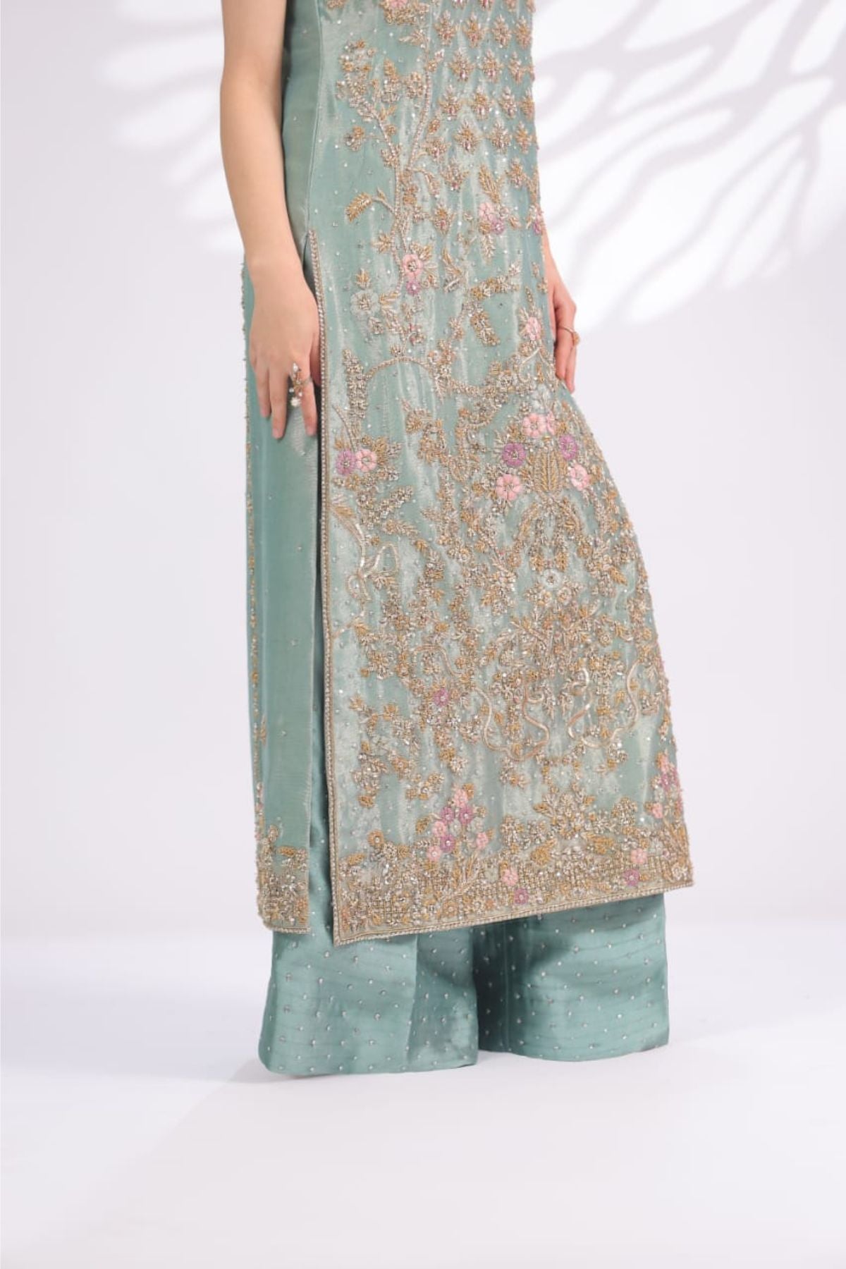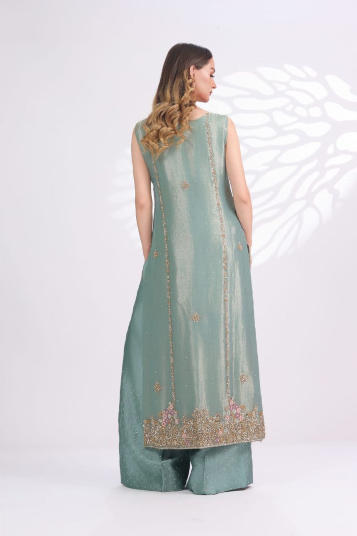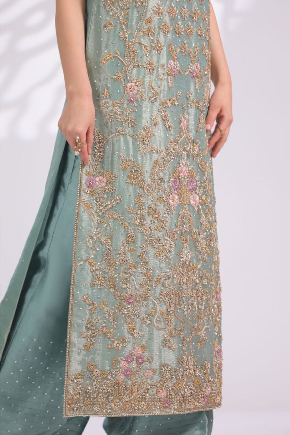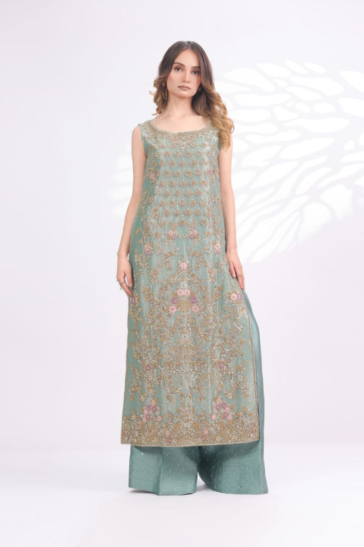 The Ariya Seafoam Embroidered Set is a graceful expression of pastel elegance and fine craftsmanship. Rendered in a soothing seafoam green tone, the long sleeveless silhouette is adorned with intricate gold embroidery accented with subtle blush details, creating a delicate floral narrative across the front panel. The refined neckline and detailed hem add polish, while the matching wide-leg trousers, finished with soft embellishment, complete the look seamlessly. Perfect for daytime festivities, formal luncheons, or intimate celebrations, Ariya Seafoam offers understated luxury with a fresh, modern charm.