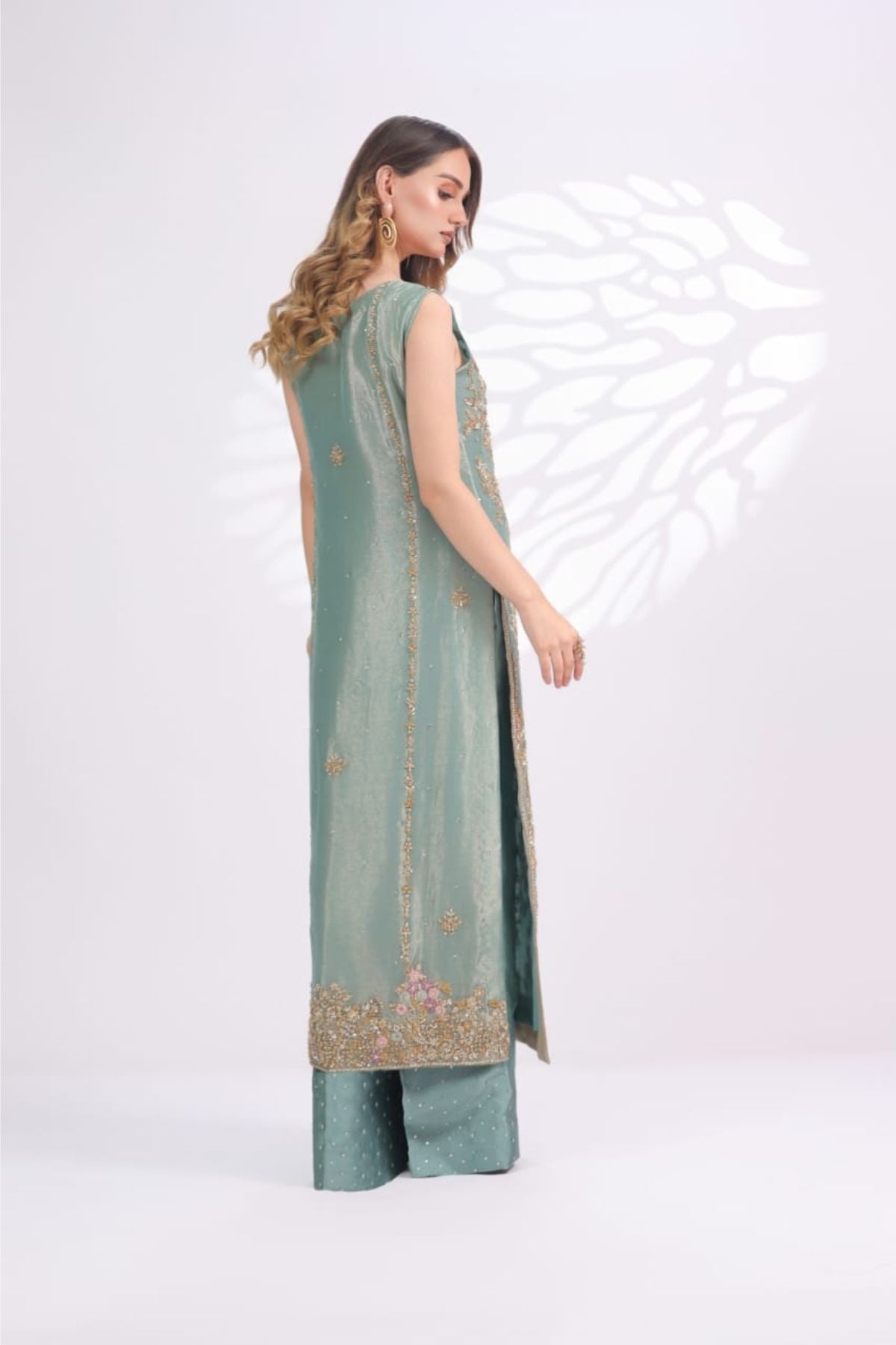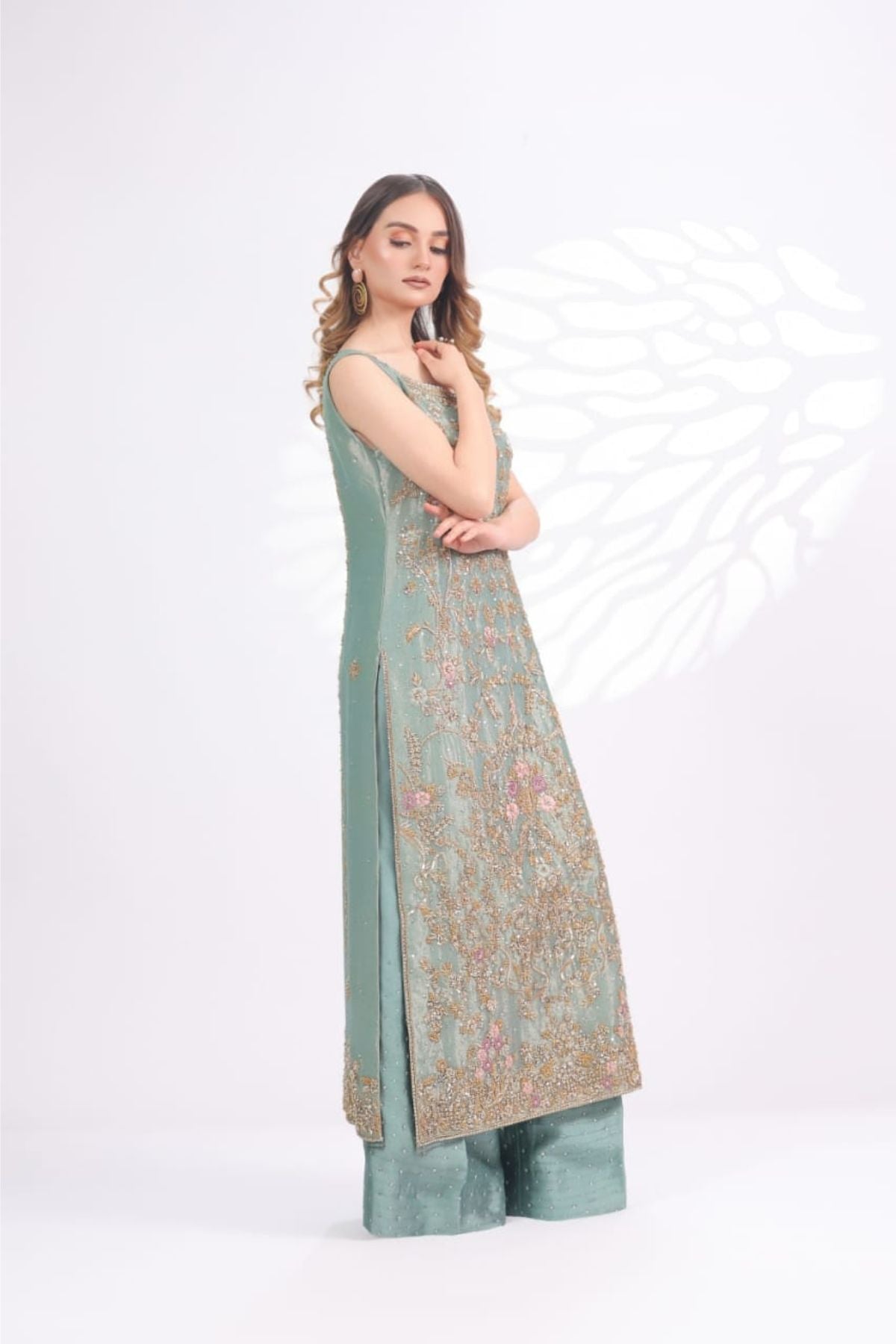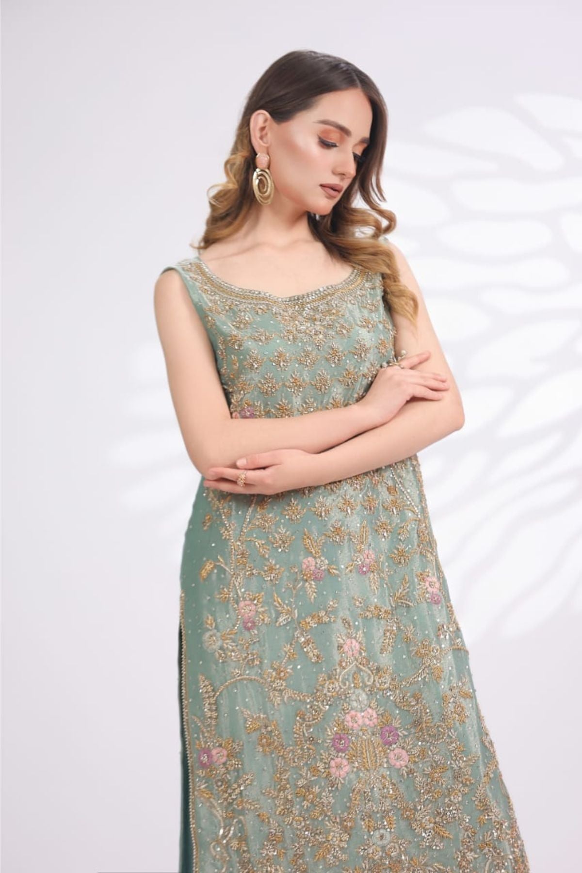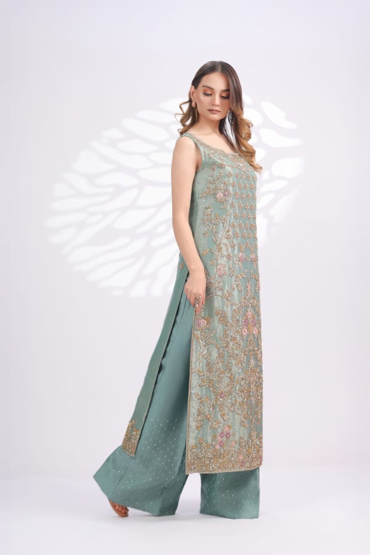 The Ariya Seafoam Embroidered Set is a graceful expression of pastel elegance and fine craftsmanship. Rendered in a soothing seafoam green tone, the long sleeveless silhouette is adorned with intricate gold embroidery accented with subtle blush details, creating a delicate floral narrative across the front panel. The refined neckline and detailed hem add polish, while the matching wide-leg trousers, finished with soft embellishment, complete the look seamlessly. Perfect for daytime festivities, formal luncheons, or intimate celebrations, Ariya Seafoam offers understated luxury with a fresh, modern charm.