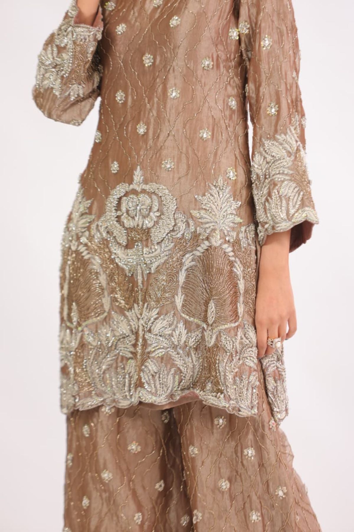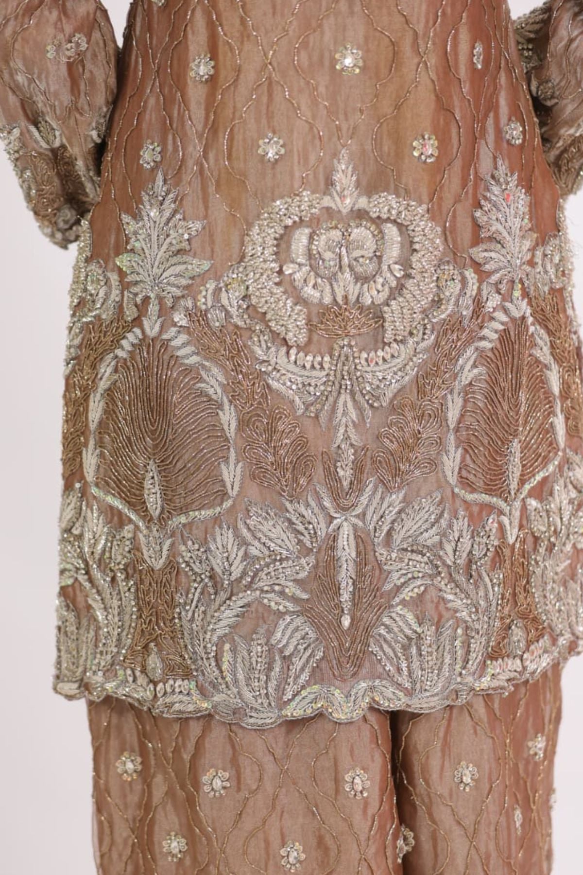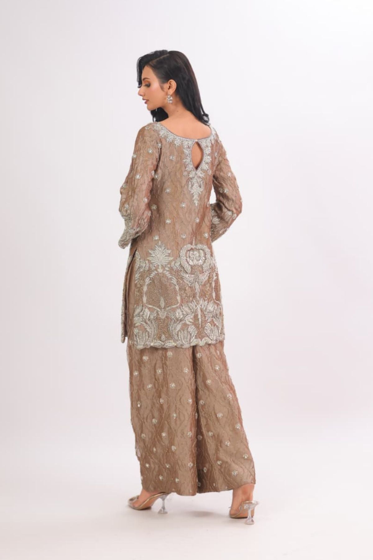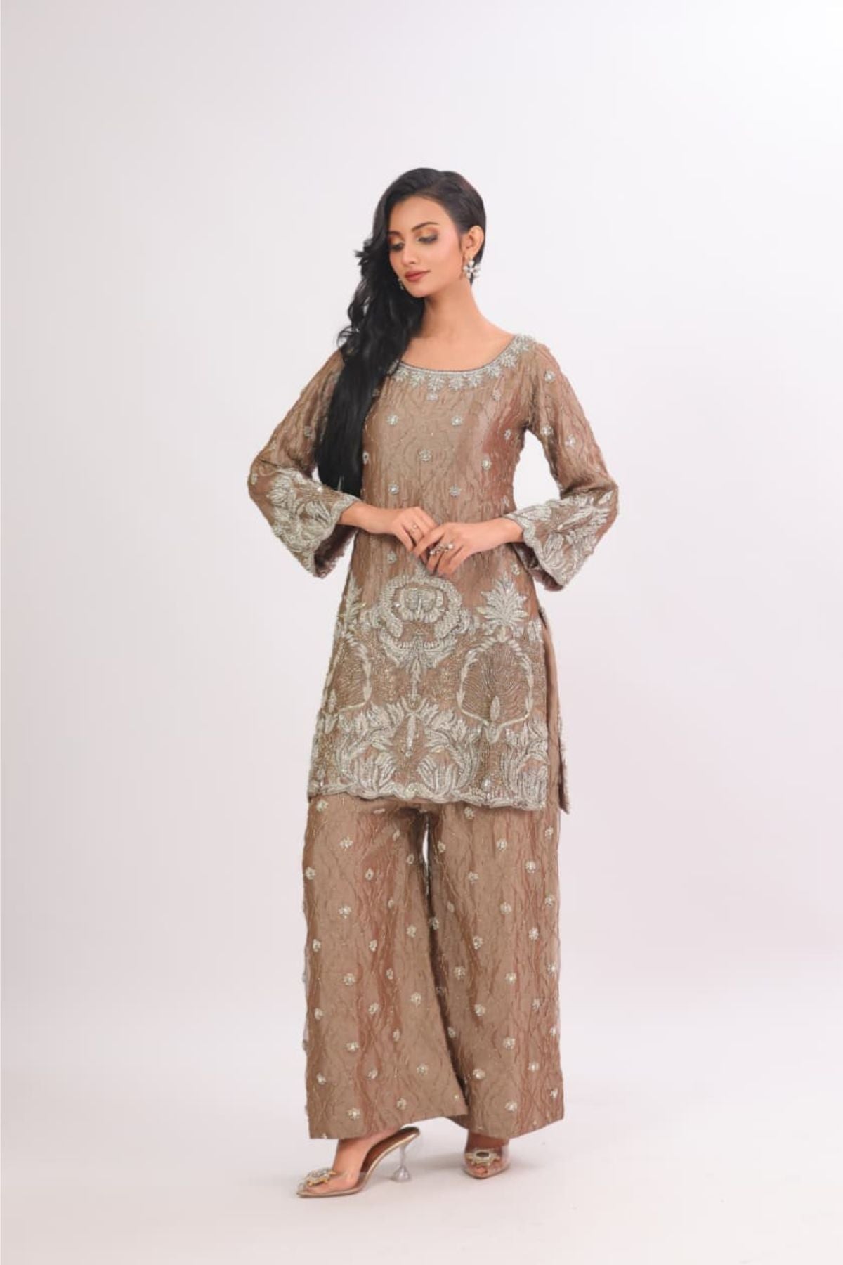 The Arwina Taupe Embroidered Set blends soft sophistication with intricate craftsmanship. Its elegant taupe base is richly adorned with silver threadwork, forming delicate motifs across the shirt and trousers. The flared sleeves add a graceful touch, while the coordinated embroidered trousers complete the look with refined harmony. Perfect for formal gatherings, evening dinners, or festive occasions, this ensemble delivers a timeless charm with a modern, understated elegance.