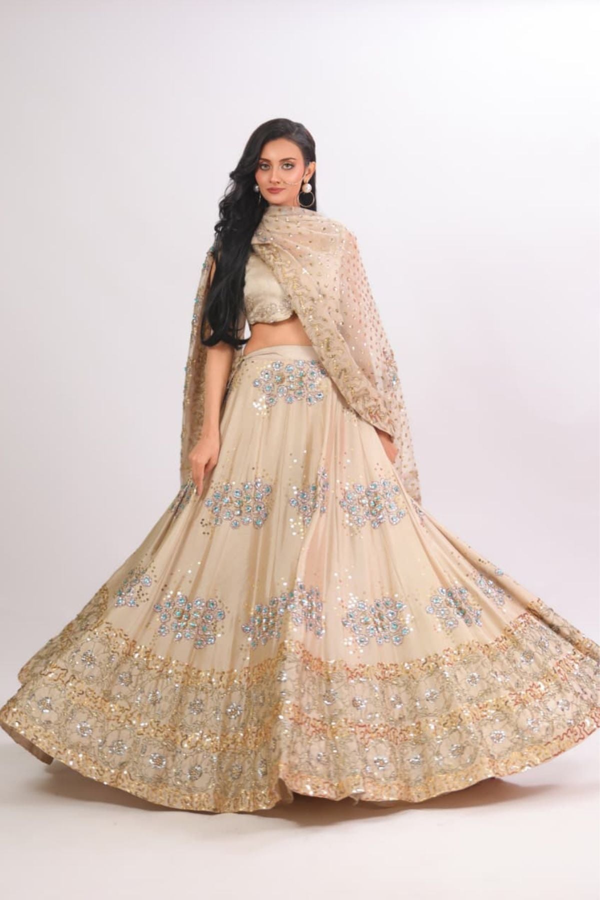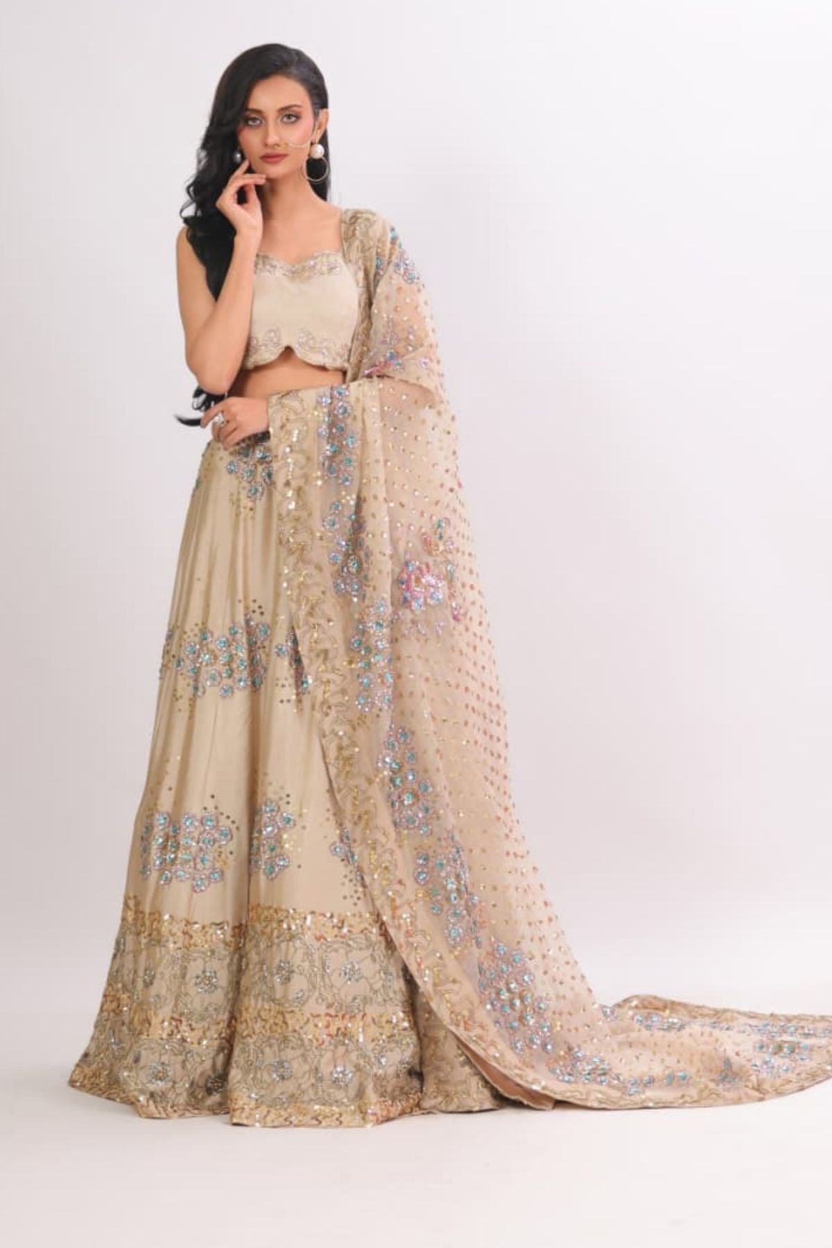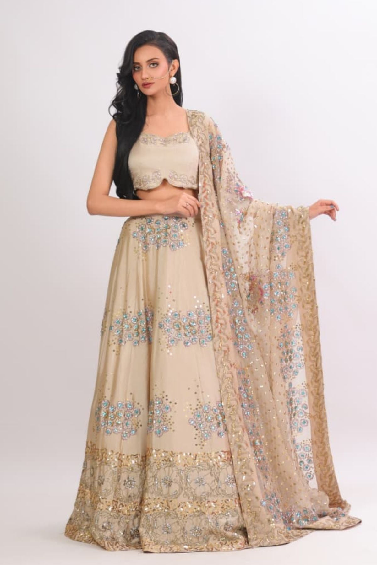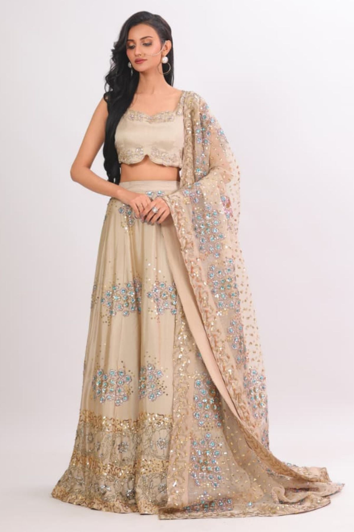 he Aurelia Champagne Lehenga Set radiates modern elegance with its soft champagne base and intricate aqua-gold embellishment work. The fitted scalloped blouse adds a refined touch, while the flowing lehenga sparkles with detailed floral motifs and delicate sequin artistry. Paired with a beautifully embellished dupatta, this ensemble creates a dreamy, feminine silhouette perfect for weddings, receptions, and festive celebrations. Lightweight yet luxurious, it drapes effortlessly for a polished, graceful look.
