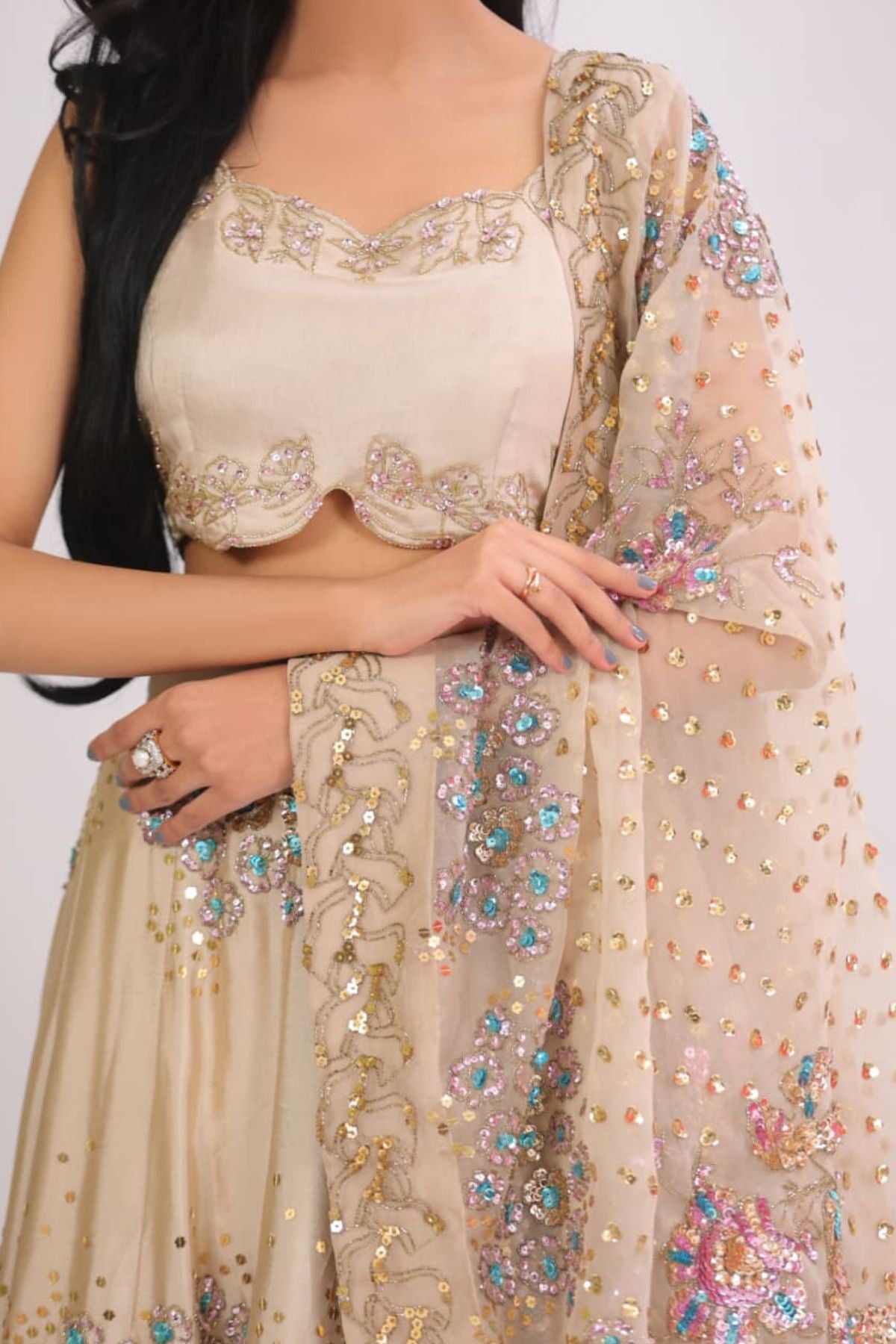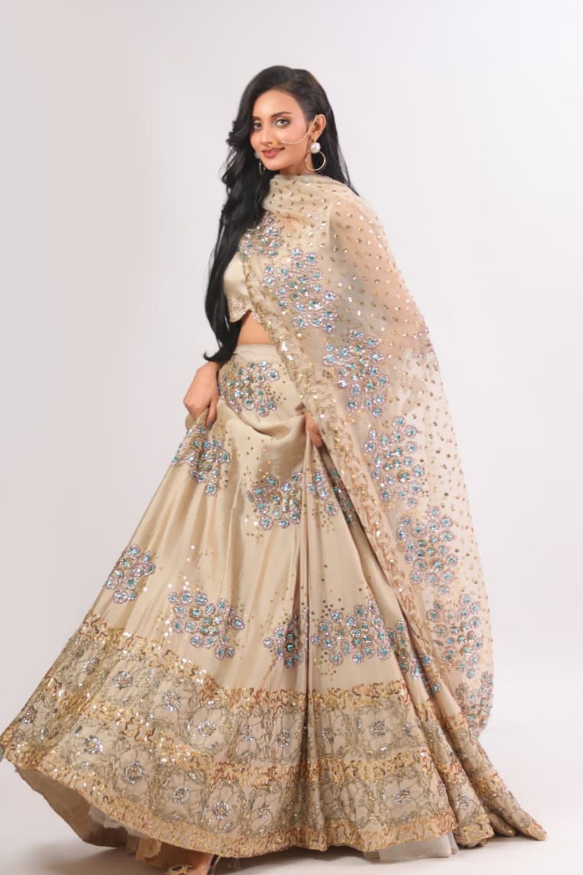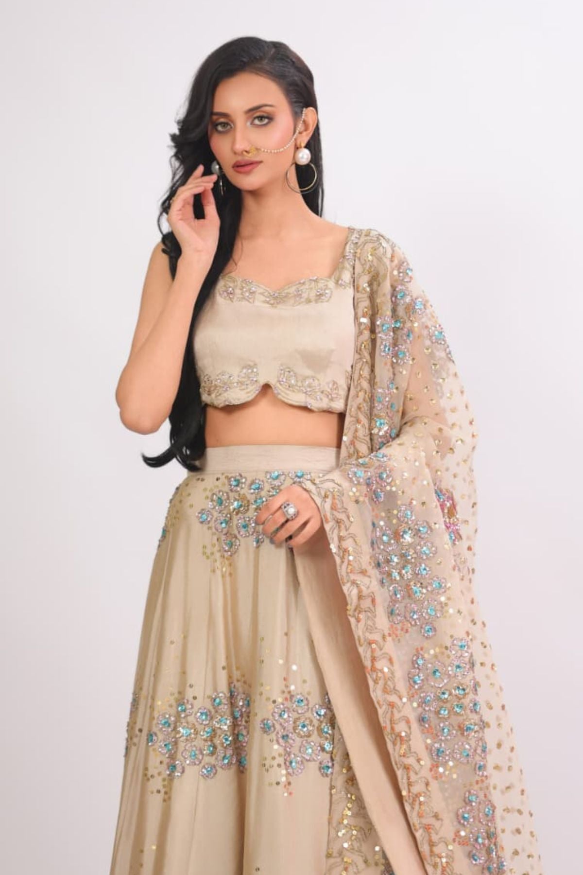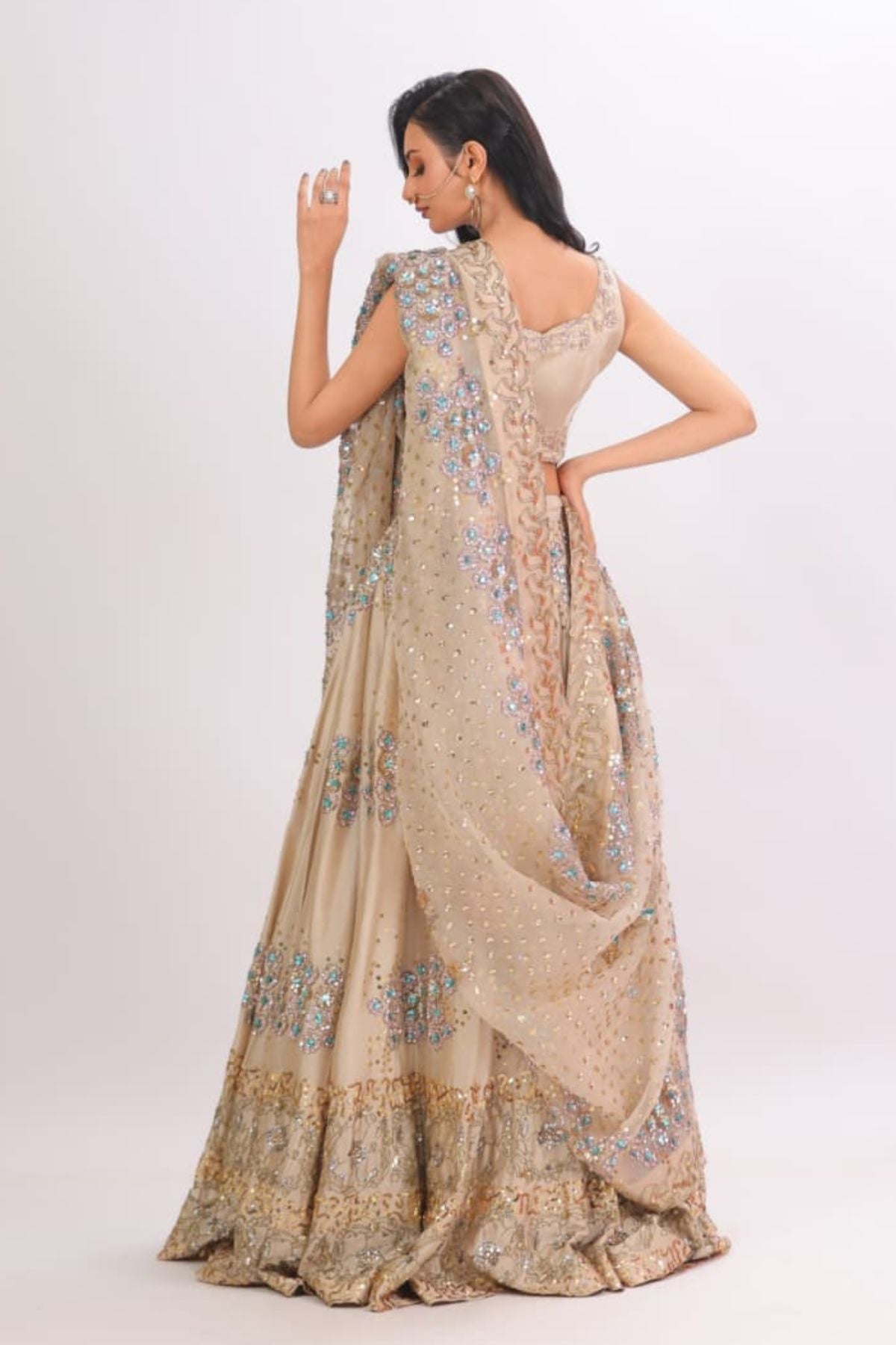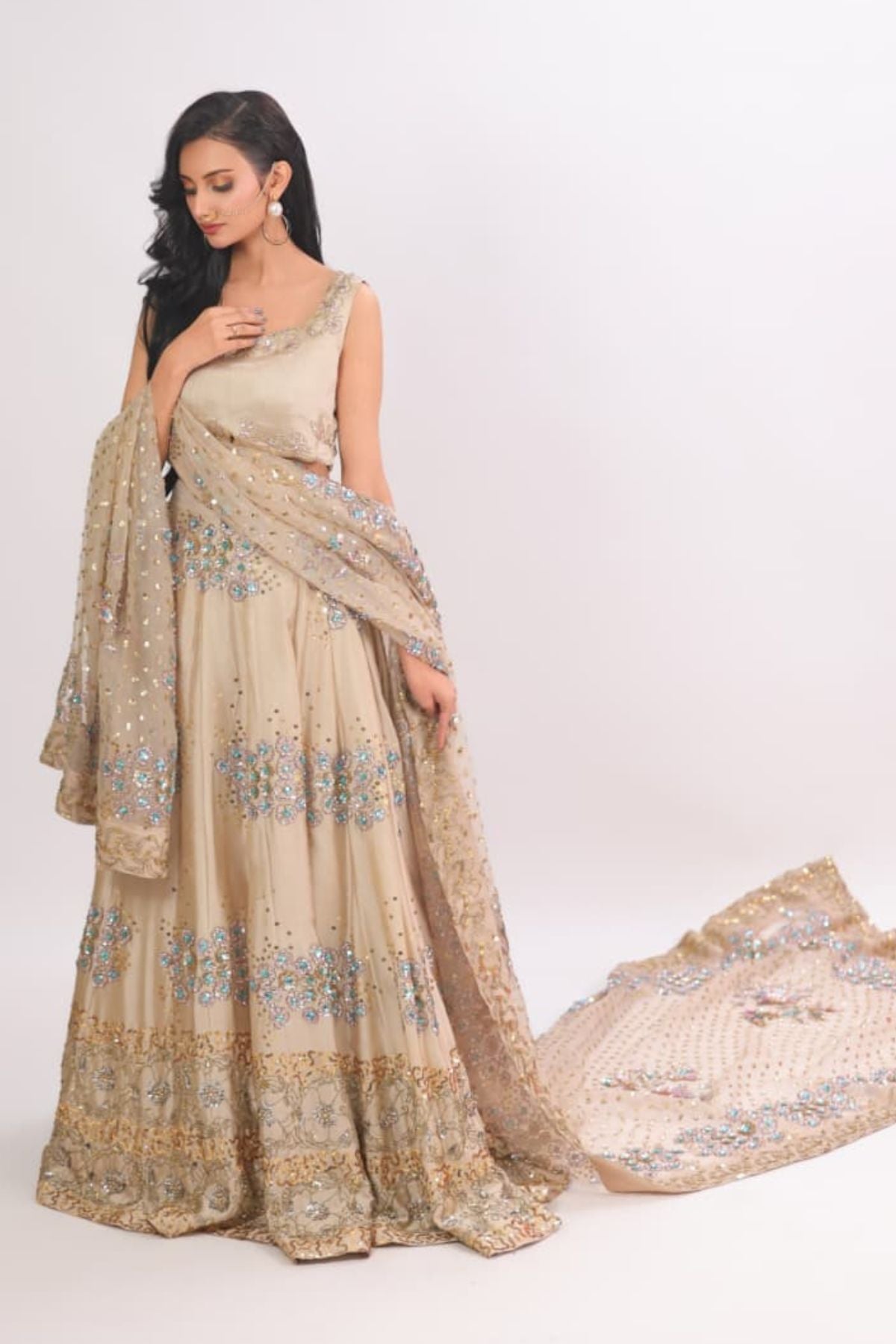 he Aurelia Champagne Lehenga Set radiates modern elegance with its soft champagne base and intricate aqua-gold embellishment work. The fitted scalloped blouse adds a refined touch, while the flowing lehenga sparkles with detailed floral motifs and delicate sequin artistry. Paired with a beautifully embellished dupatta, this ensemble creates a dreamy, feminine silhouette perfect for weddings, receptions, and festive celebrations. Lightweight yet luxurious, it drapes effortlessly for a polished, graceful look.