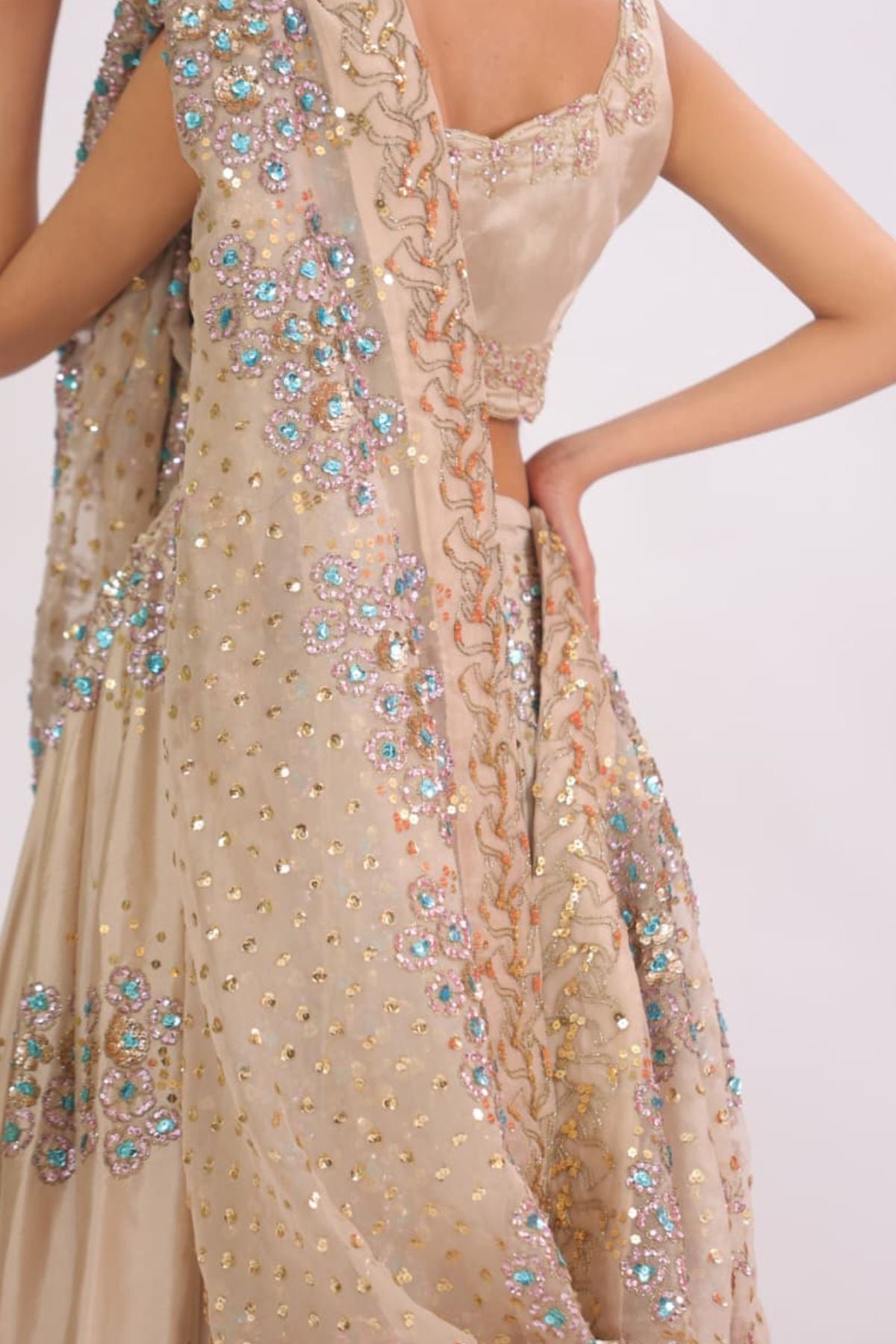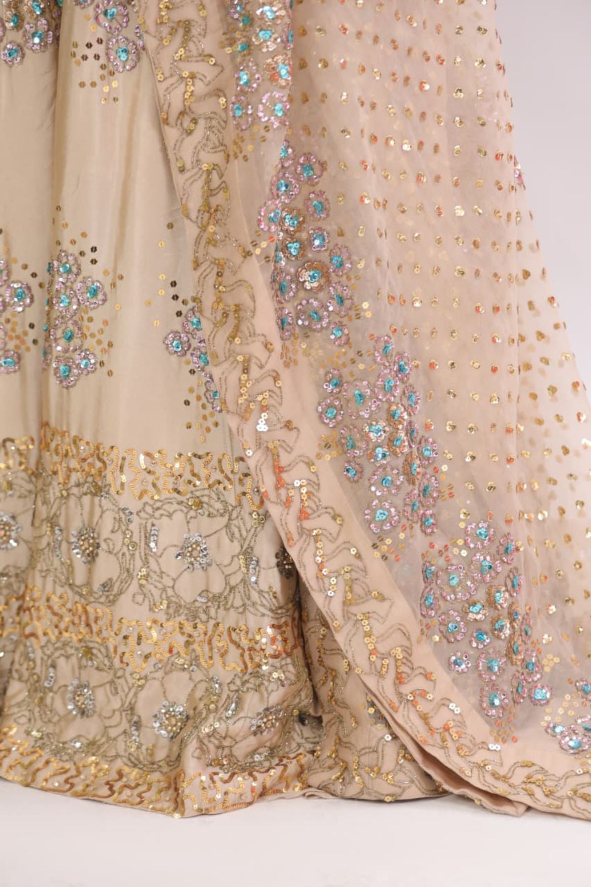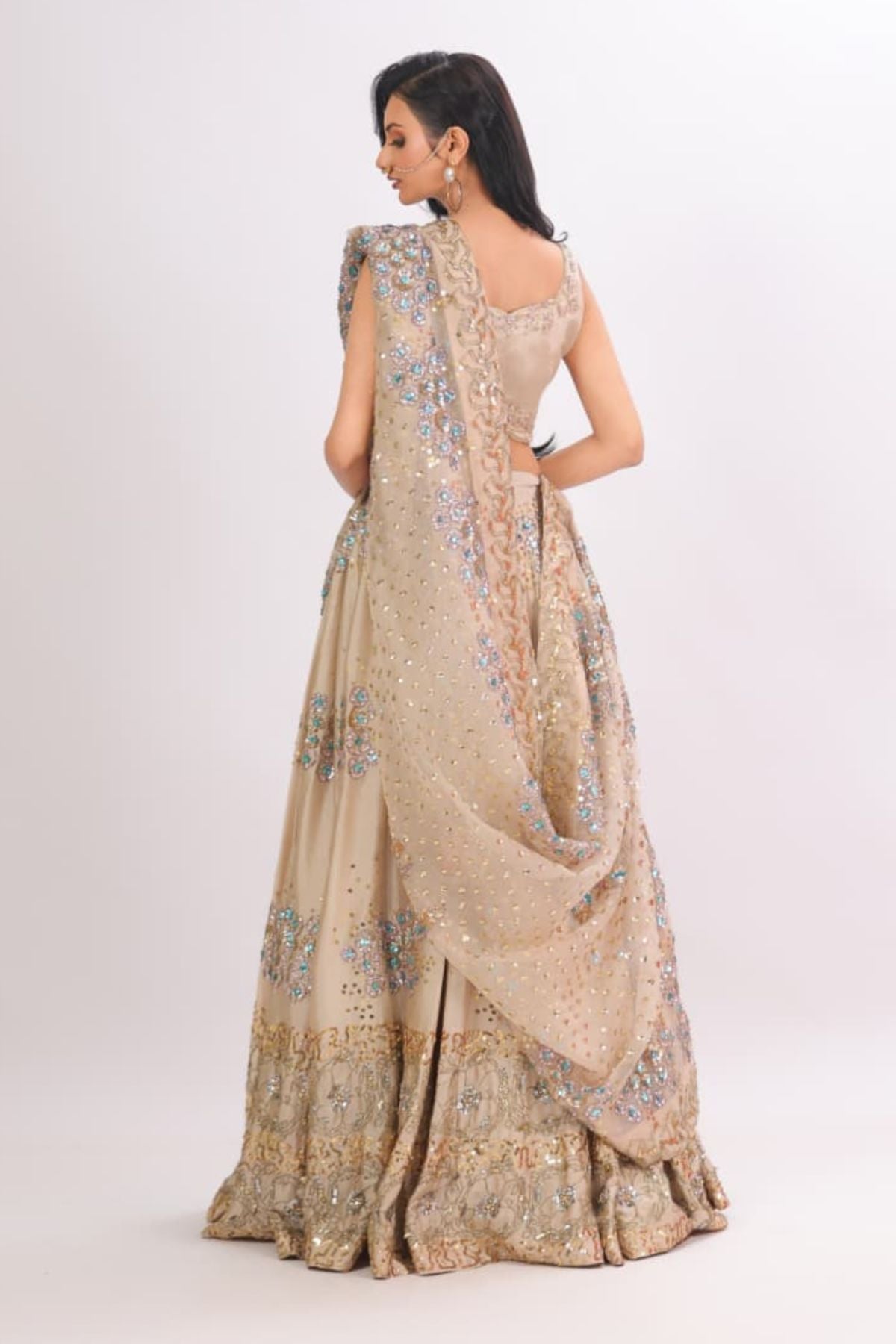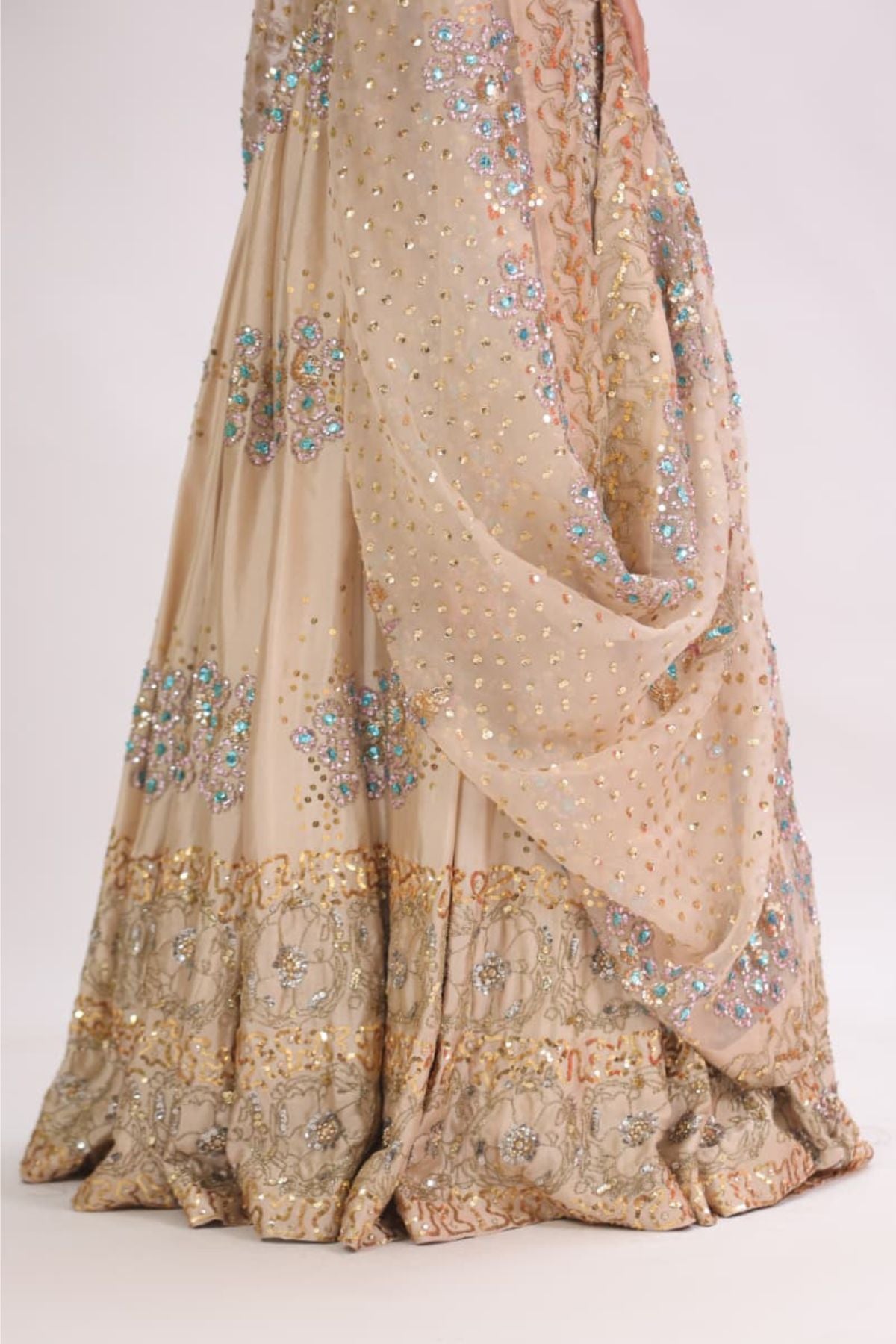 he Aurelia Champagne Lehenga Set radiates modern elegance with its soft champagne base and intricate aqua-gold embellishment work. The fitted scalloped blouse adds a refined touch, while the flowing lehenga sparkles with detailed floral motifs and delicate sequin artistry. Paired with a beautifully embellished dupatta, this ensemble creates a dreamy, feminine silhouette perfect for weddings, receptions, and festive celebrations. Lightweight yet luxurious, it drapes effortlessly for a polished, graceful look.