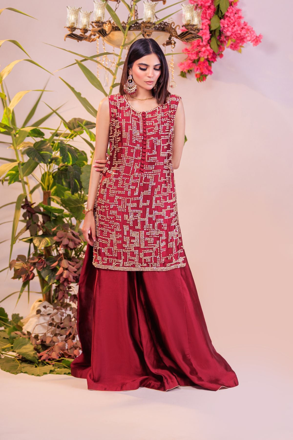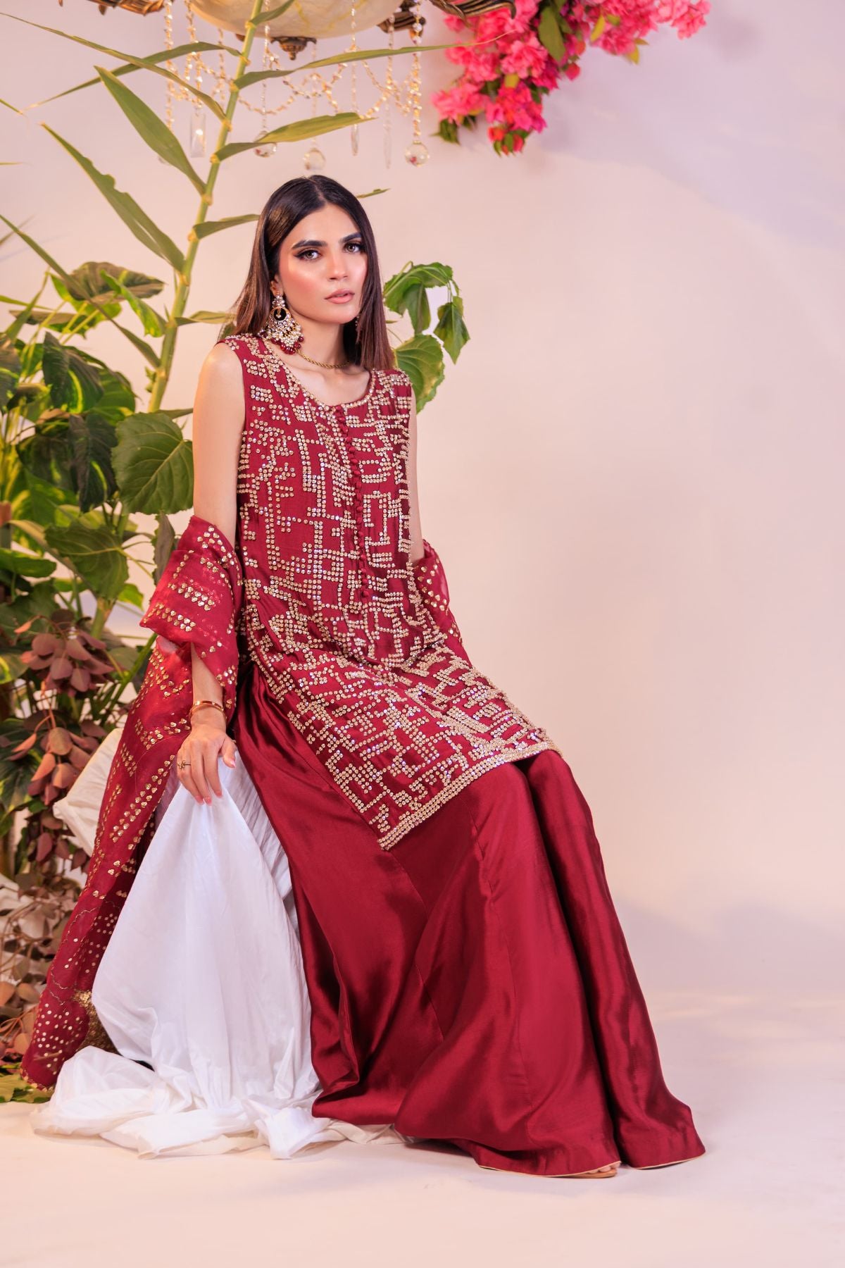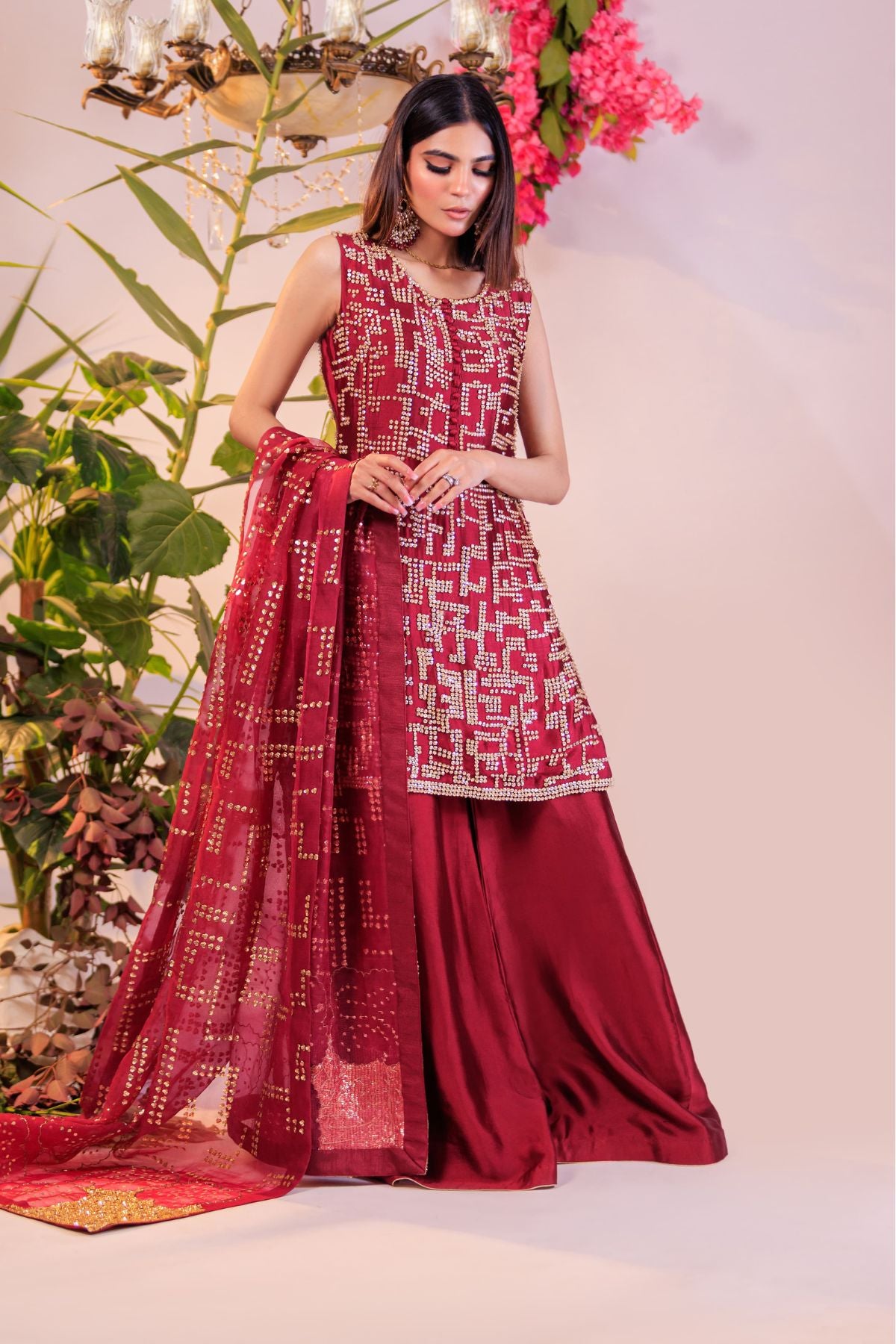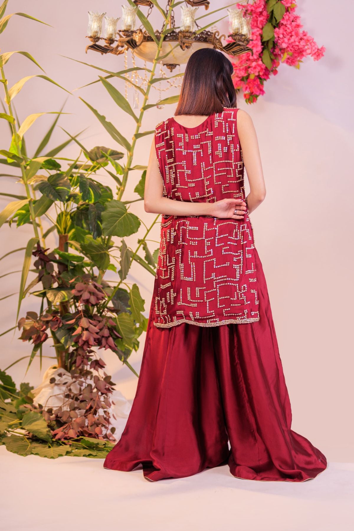 Elevate your festive wardrobe with this captivating crimson outfit, radiating elegance and tradition. The sleeveless kameez is intricately adorned with geometric mirror work and delicate embellishments, creating a bold mosaic-inspired pattern that shimmers with every movement.