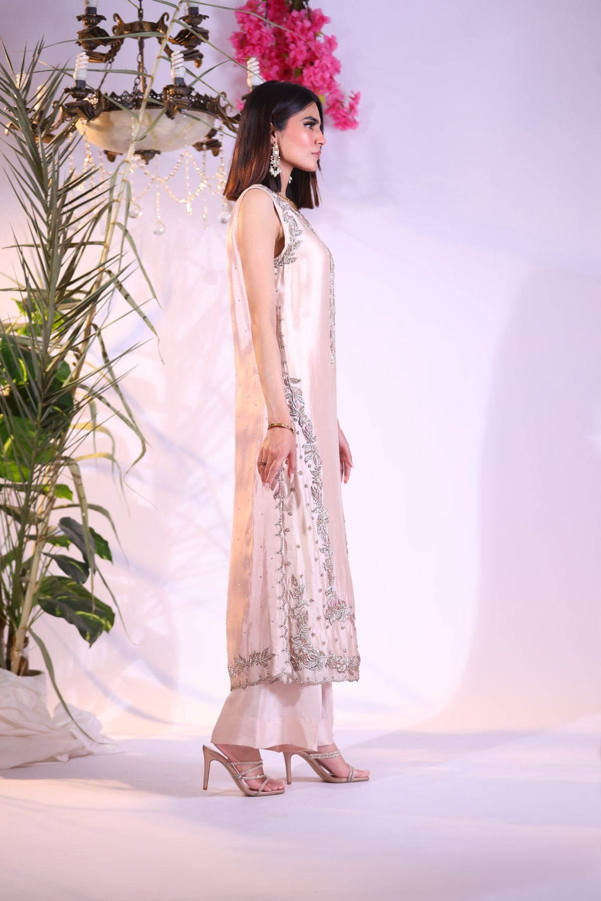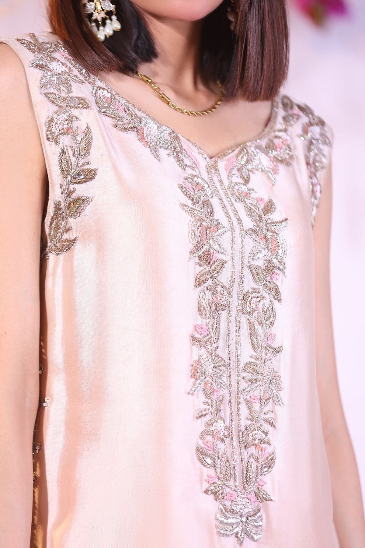 Exude understated luxury with this dreamy blush pink long shirt, designed in a sleeveless silhouette for effortless elegance. The front is adorned with delicate silver and pastel thread embroidery, gracefully framing the neckline and hem with soft floral vines and intricate detailing.