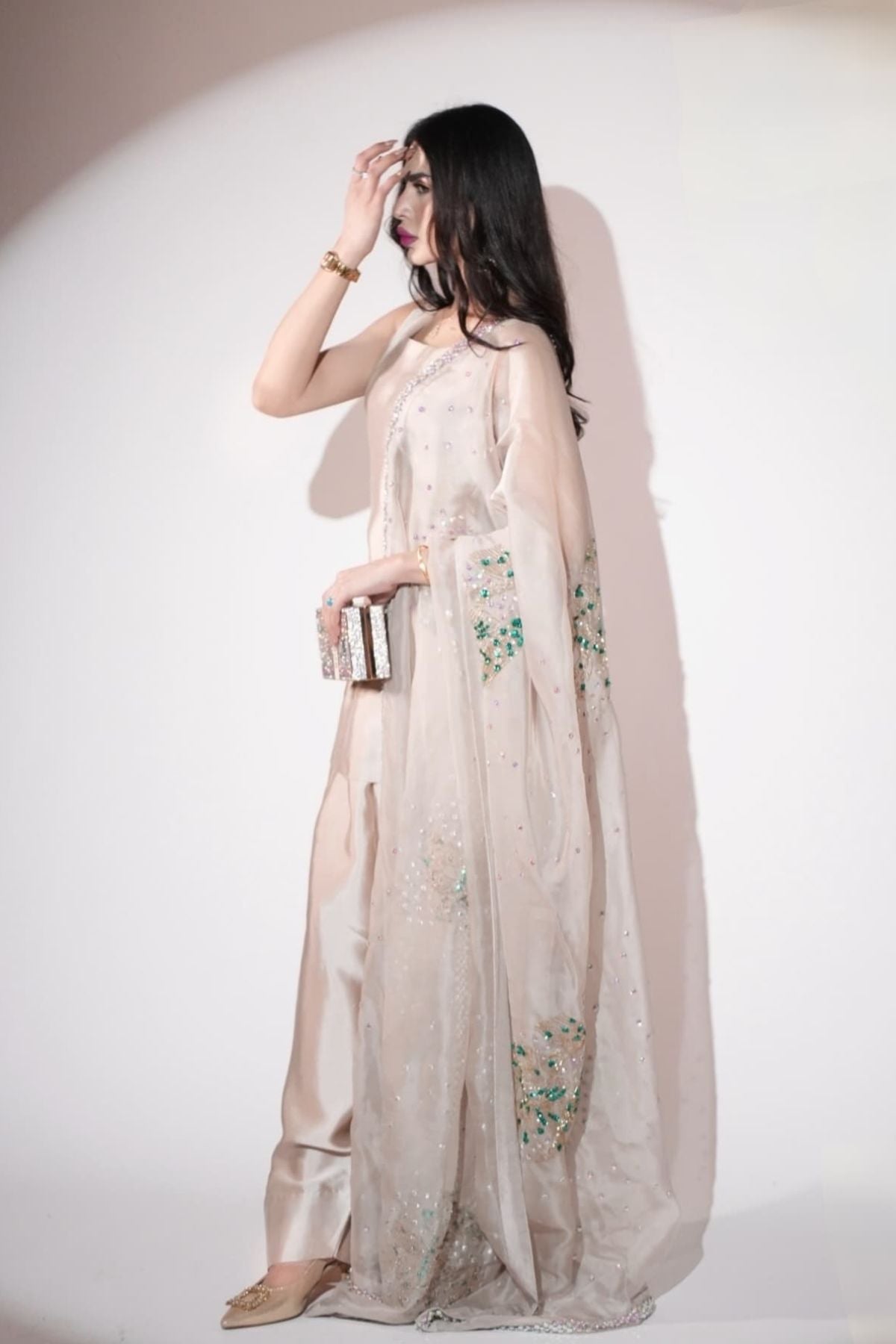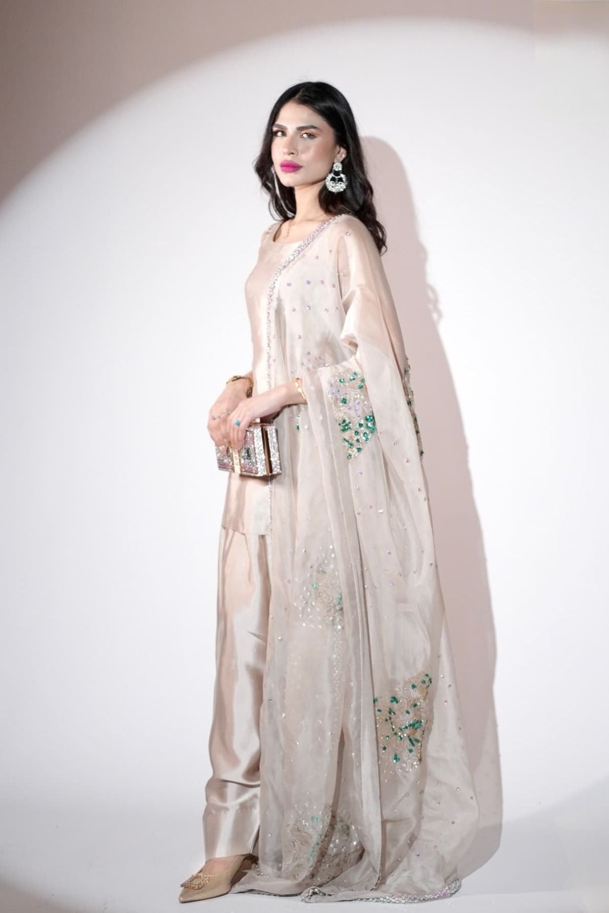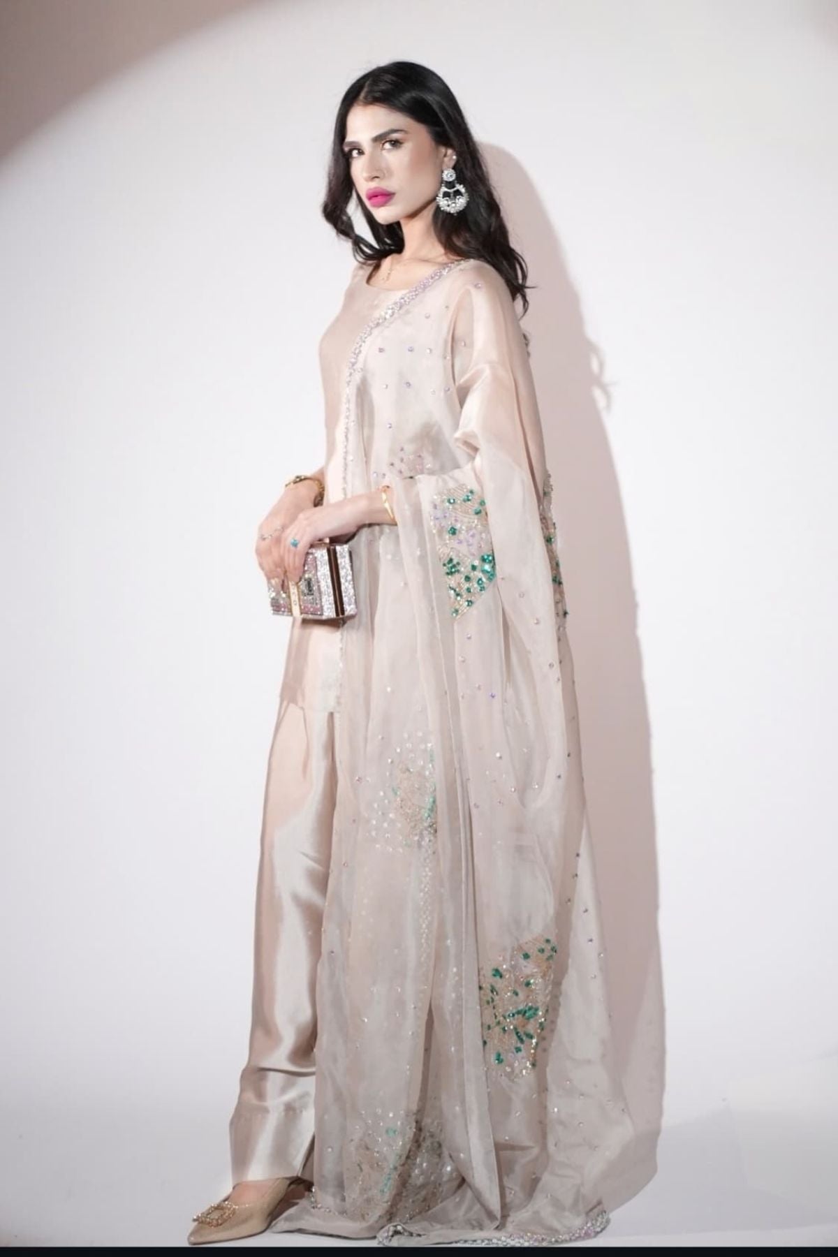 This stunning outfit features a delicate champagne hue, exuding sophistication and grace. The lightweight fabric is adorned with intricate green and silver embellishments, adding a touch of opulence. Perfect for a formal event, the ensemble includes a flowing dupatta and matching trousers, complemented by elegant accessories.