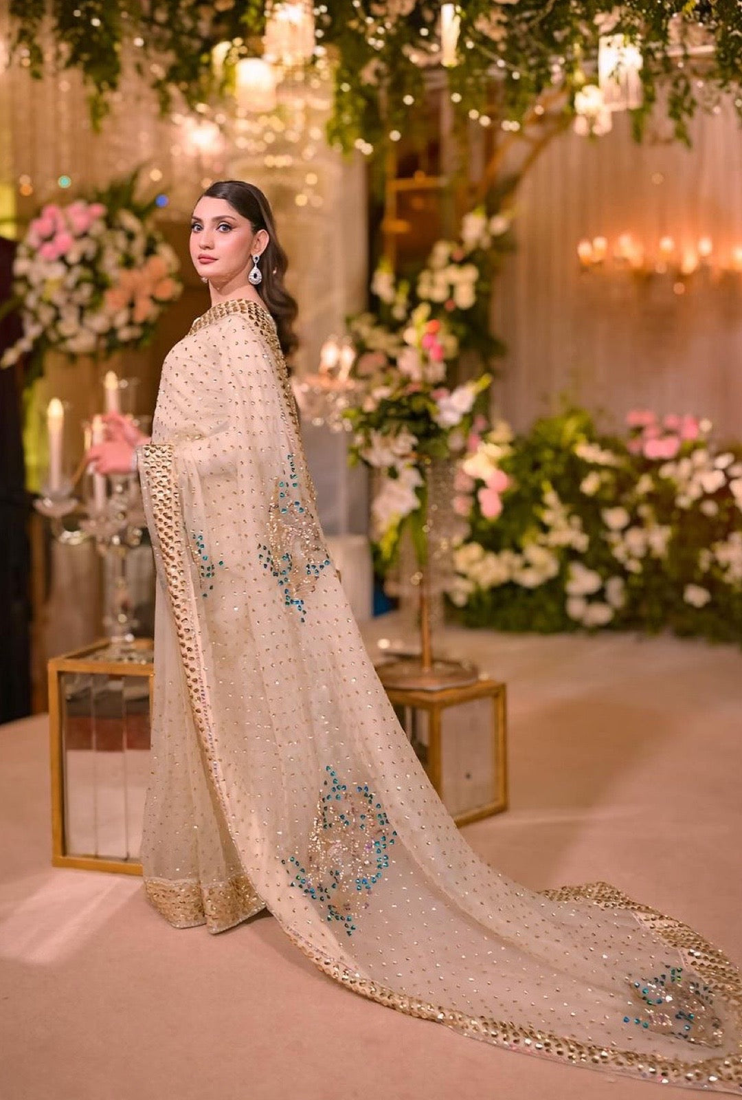 "CHANDANI" design by Usama Silk is a celebration of grace and beauty, meticulously crafted on pure organza. Embellished with delicate sequins and shimmering crystal flowers, this masterpiece exudes sophistication. Every detail whispers of luxury and charm, making it a truly enchanting creation.