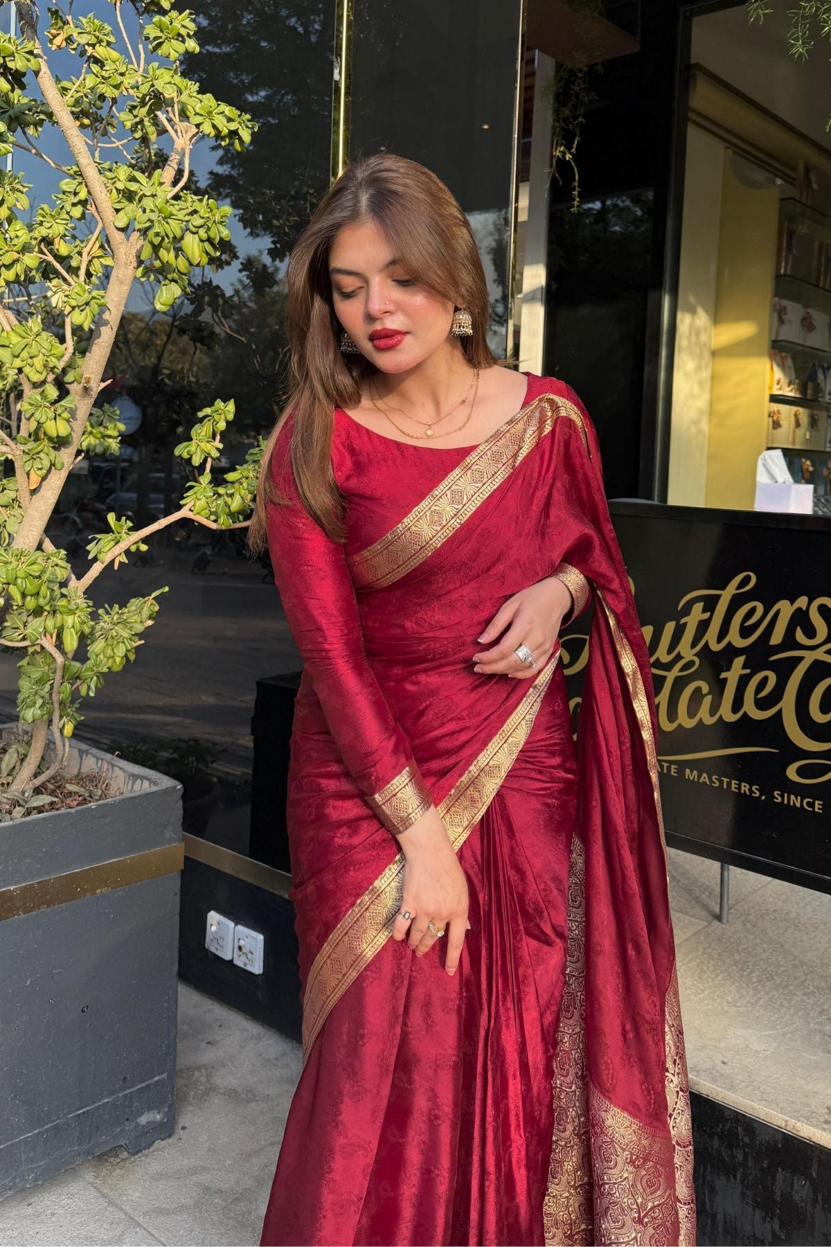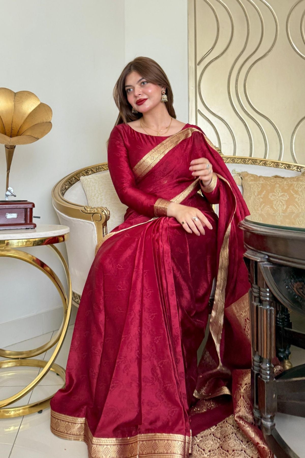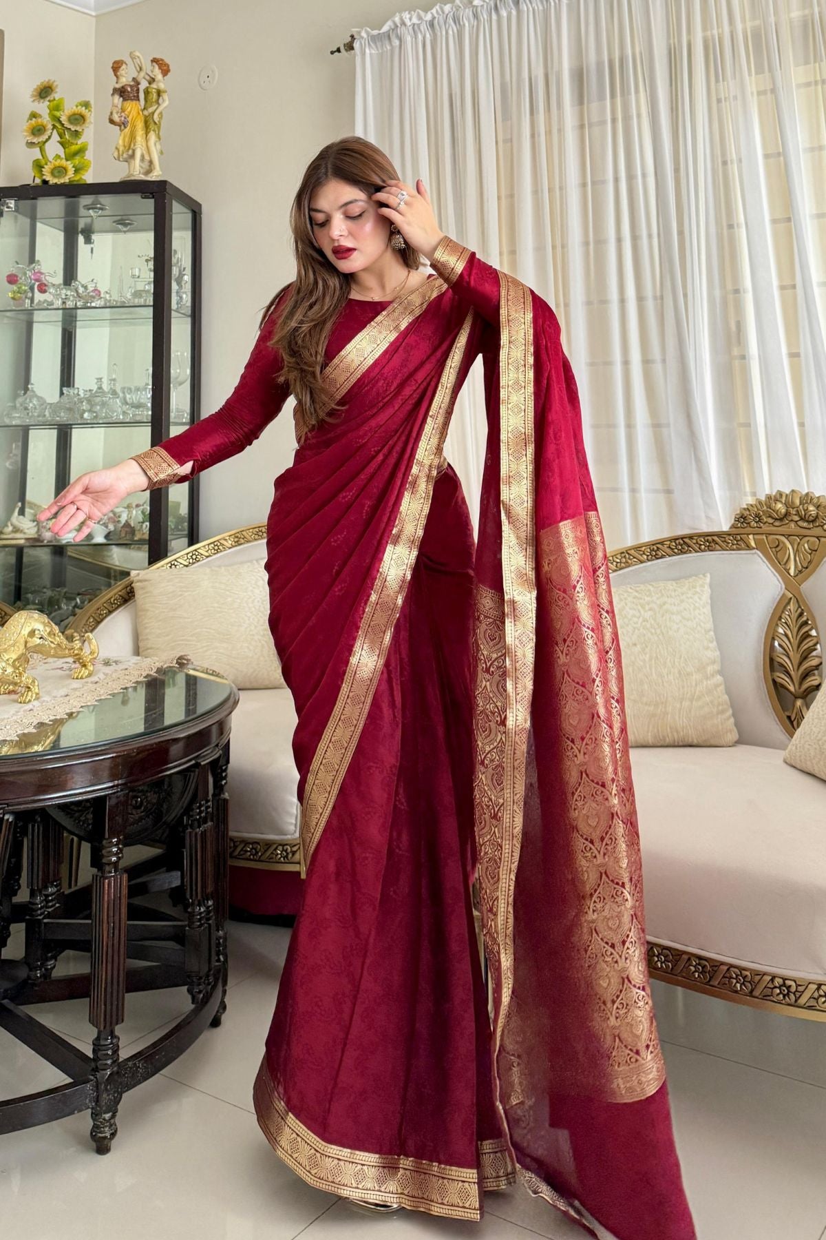 Embrace tradition with this elegant maroon banarsi saree, featuring a rich gold woven border with intricate patterns. The luxurious fabric drapes beautifully, showcasing a subtle sheen and delicate motifs throughout. Perfect for weddings, festivals, or formal occasions, this saree pairs effortlessly with gold jewelry to create a timeless, sophisticated look. The long-sleeve blouse with matching gold accents completes this stunning ensemble, making it a must-have for your ethnic collection.