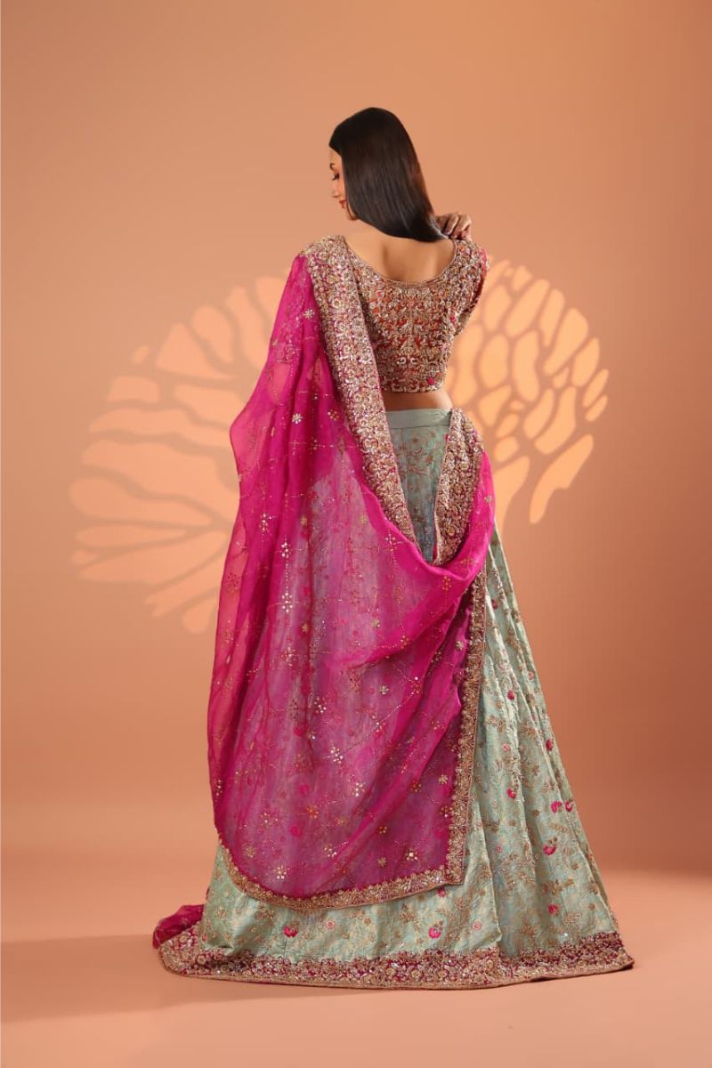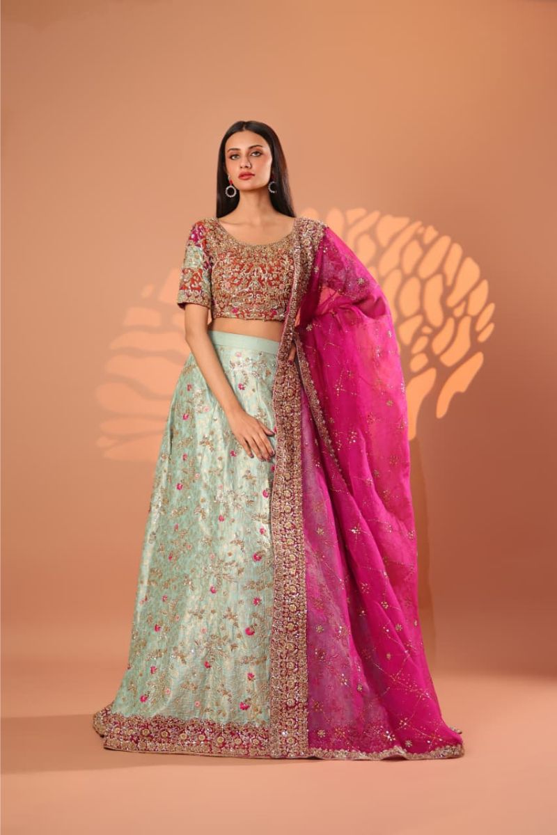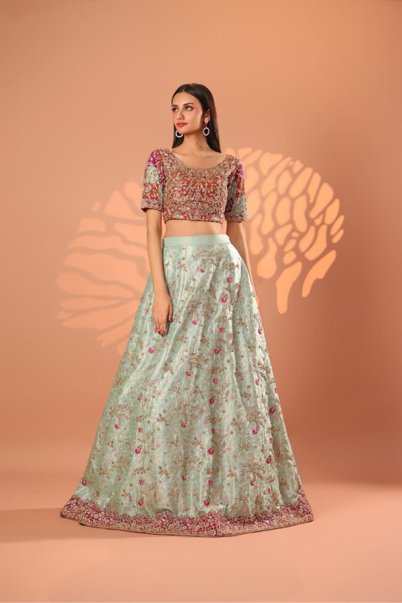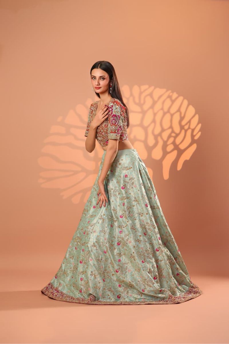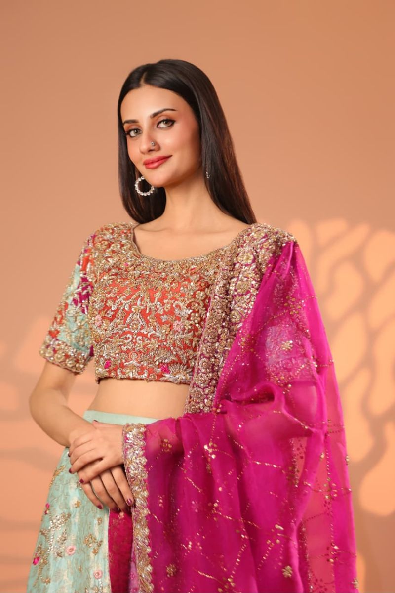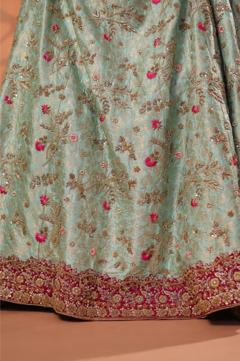 The Celeste Blush Bridal Gown is an exquisite vision of modern romance and timeless couture. Designed in a soft blush-champagne hue, this full-length gown is richly adorned with intricate silver-gold embroidery, delicate blush accents, and fine sequin detailing that creates a luminous, ethereal effect. The structured bodice flows seamlessly into a voluminous flared skirt, showcasing ornate motifs and impeccable craftsmanship throughout. Finished with sheer embellished sleeves and a gracefully detailed hem, Celeste Blush is perfect for nikkah ceremonies, receptions, or elegant bridal celebrations. Refined, graceful, and unforgettable this gown embodies true bridal luxury.
