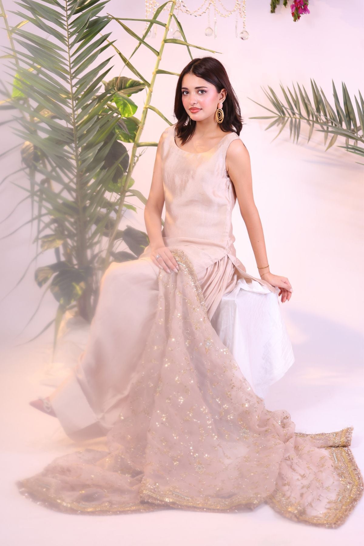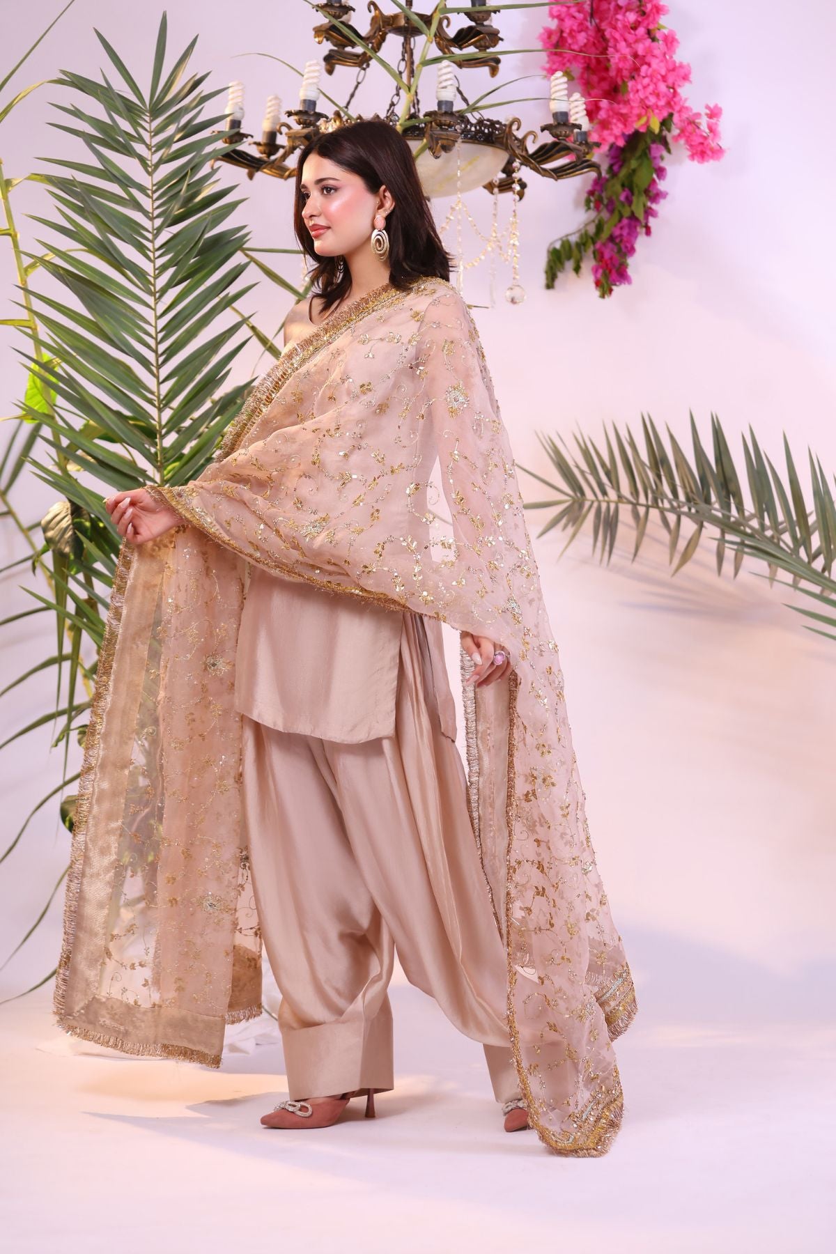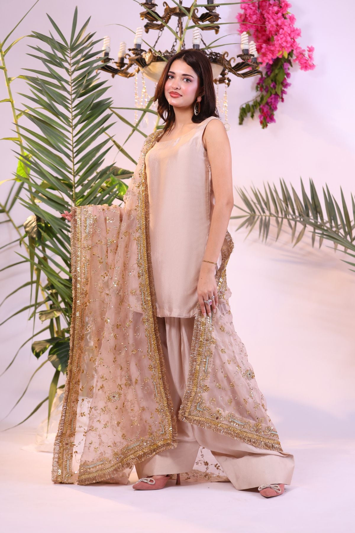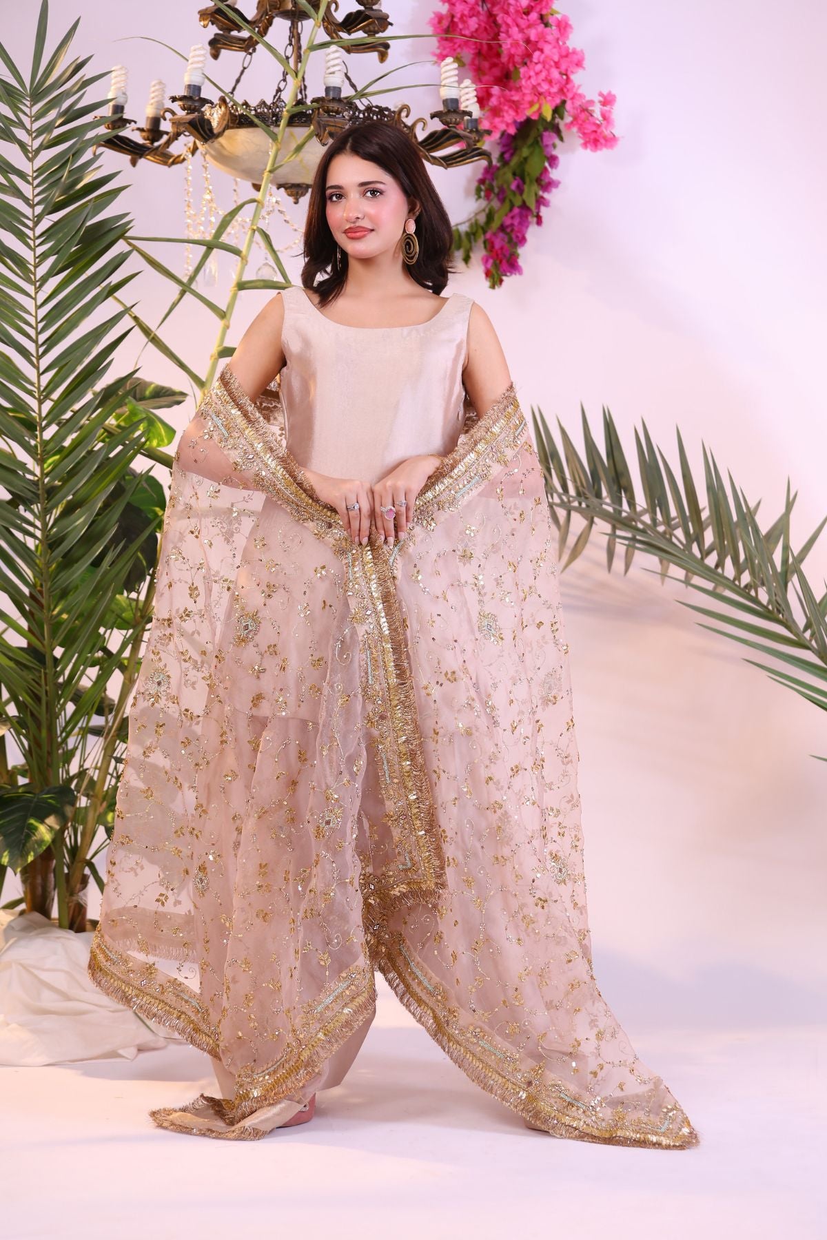 This elegant outfit showcases a soft peach hue, blending subtle sophistication with natural charm. The sleeveless tunic and flowing trousers are complemented by a delicate dupatta adorned with intricate gold and silver embroidery. Paired with statement earrings and a ring, this ensemble is ideal for a chic, understated look suitable for various occasions.