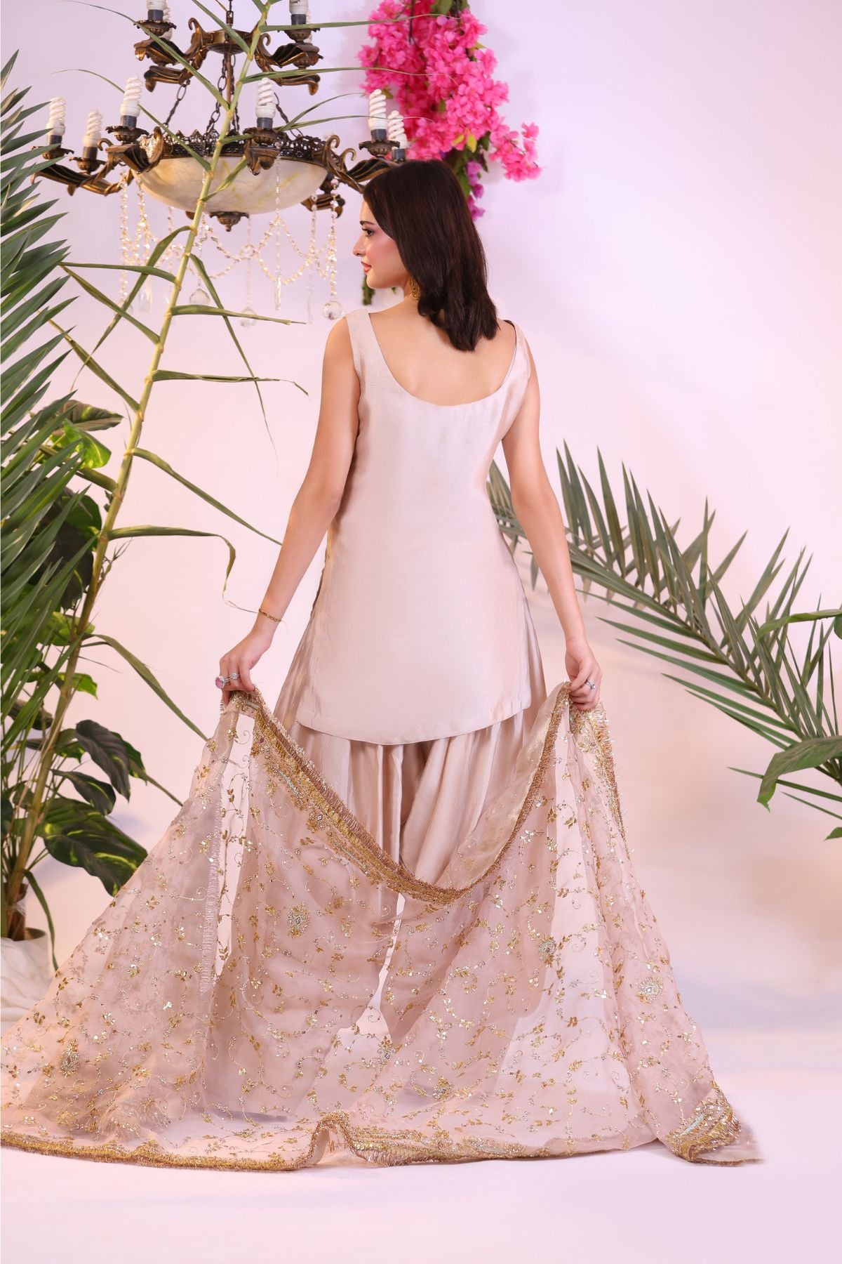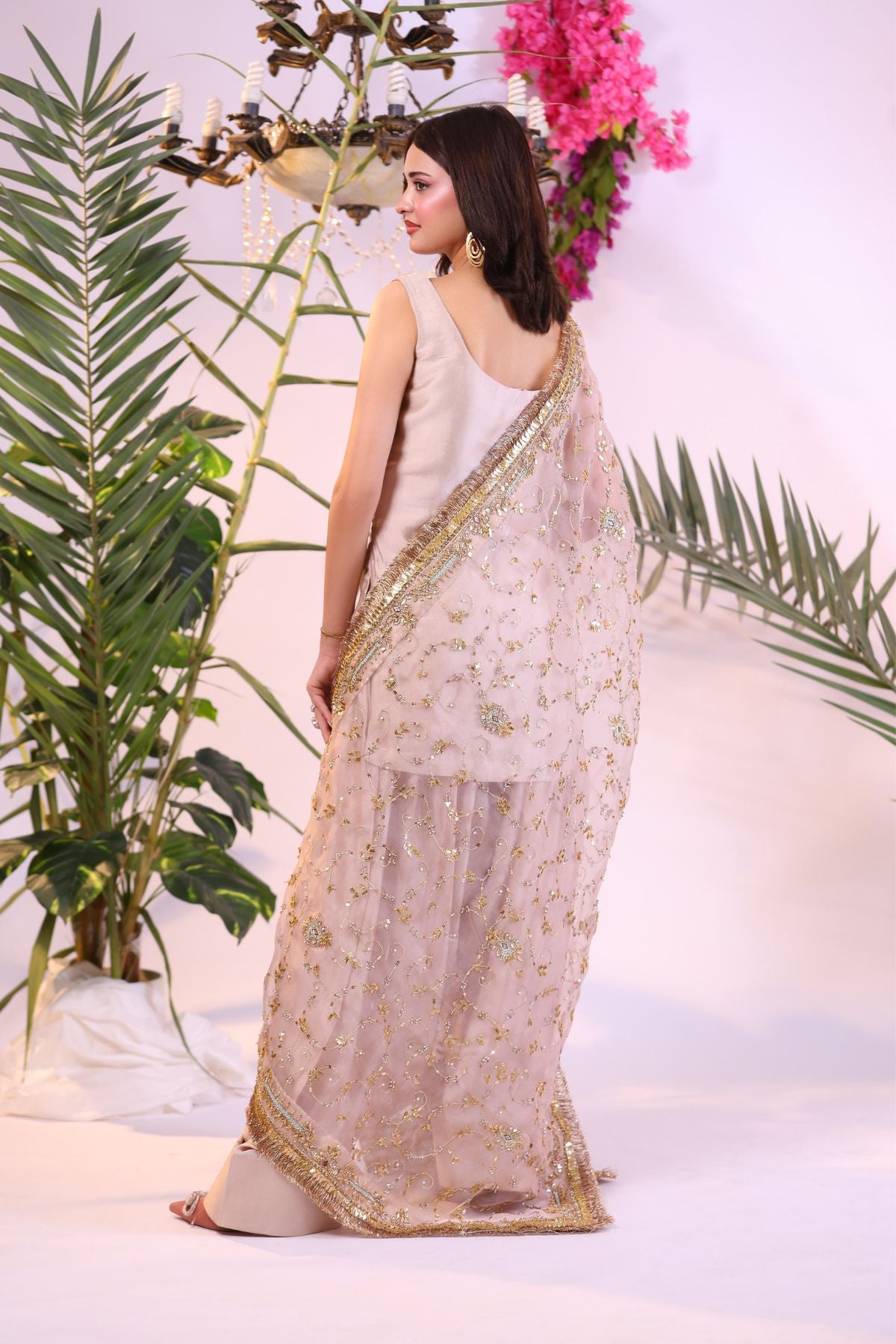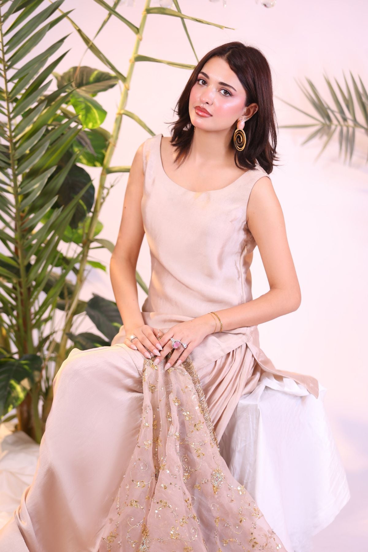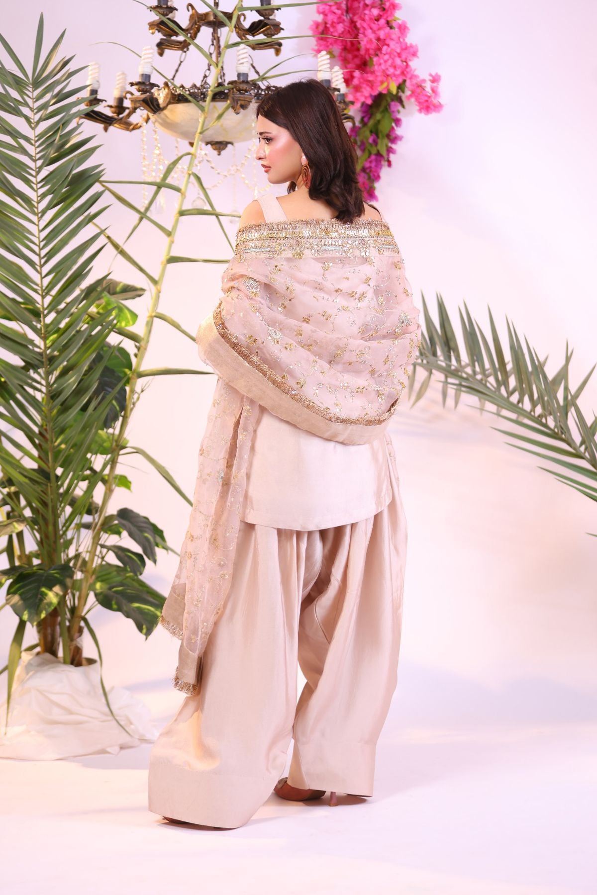 This elegant outfit showcases a soft peach hue, blending subtle sophistication with natural charm. The sleeveless tunic and flowing trousers are complemented by a delicate dupatta adorned with intricate gold and silver embroidery. Paired with statement earrings and a ring, this ensemble is ideal for a chic, understated look suitable for various occasions.