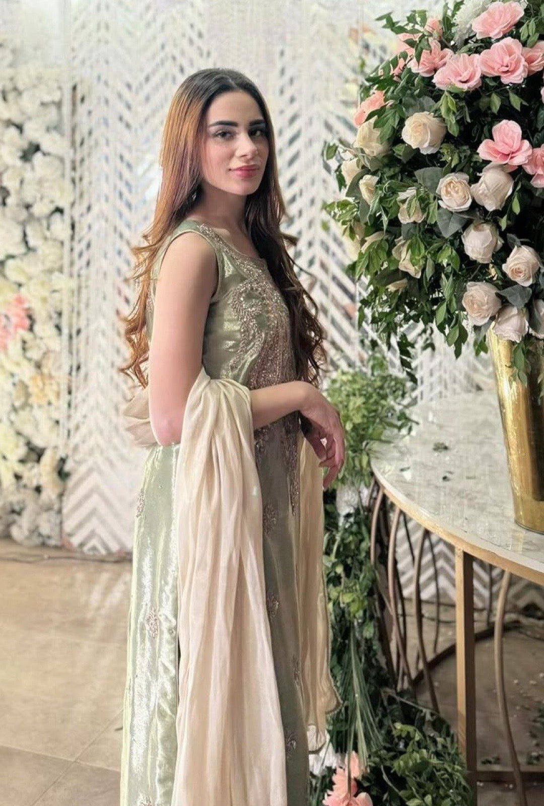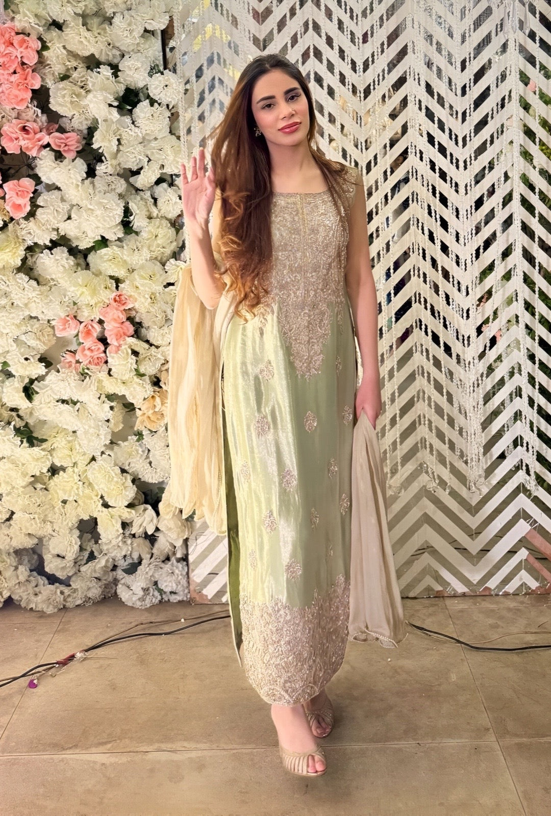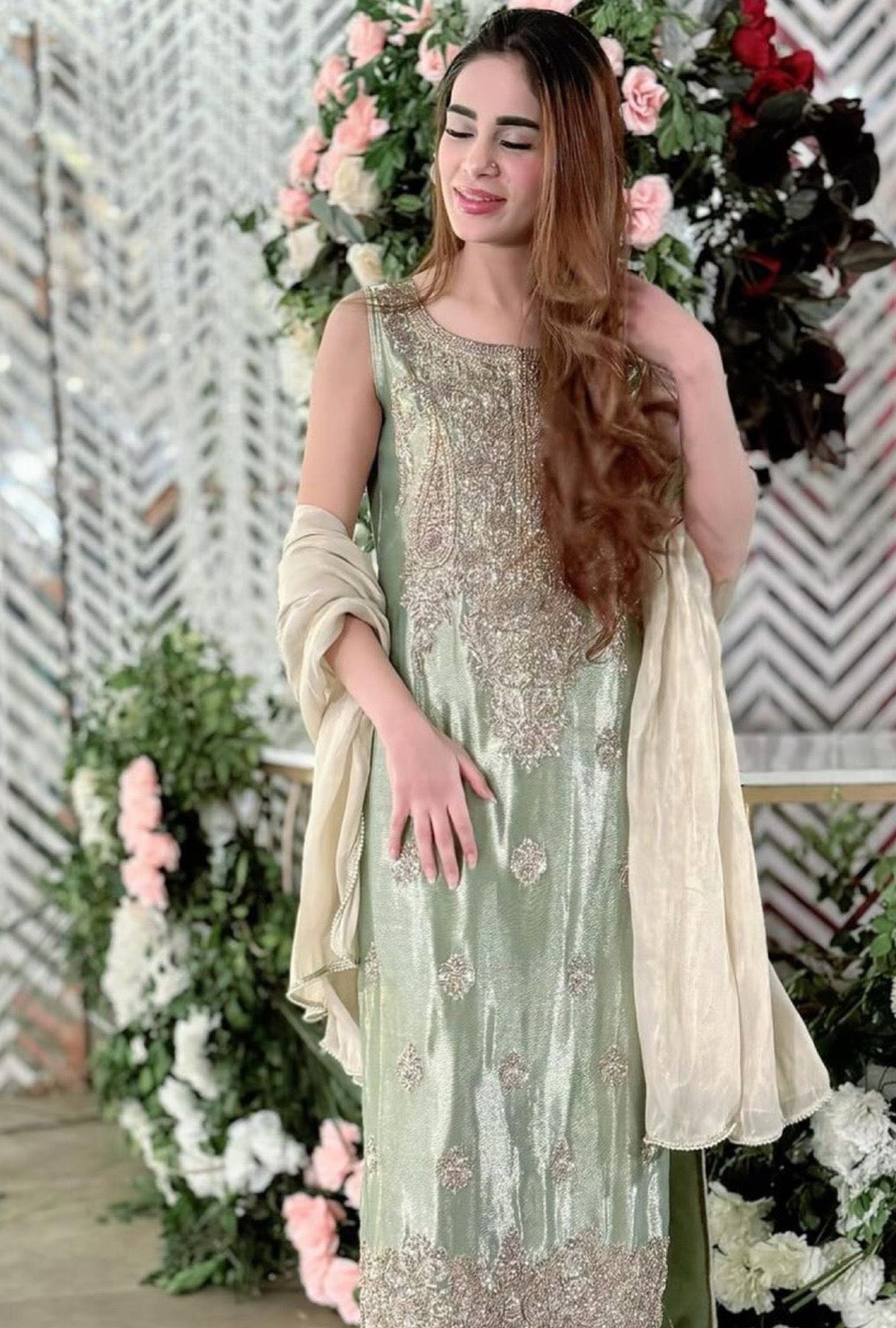 Experience the epitome of luxury with our Everleaf Tissue Silk. Hand-embellished with delicate details of kora and dabka, this masterpiece exudes an air of elegance and sophistication. Crafted with meticulous precision and attention to detail, each piece is a testament to the artistry of our skilled artisans. Indulge yourself in the luxurious feel of tissue silk against your skin and make a statement of timeless grace. Elevate your style with the Everleaf, a true embodiment of exquisite craftsmanship.