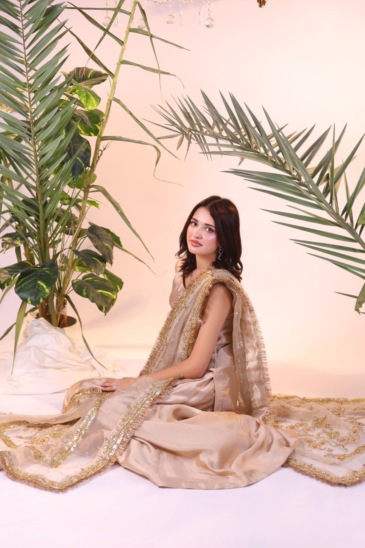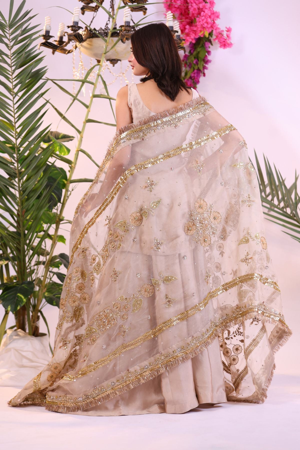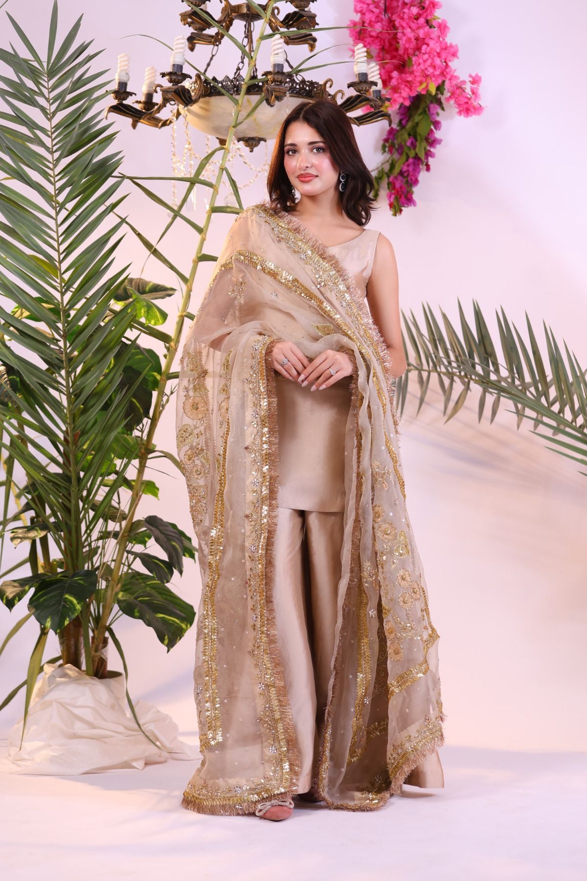 Step into regal charm with Gilded Blossom, a luxurious formal ensemble that radiates grace and sophistication. This sleeveless set is crafted in a soft champagne-beige tone, adorned with a diaphanous net dupatta lavishly embroidered in golden threadwork, floral motifs, and shimmering sequins.