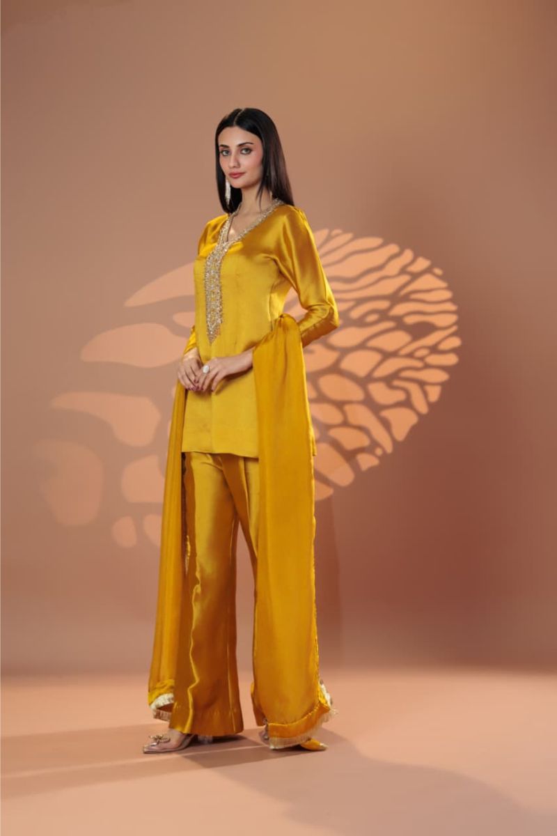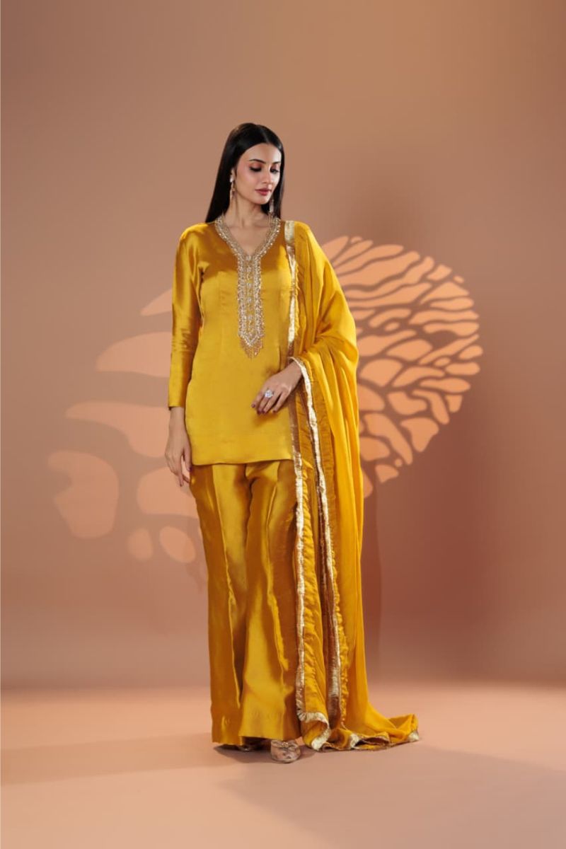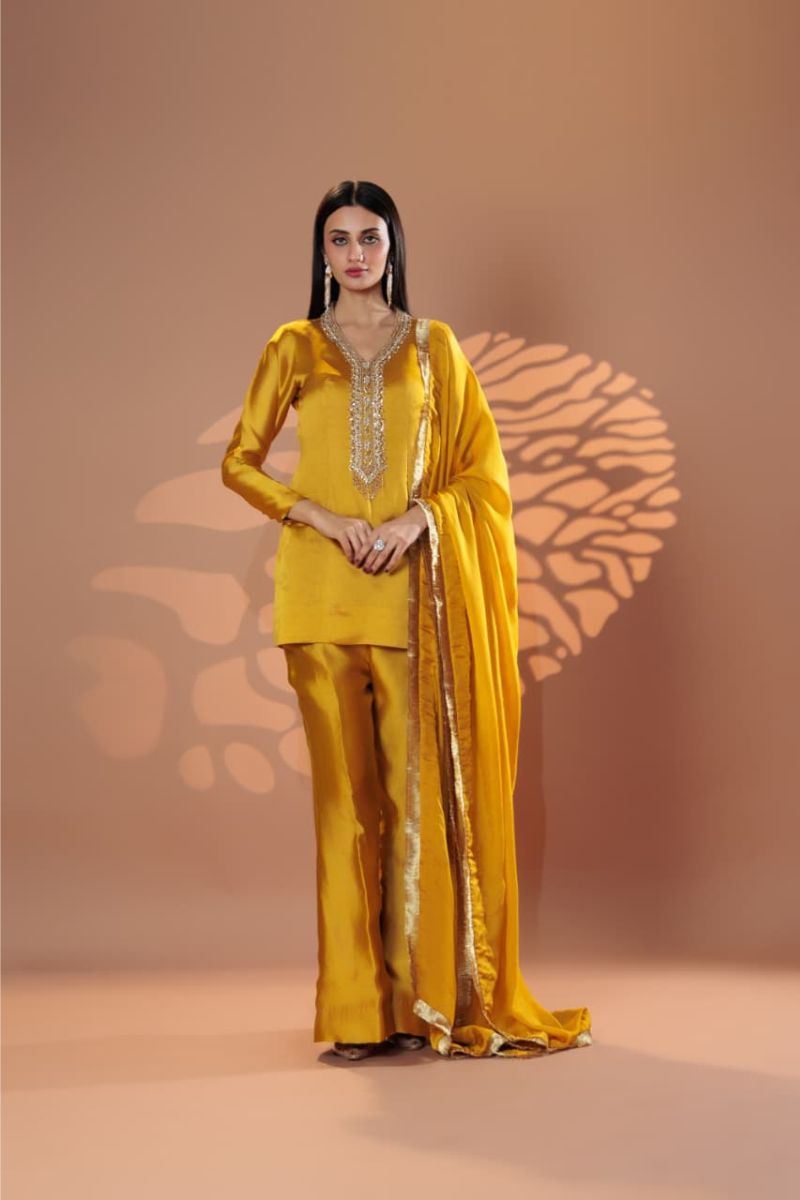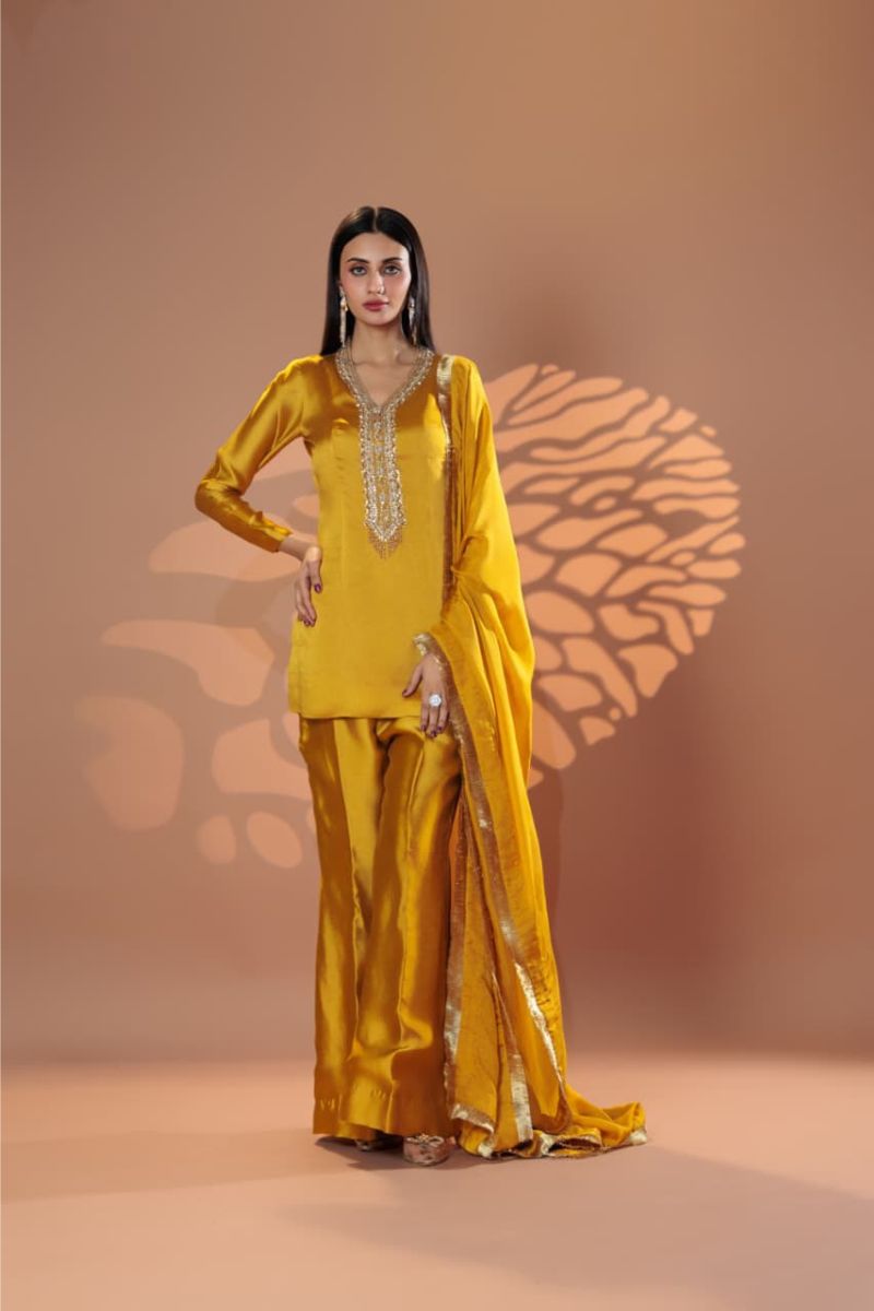 Imperial Mustard embodies grandeur with effortless sophistication. Rendered in a rich mustard-gold hue, this ensemble radiates warmth and royalty in equal measure. The lustrous silk fabric enhances its depth of color, while the intricately embellished neckline and delicately bordered dupatta add a refined, celebratory finish. Designed for festive gatherings, wedding festivities, and statement evenings, Imperial Mustard is a tribute to timeless elegance with a commanding presence.