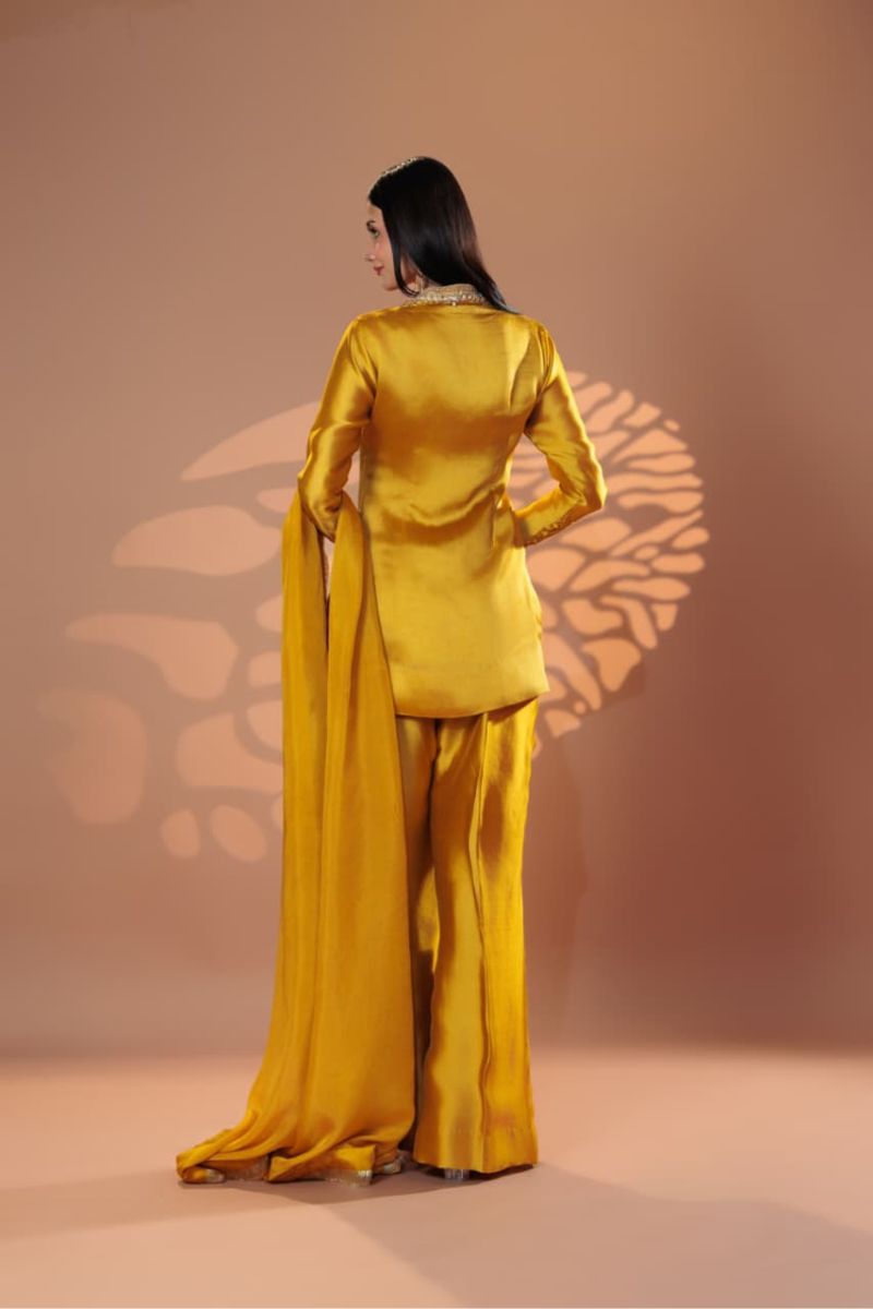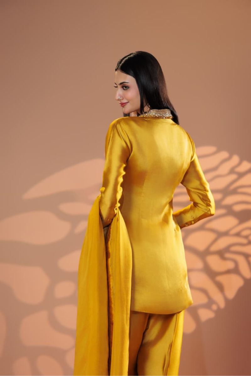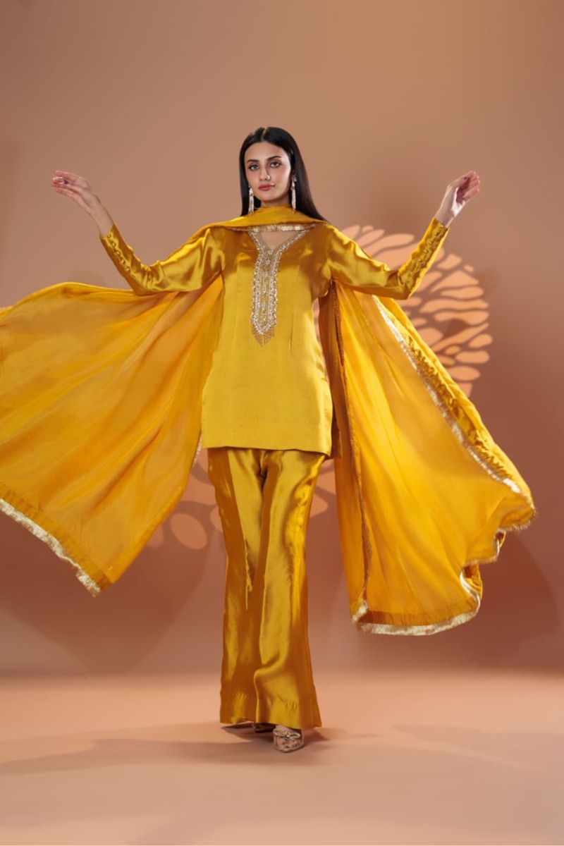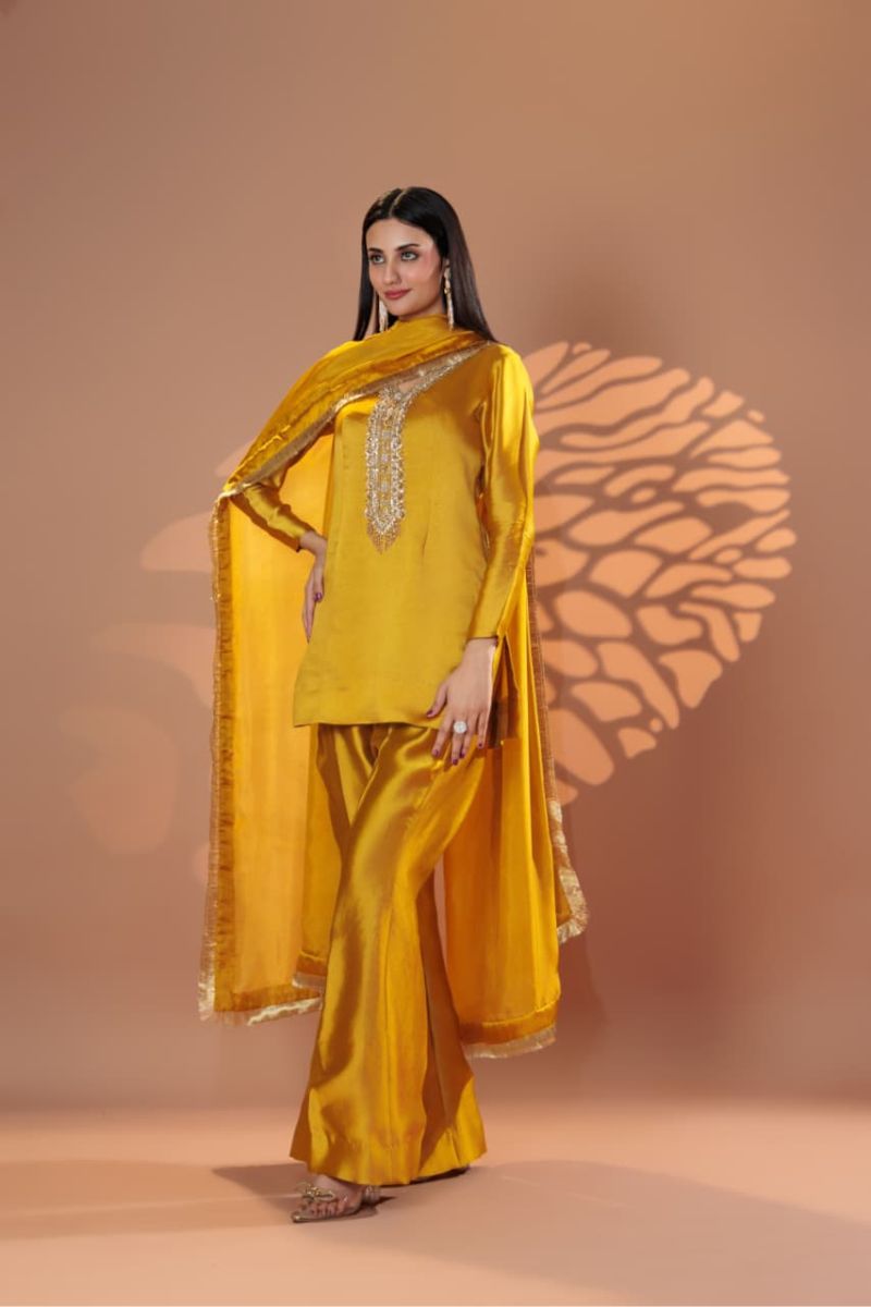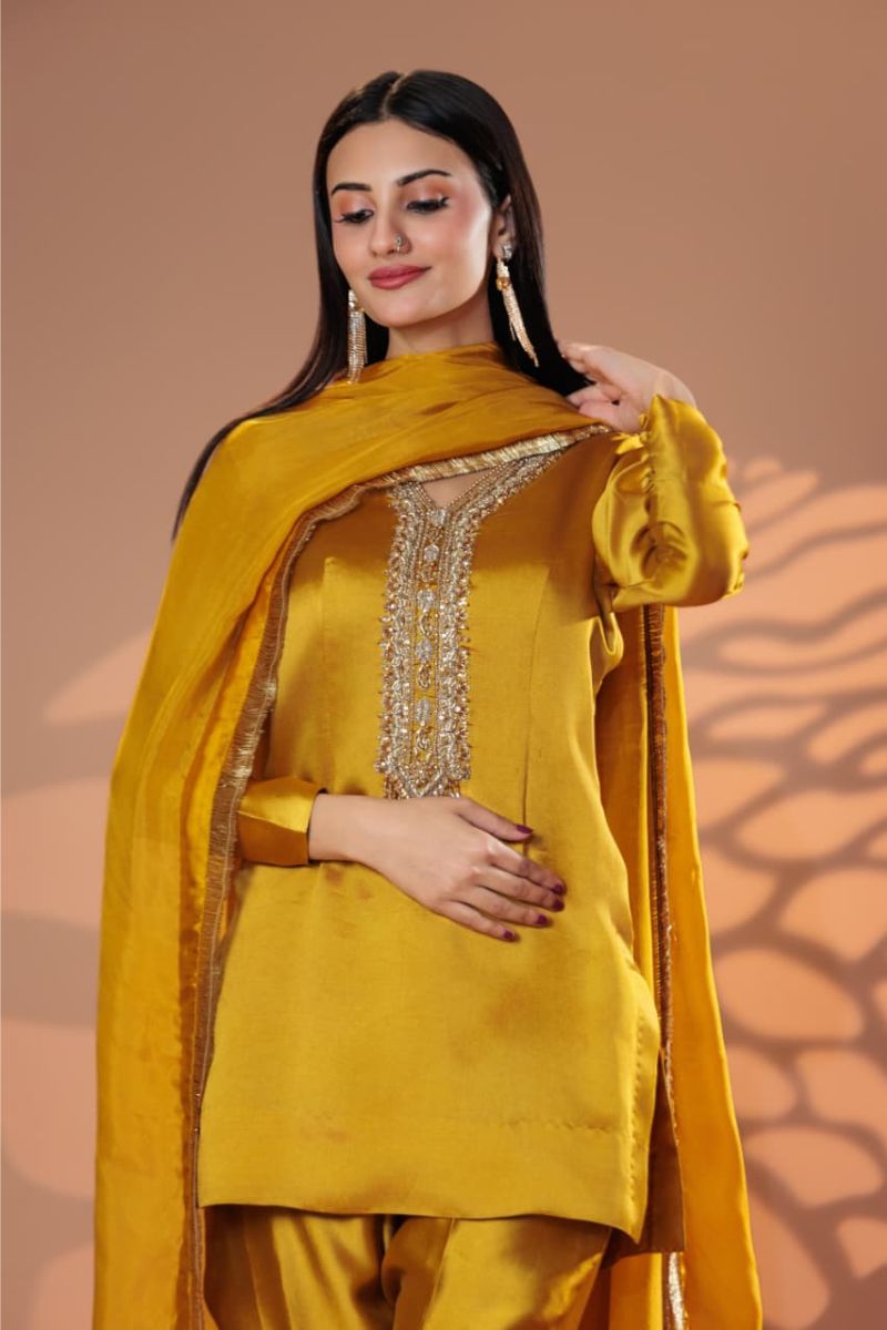 Imperial Mustard embodies grandeur with effortless sophistication. Rendered in a rich mustard-gold hue, this ensemble radiates warmth and royalty in equal measure. The lustrous silk fabric enhances its depth of color, while the intricately embellished neckline and delicately bordered dupatta add a refined, celebratory finish. Designed for festive gatherings, wedding festivities, and statement evenings, Imperial Mustard is a tribute to timeless elegance with a commanding presence.