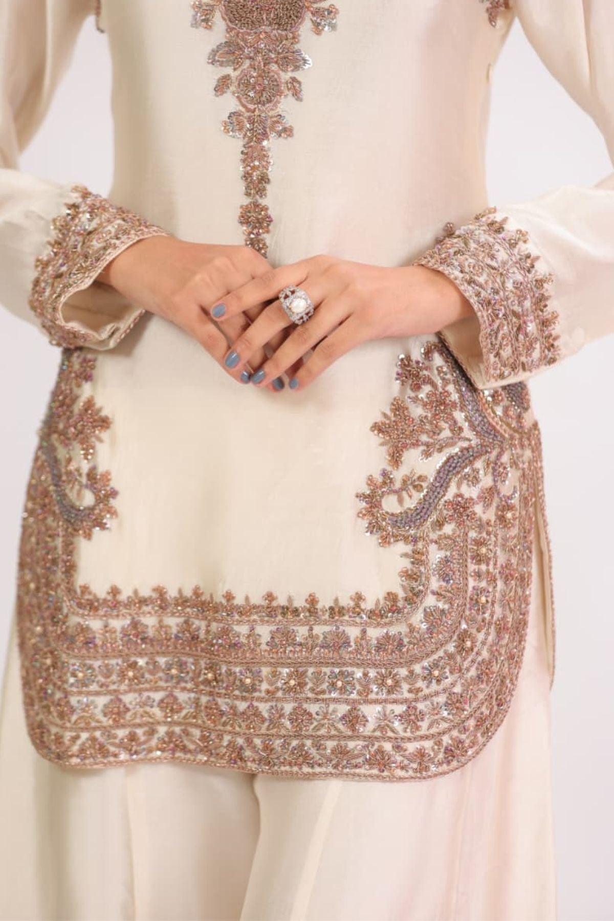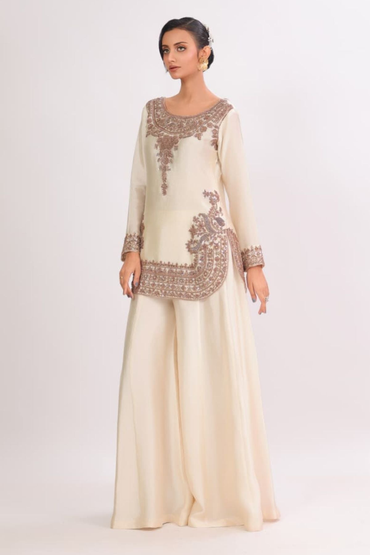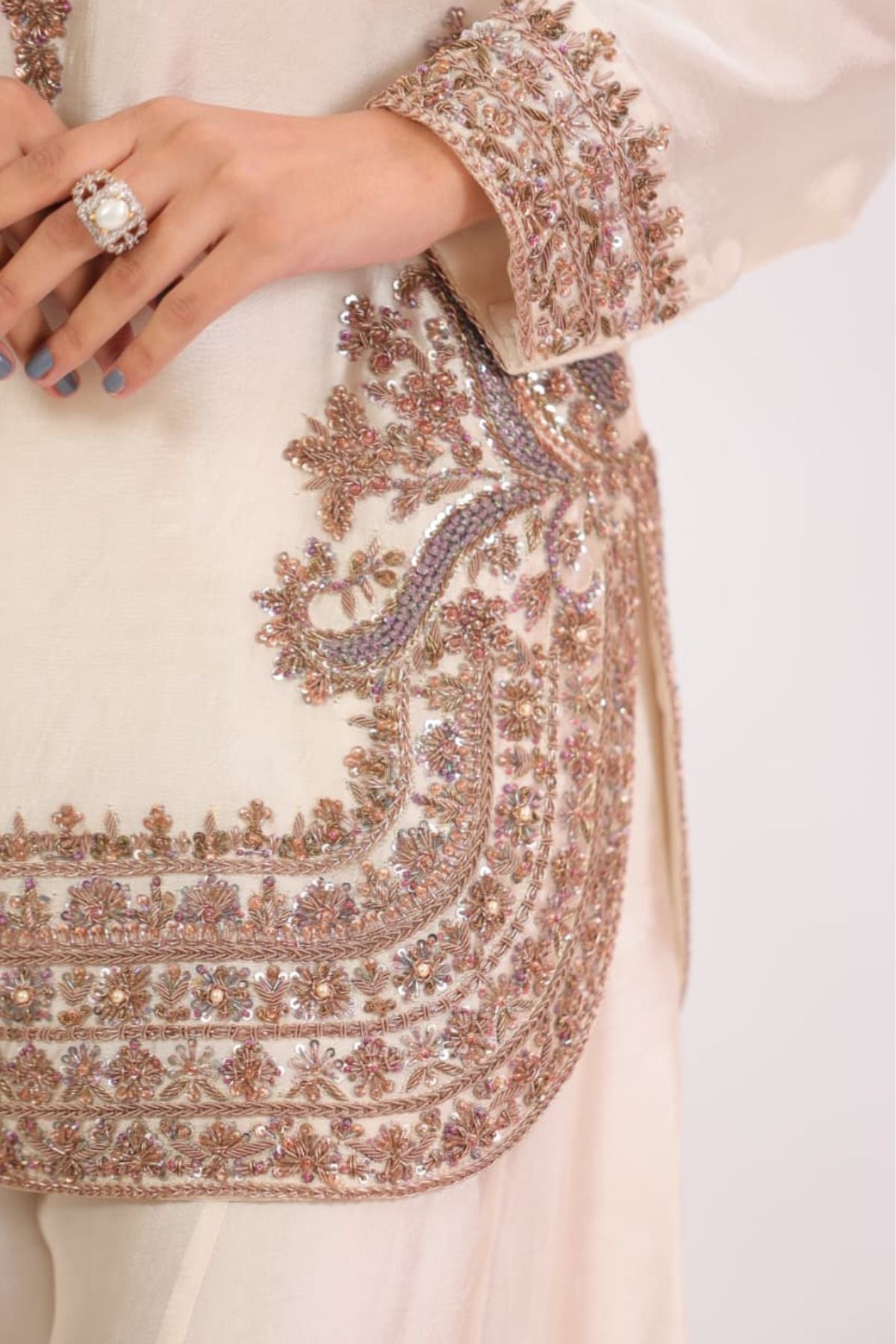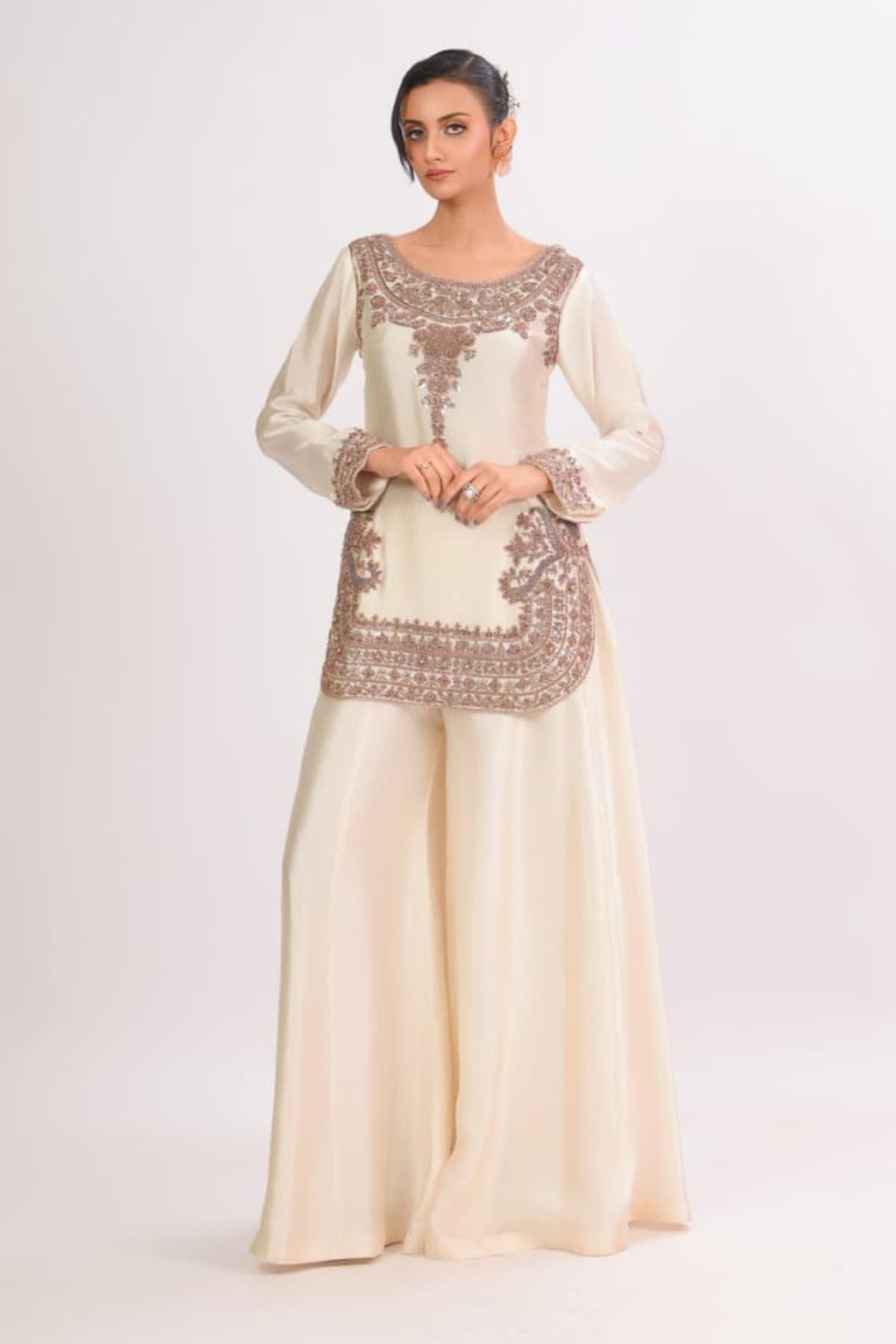 The Ivora Cream Embroidered Set brings a soft, timeless charm with its luxurious cream base and intricate rose-gold threadwork. The top features detailed hand-style embroidery along the neckline, sleeves, and hem, creating a graceful, structured silhouette. Paired with wide, flowy trousers, this ensemble delivers both sophistication and comfort. Perfect for formal gatherings, daytime events, or festive occasions, its subtle shine and refined craftsmanship make it an effortless statement piece.