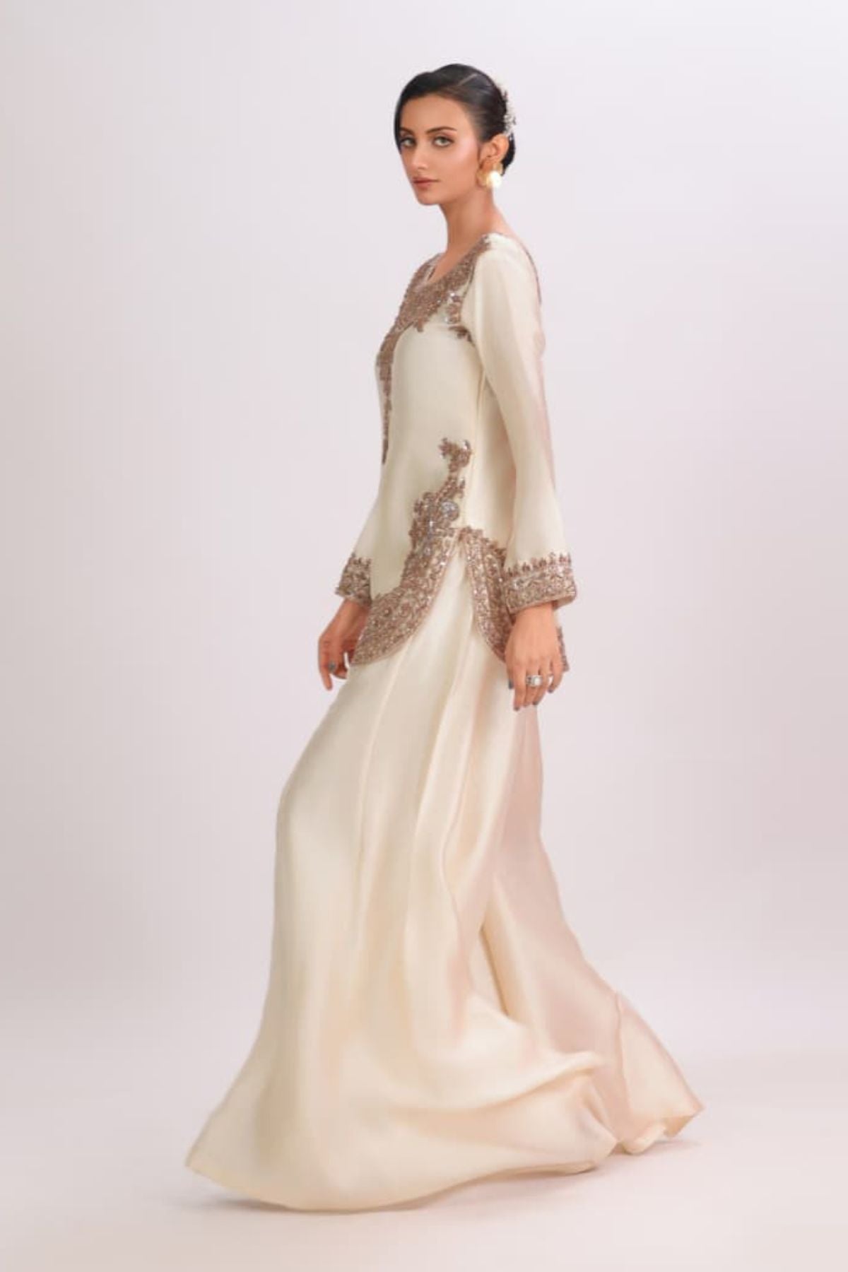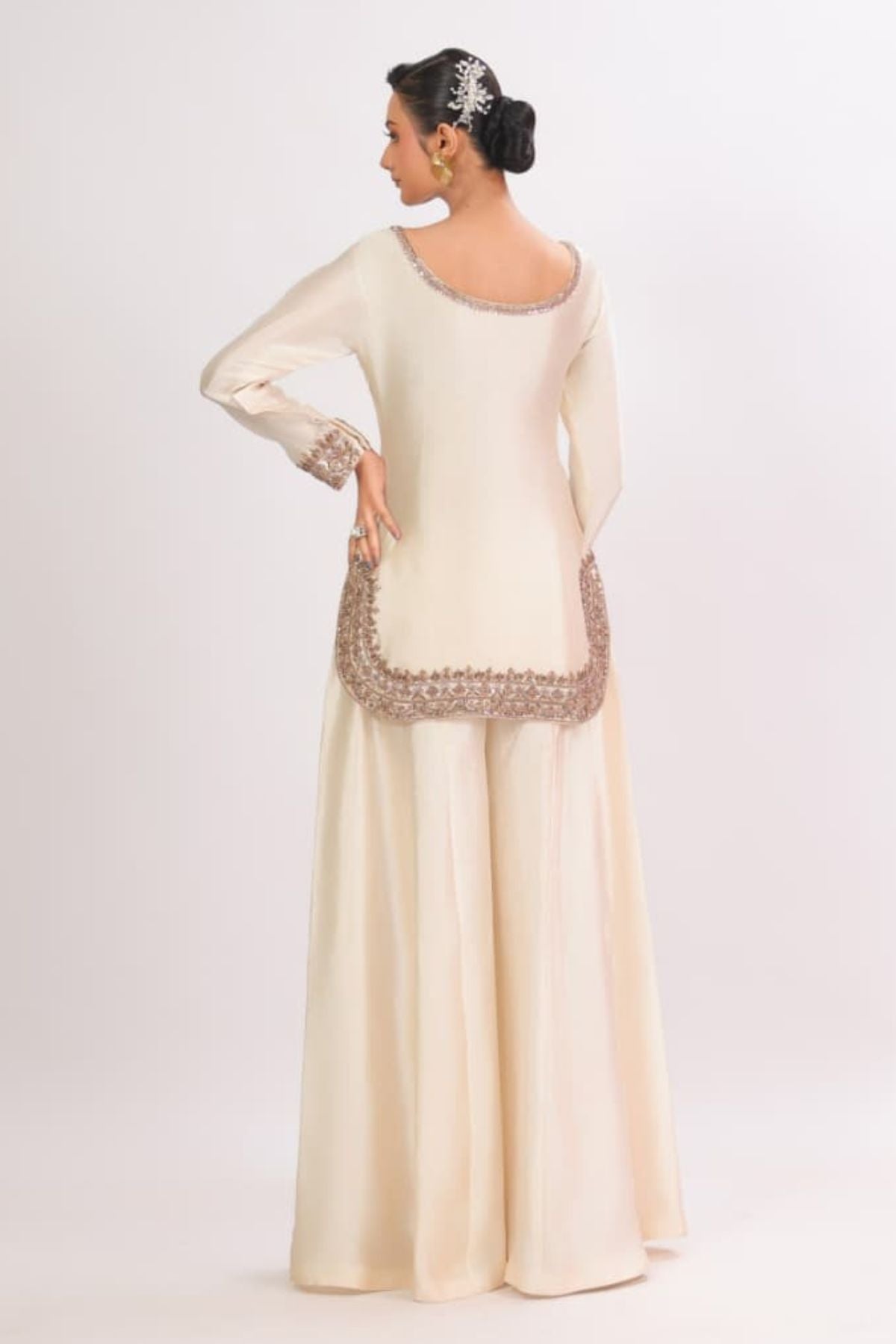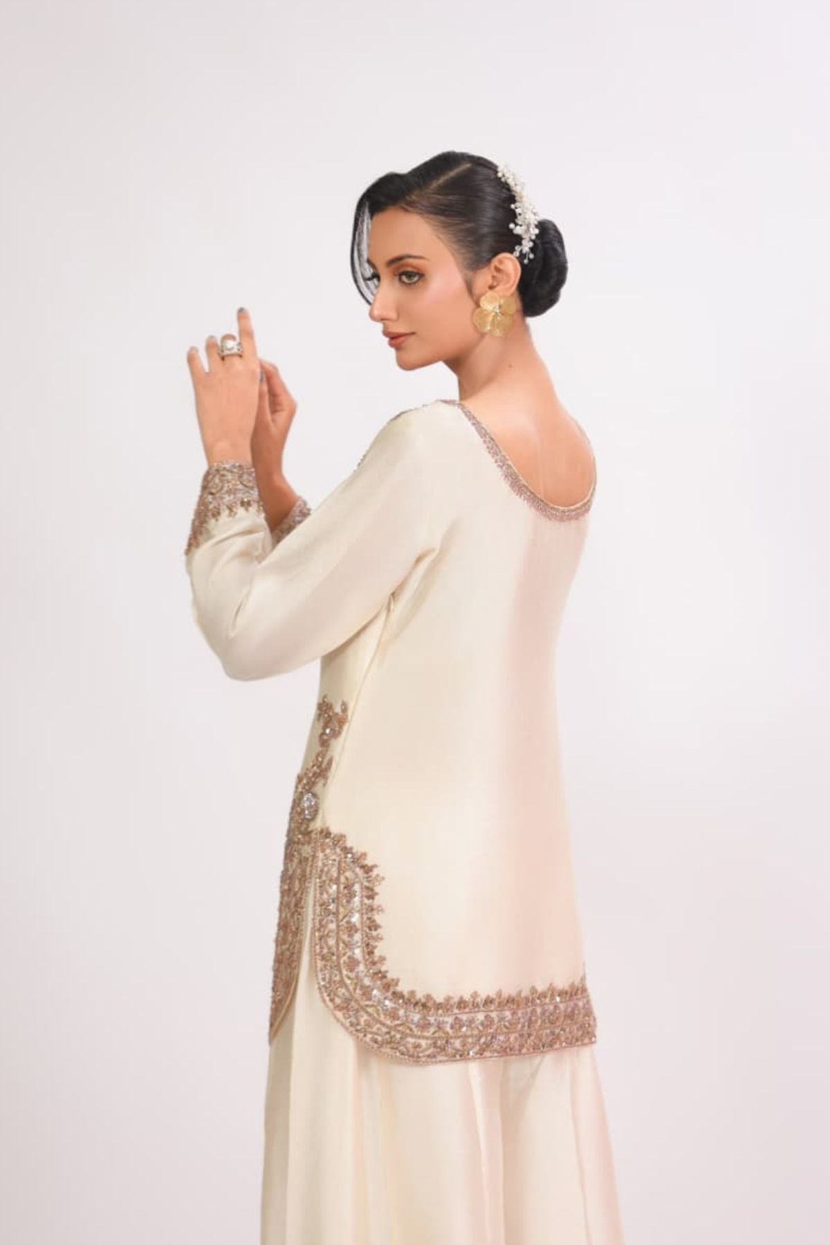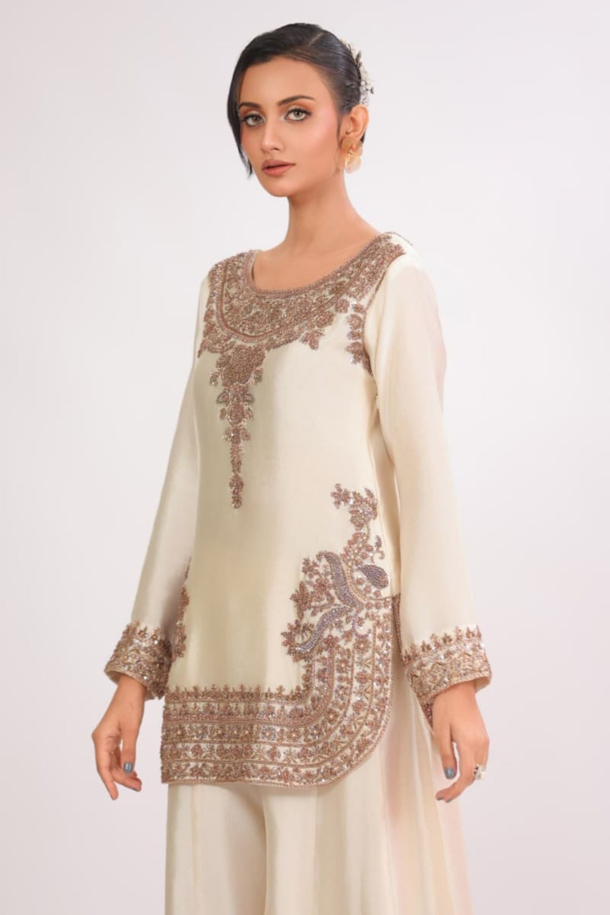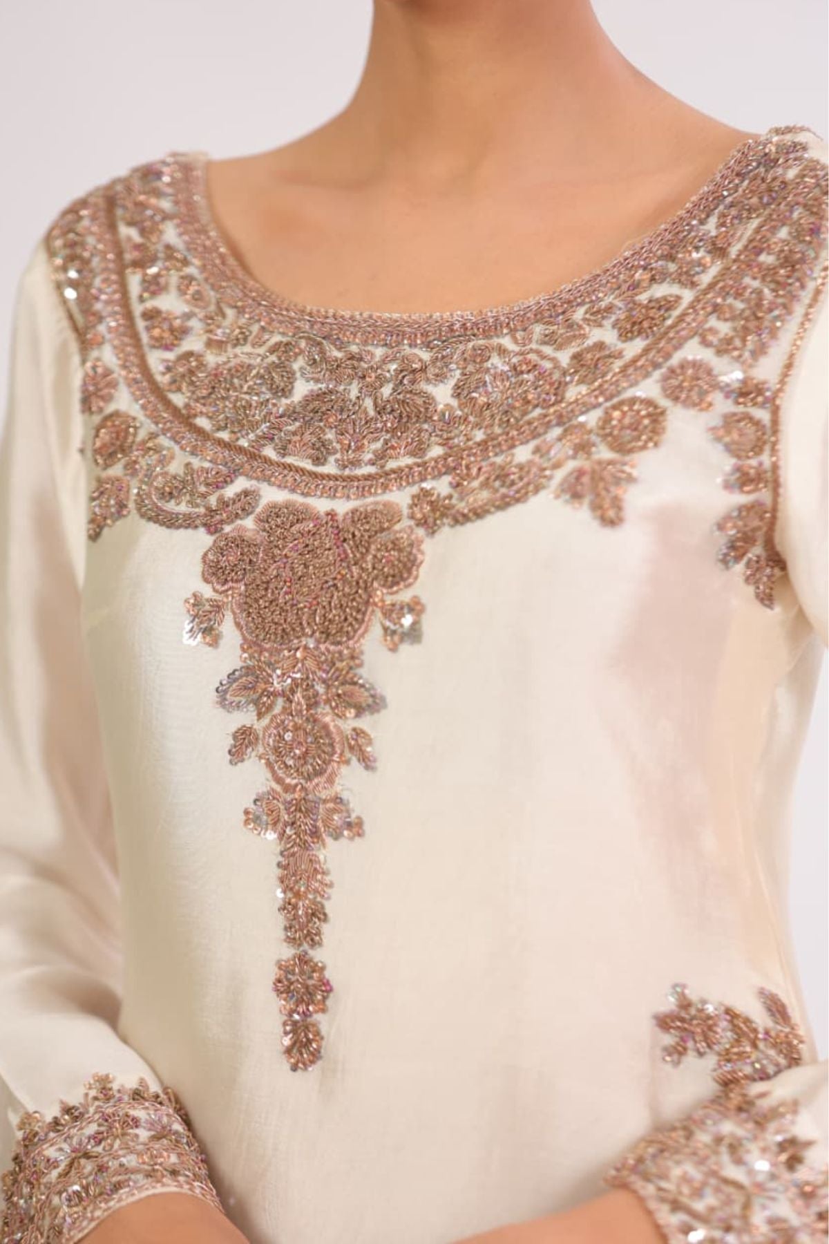 The Ivora Cream Embroidered Set brings a soft, timeless charm with its luxurious cream base and intricate rose-gold threadwork. The top features detailed hand-style embroidery along the neckline, sleeves, and hem, creating a graceful, structured silhouette. Paired with wide, flowy trousers, this ensemble delivers both sophistication and comfort. Perfect for formal gatherings, daytime events, or festive occasions, its subtle shine and refined craftsmanship make it an effortless statement piece.