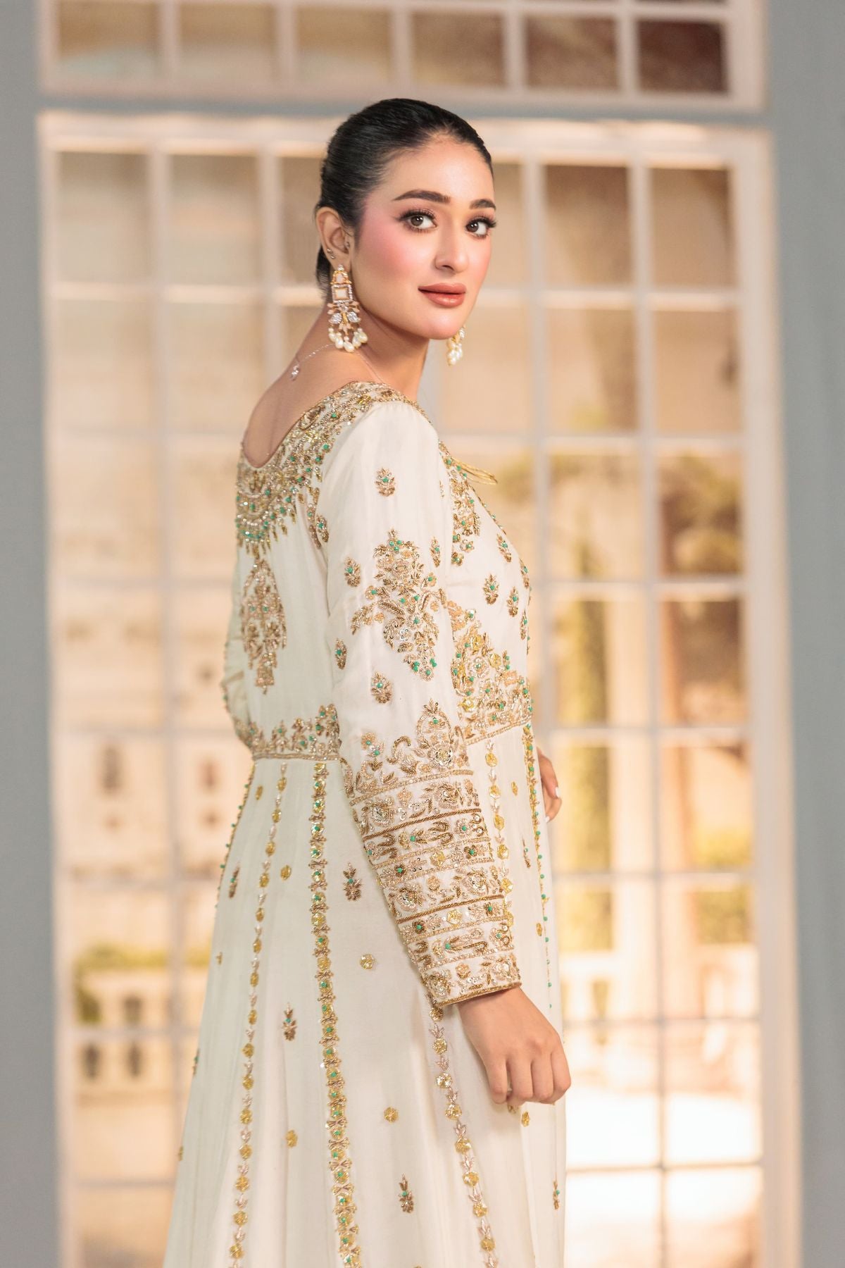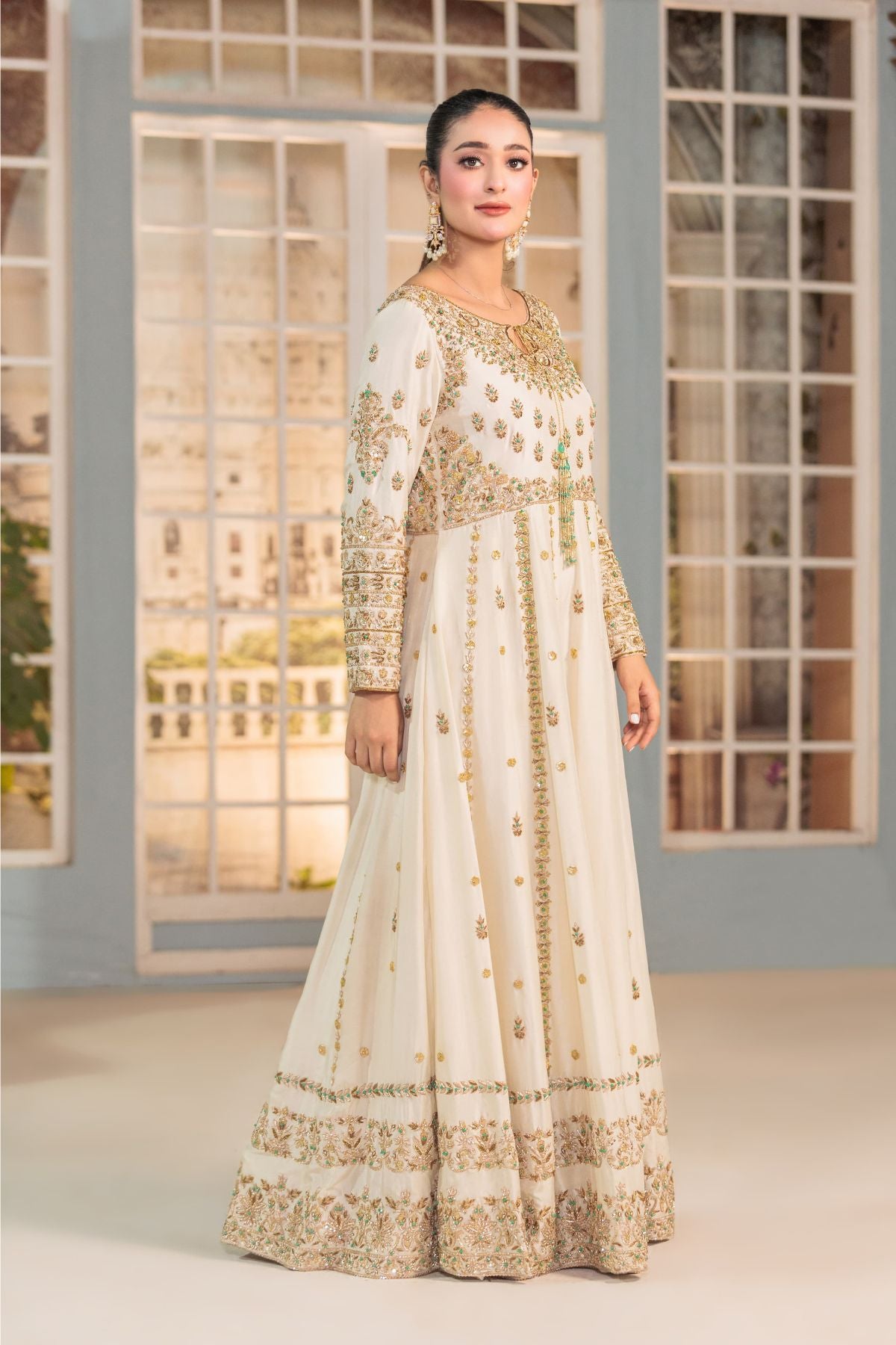 Embrace royal elegance with Ivory Majesty, a timeless anarkali crafted in pristine ivory and adorned with intricate golden and pastel embroidery. The heavily embellished neckline, detailed sleeves, and ornate hemline reflect refined artistry, while the flowing silhouette exudes grace and charm. This regal piece is perfect for weddings, festive occasions, or any evening that calls for grandeur.