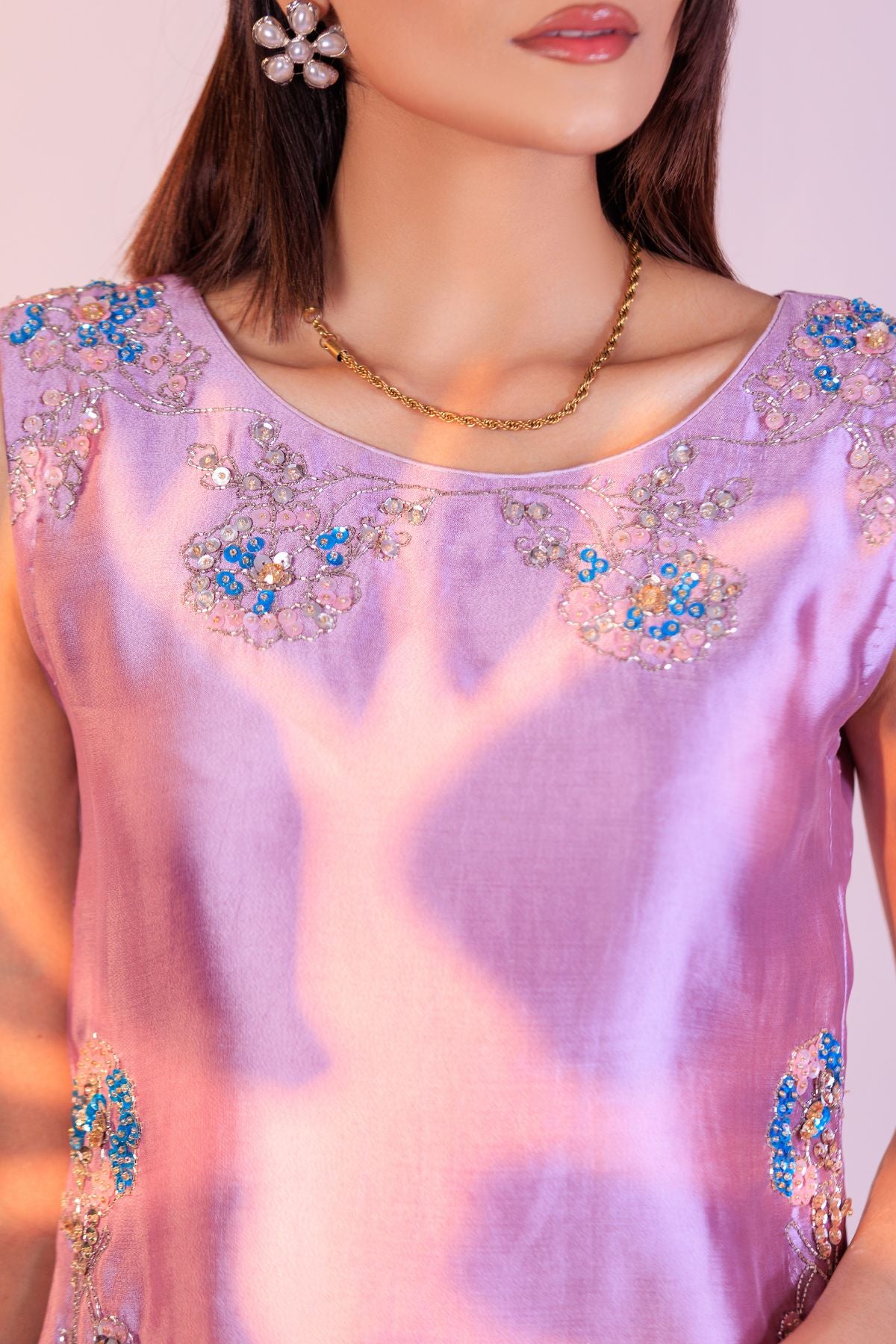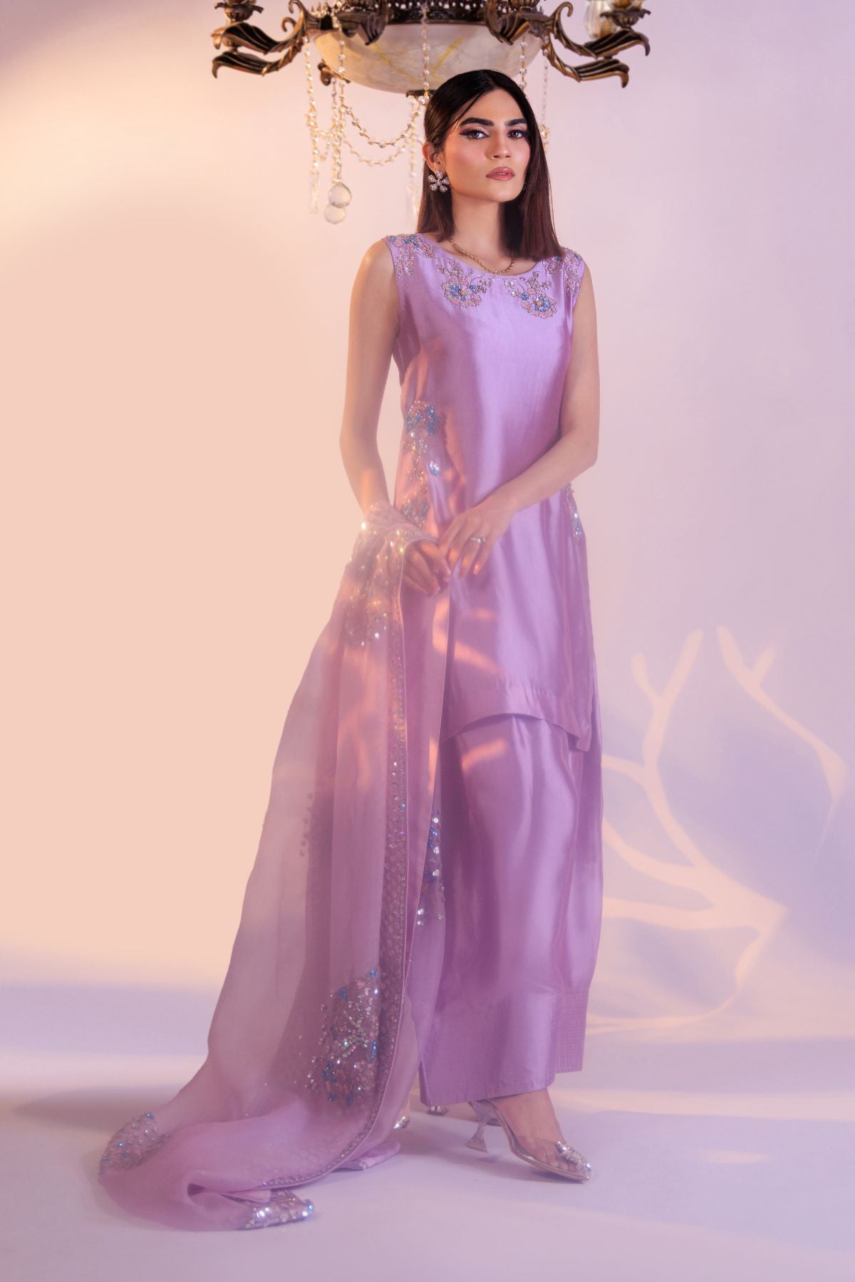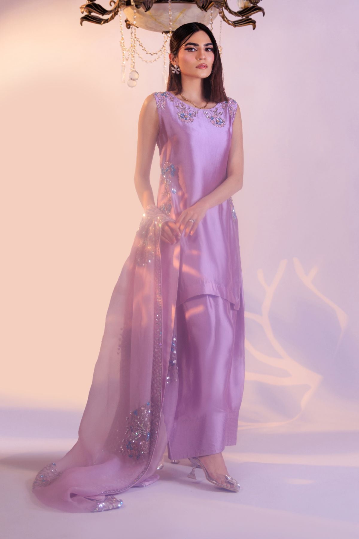 Drape yourself in grace with this ethereal lilac three-piece formal outfit, designed for those who adore understated glamour. The sleeveless kameez is tailored from a lustrous silk base, accented with delicate floral hand-embellishments featuring shimmering sequins and pastel beadwork across the neckline and side slits. Paired with wide-leg silk trousers that flow effortlessly, this ensemble brings both structure and softness.