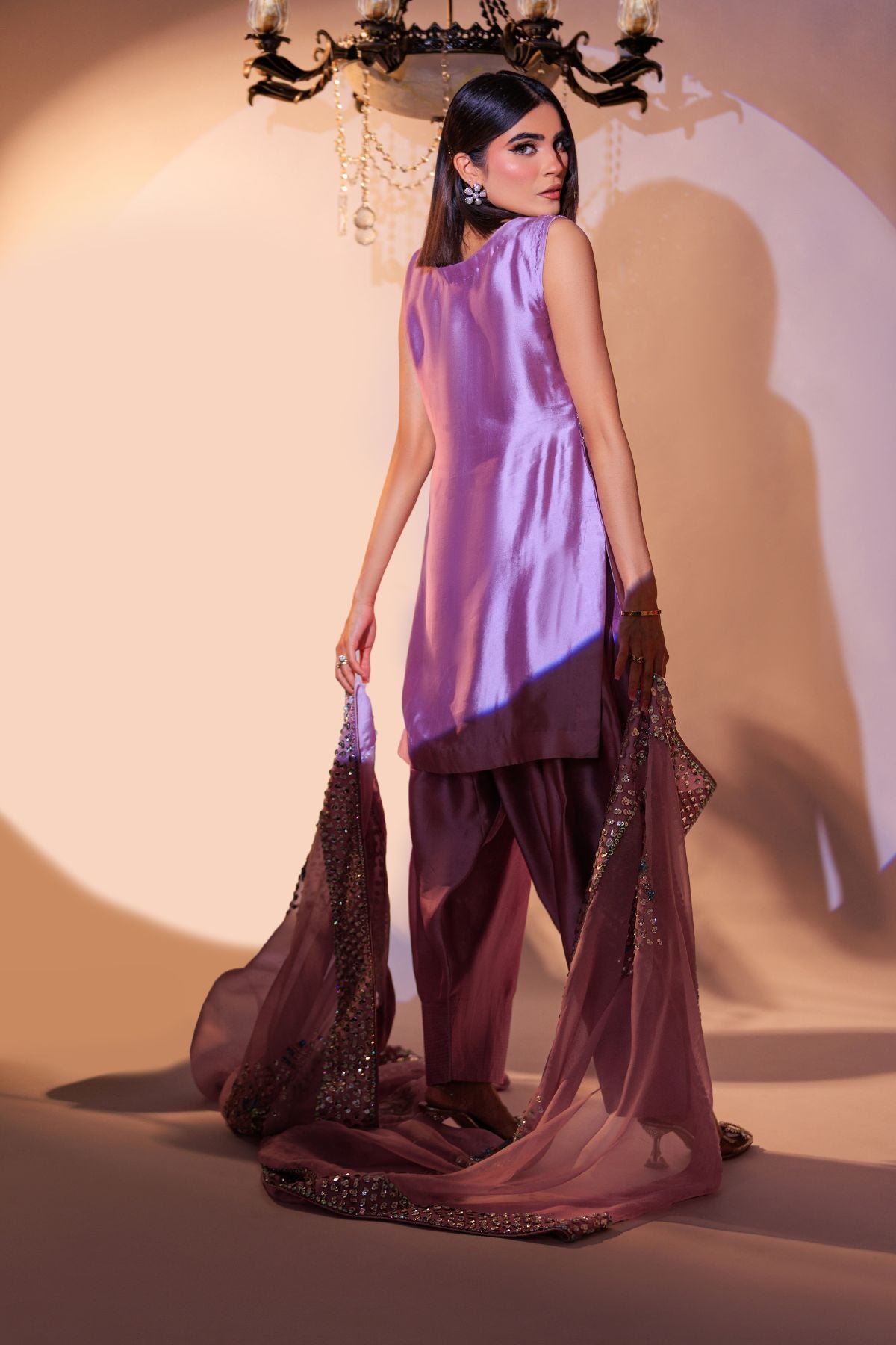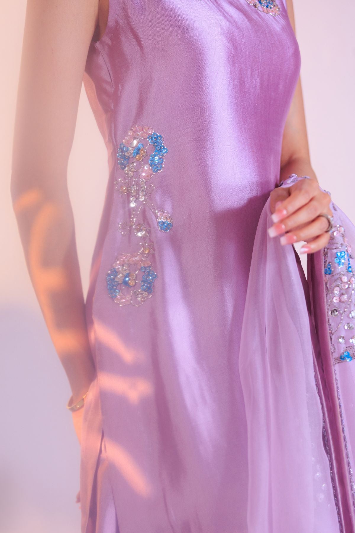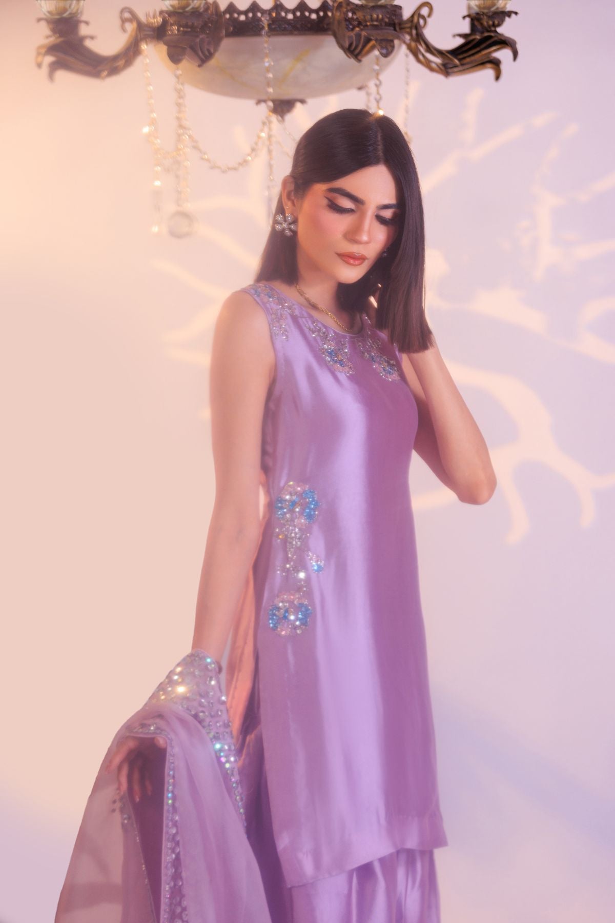 Drape yourself in grace with this ethereal lilac three-piece formal outfit, designed for those who adore understated glamour. The sleeveless kameez is tailored from a lustrous silk base, accented with delicate floral hand-embellishments featuring shimmering sequins and pastel beadwork across the neckline and side slits. Paired with wide-leg silk trousers that flow effortlessly, this ensemble brings both structure and softness.