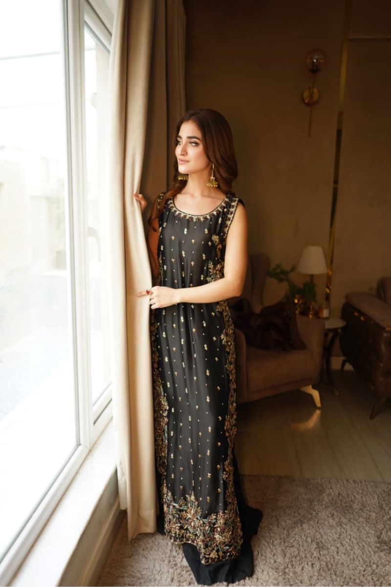 Midnight Eclipse embodies the allure of the night wrapped in timeless sophistication. Crafted in a deep midnight black hue and adorned with intricate gold embellishments along the borders and neckline, this ensemble radiates quiet luxury and celestial charm. The flowing silhouette is enhanced by delicate detailing that catches the light with every movement, creating a graceful yet commanding presence. Perfect for evening gatherings, formal celebrations, and elegant soirées, Midnight Eclipse is where mystery meets refined glamour.