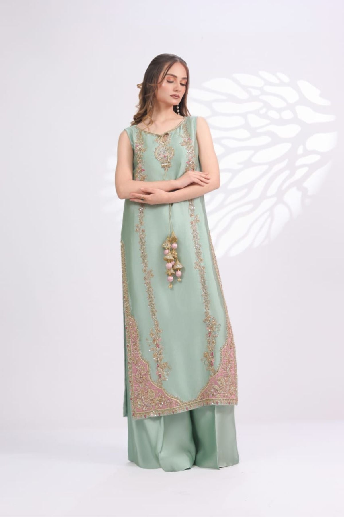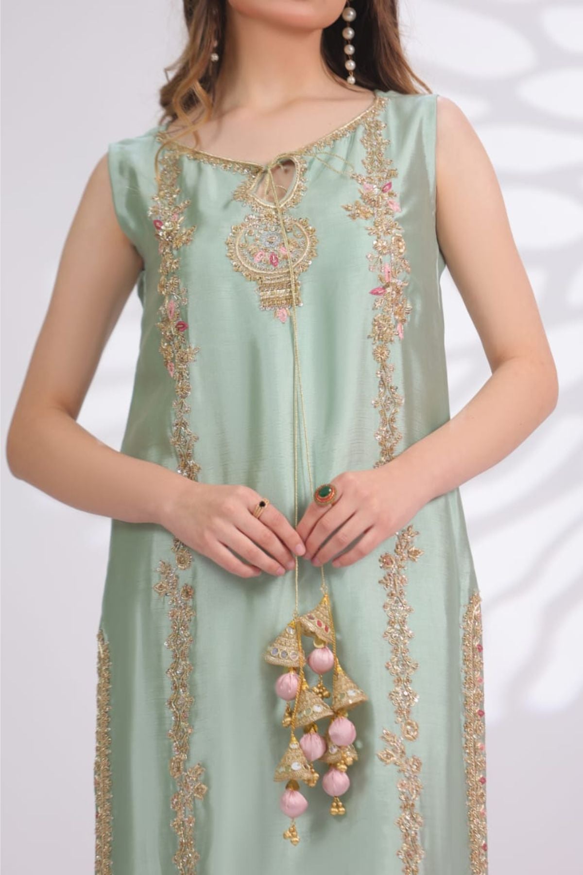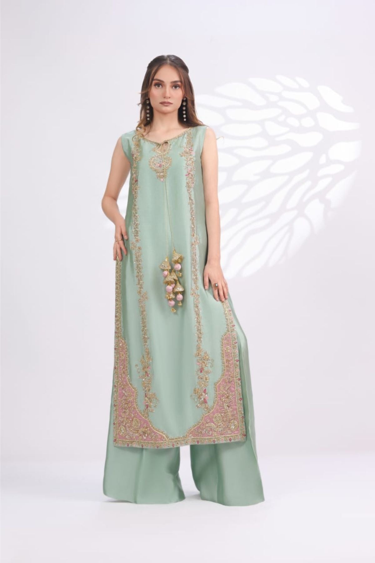 The Mint Pearl Embroidered Set radiates soft elegance with its refreshing mint tone and delicate gold and blush embroidery. The sleeveless long shirt features refined vertical embellishment panels, a beautifully detailed neckline, and decorative tassel accents that add a graceful finishing touch. Intricate embroidery along the hem enhances the silhouette, while the matching wide-leg trousers complete the ensemble with effortless balance. Ideal for daytime festivities, intimate celebrations, or formal gatherings, Mint Pearl offers a serene yet luxurious look with timeless appeal.
