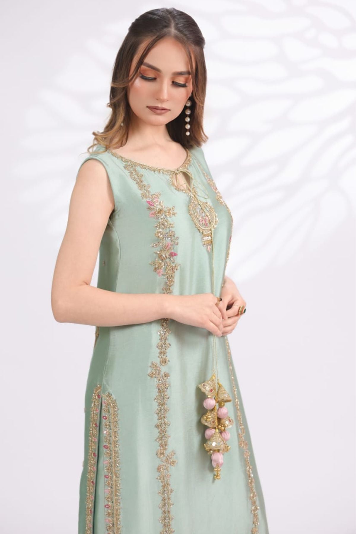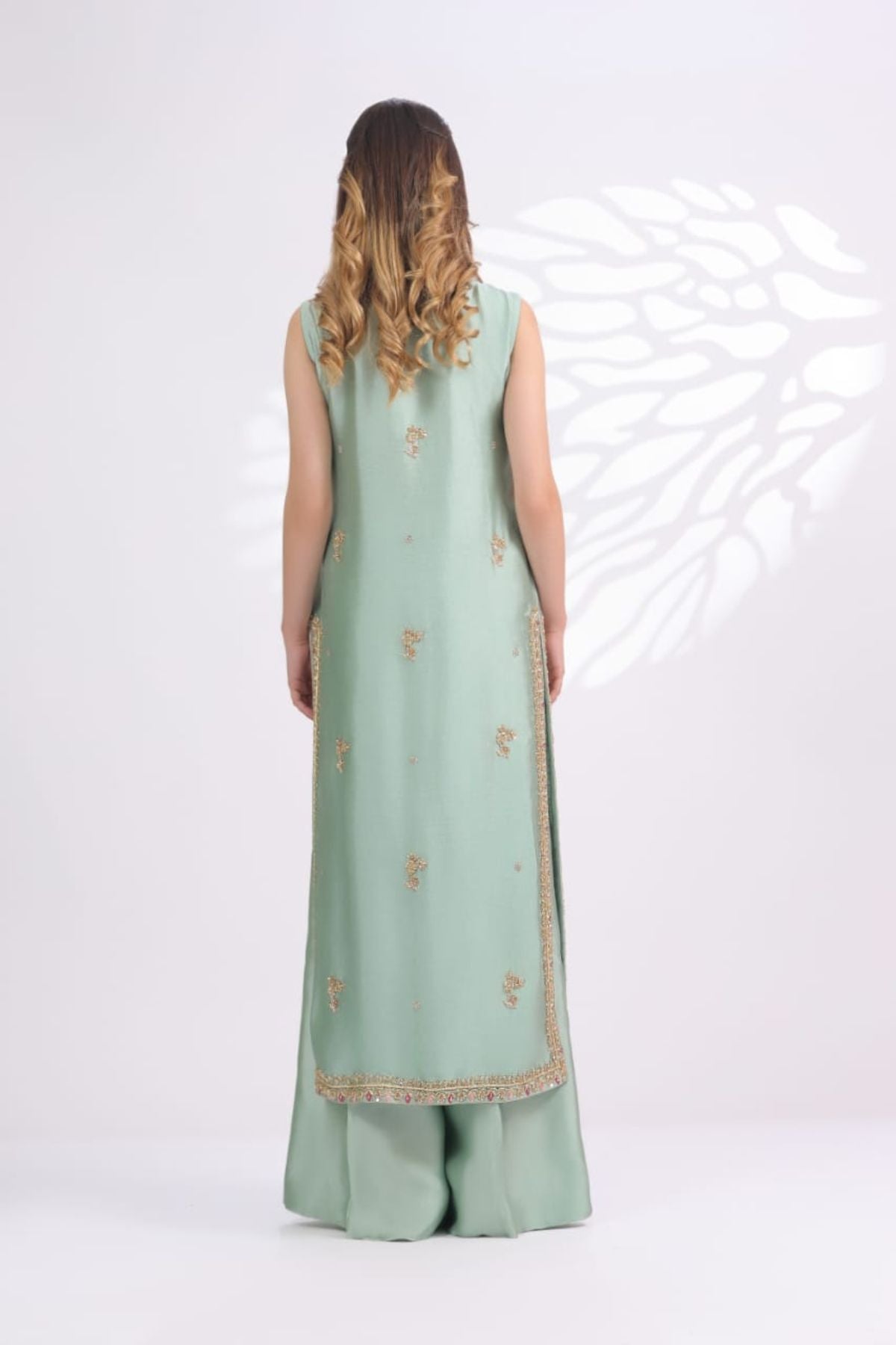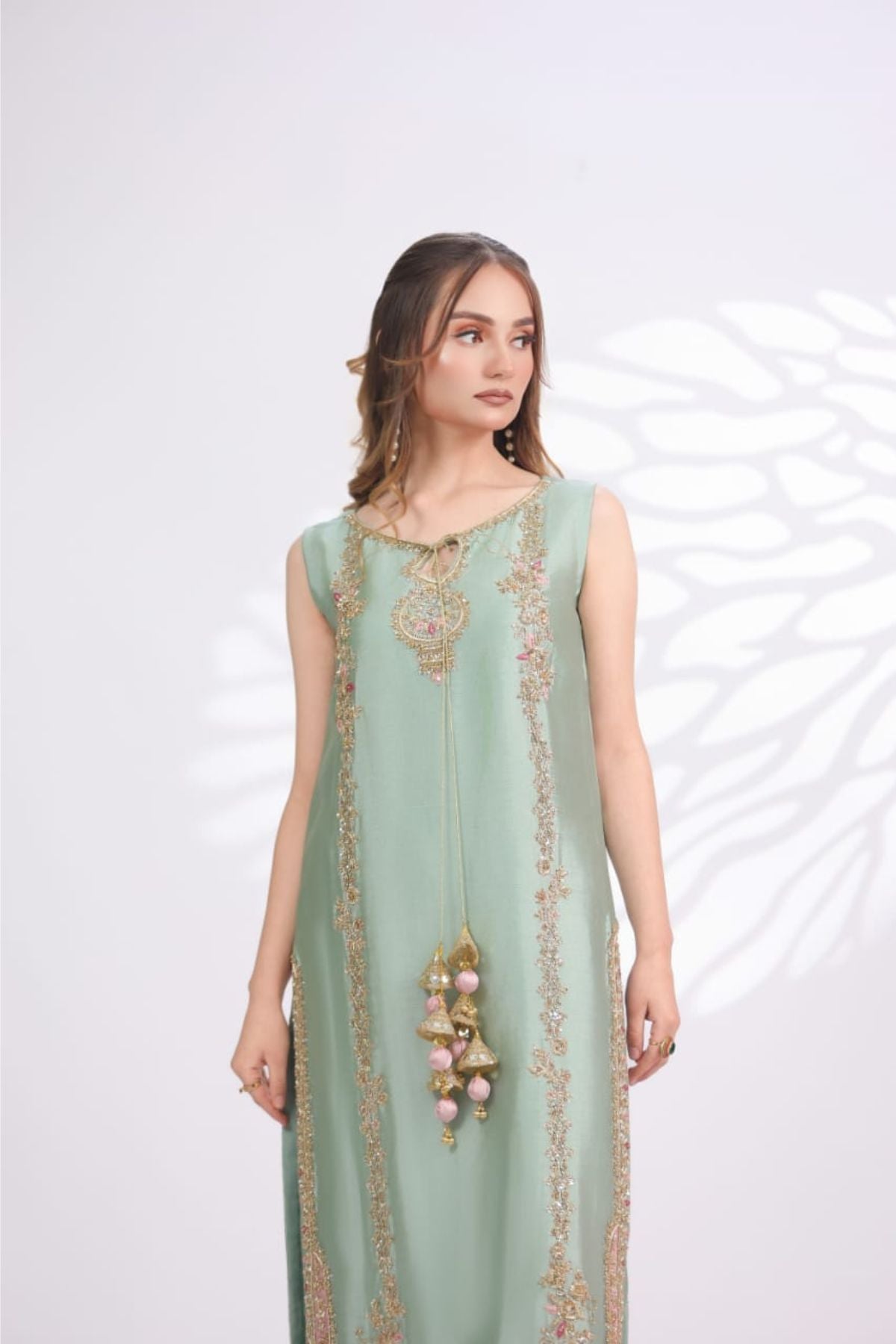 The Mint Pearl Embroidered Set radiates soft elegance with its refreshing mint tone and delicate gold and blush embroidery. The sleeveless long shirt features refined vertical embellishment panels, a beautifully detailed neckline, and decorative tassel accents that add a graceful finishing touch. Intricate embroidery along the hem enhances the silhouette, while the matching wide-leg trousers complete the ensemble with effortless balance. Ideal for daytime festivities, intimate celebrations, or formal gatherings, Mint Pearl offers a serene yet luxurious look with timeless appeal.