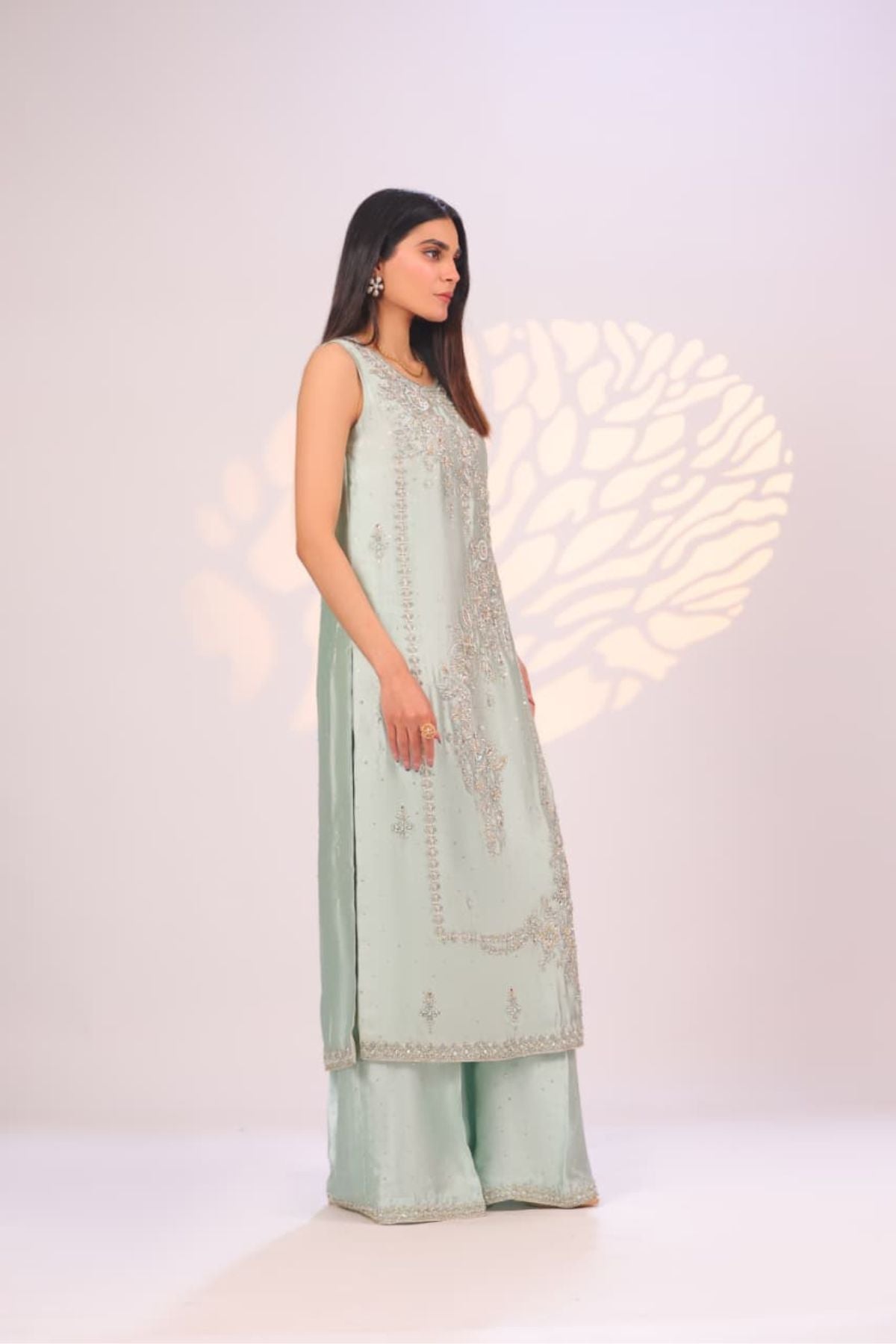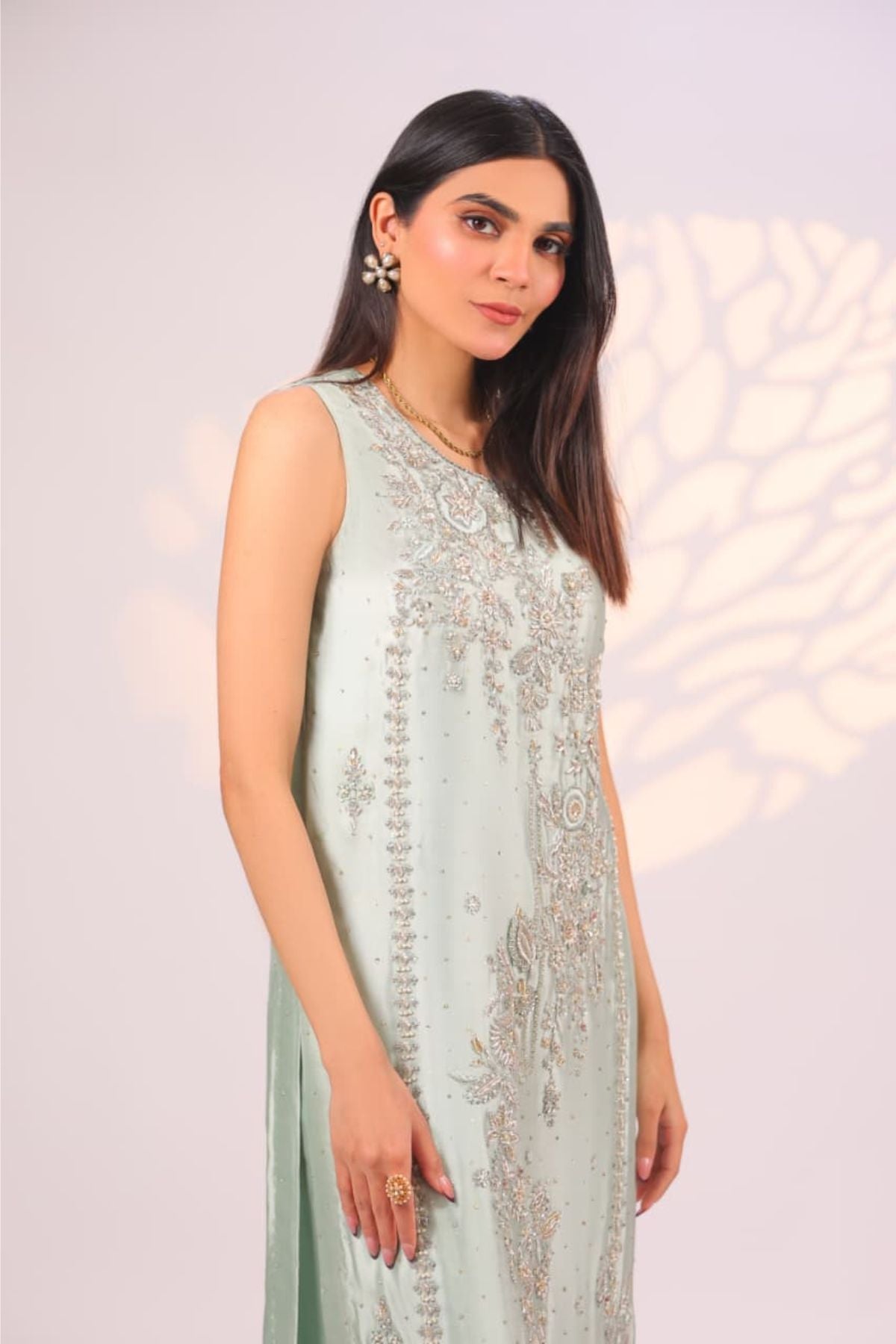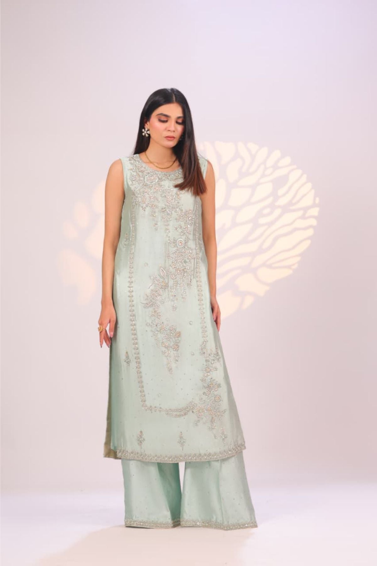 Mint Whisper is a serene expression of modern elegance. Crafted in a soft mint hue, this sleeveless ensemble is delicately adorned with fine embroidery and subtle handwork that gently catches the light. The straight-cut silhouette is balanced with coordinated wide-leg trousers, offering effortless movement and comfort. Light, graceful, and refined, Mint Whisper is ideal for daytime festivities, summer soirées, and intimate celebrations where understated luxury shines.