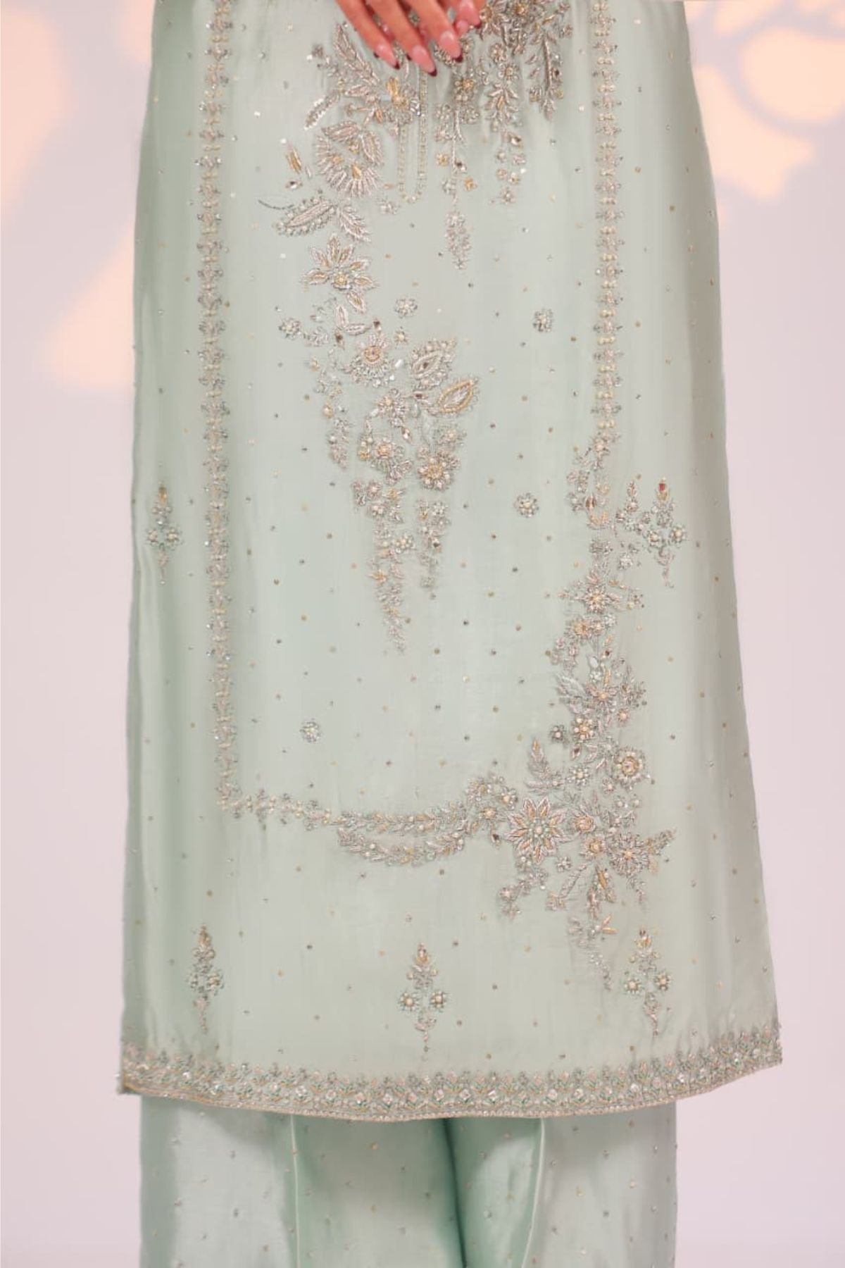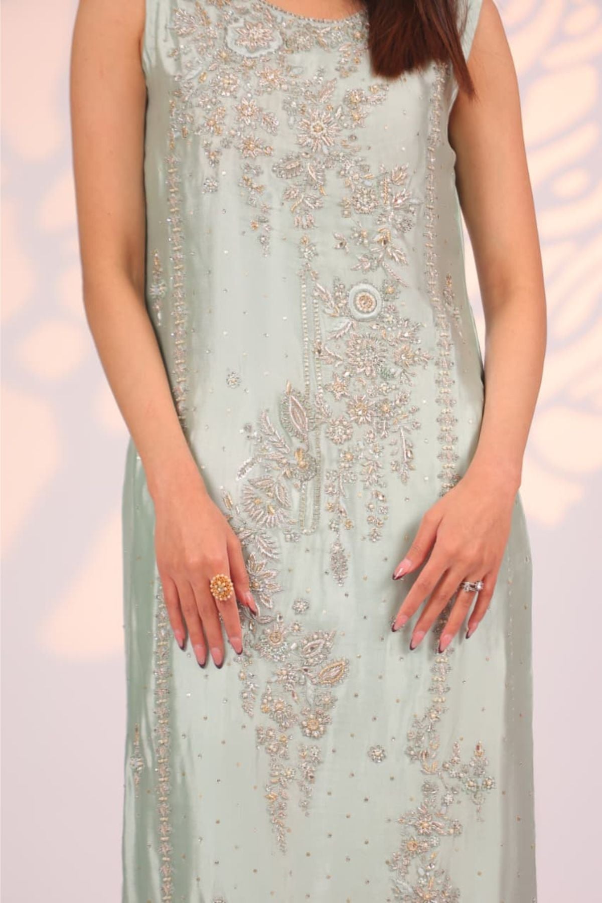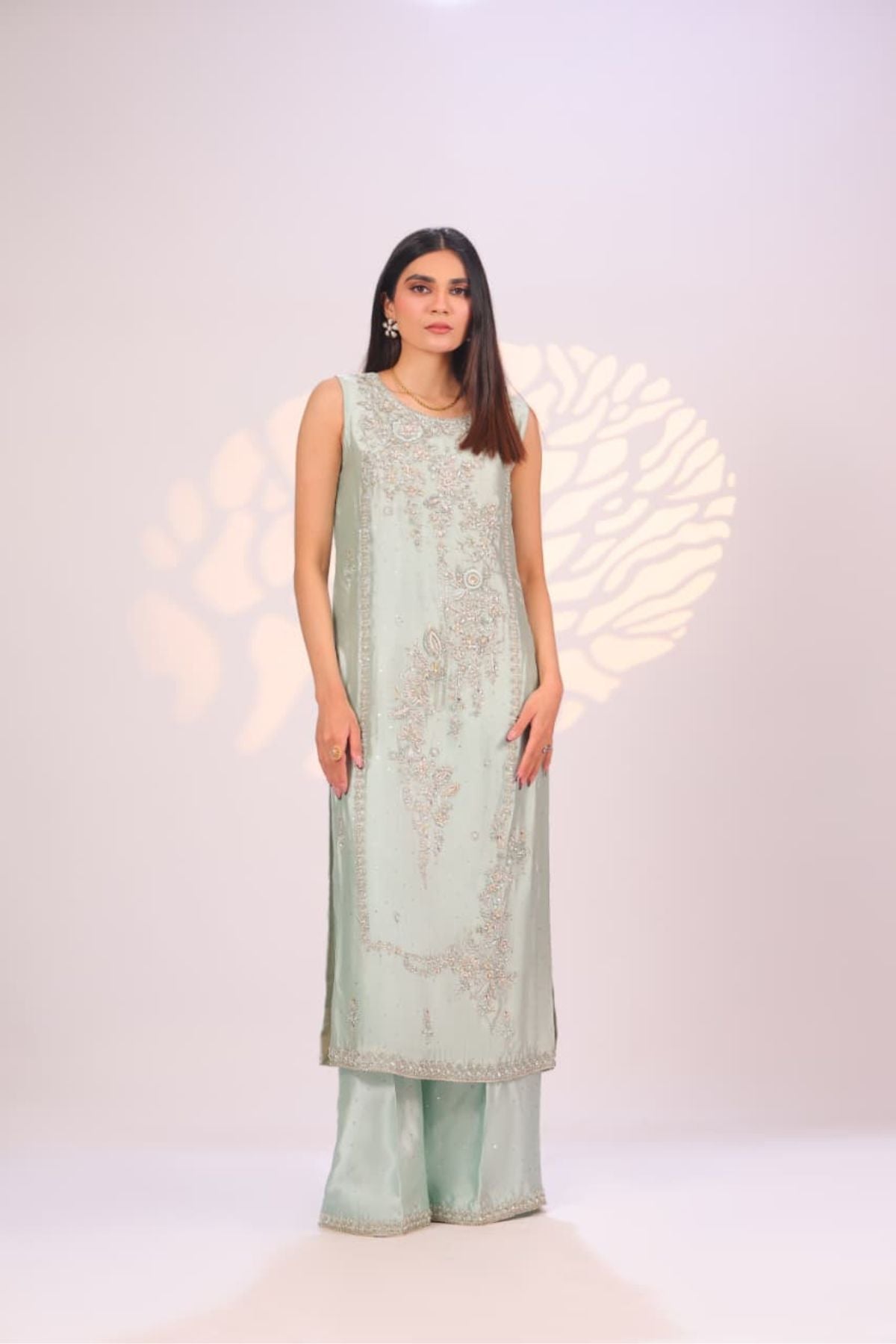 Mint Whisper is a serene expression of modern elegance. Crafted in a soft mint hue, this sleeveless ensemble is delicately adorned with fine embroidery and subtle handwork that gently catches the light. The straight-cut silhouette is balanced with coordinated wide-leg trousers, offering effortless movement and comfort. Light, graceful, and refined, Mint Whisper is ideal for daytime festivities, summer soirées, and intimate celebrations where understated luxury shines.