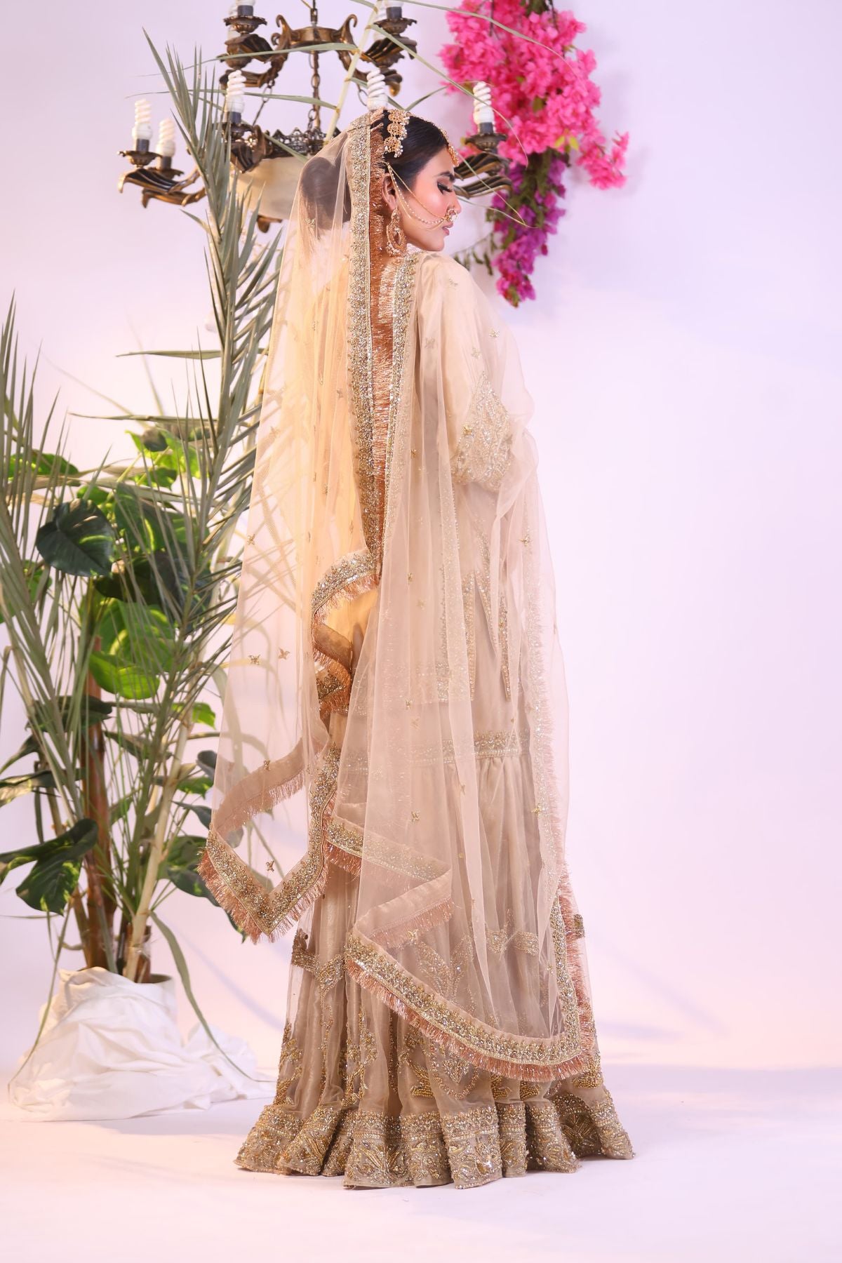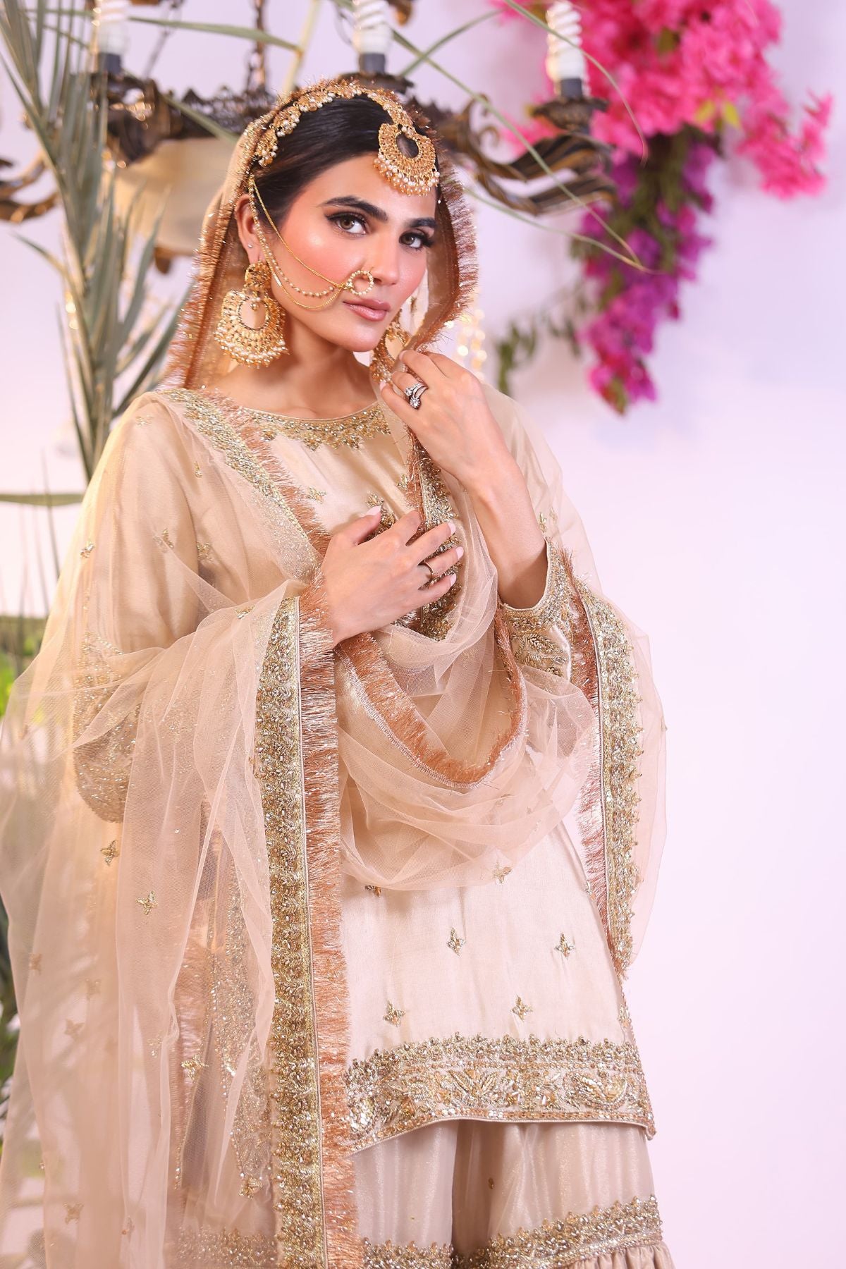 Step into your forever moment with Gilded Serenity, a luminous Nikah bridal outfit that exudes grace, tradition, and quiet luxury. This breathtaking ensemble features a delicately embroidered shirt paired with a voluminous gharara, both adorned with intricate golden threadwork, tilla, and sequin detailing that shimmer with every movement.