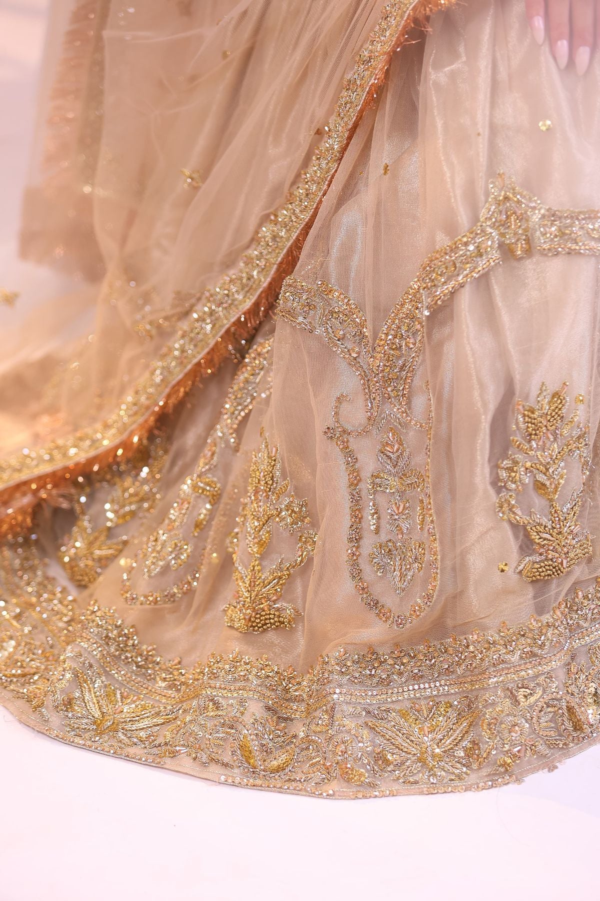 The look is completed with a soft net dupatta, beautifully bordered and lightly scattered with embellishments—perfectly framing the bride in elegance. Ideal for Nikah or intimate wedding ceremonies, this ensemble captures the essence of timeless bridal beauty with a soft, ethereal charm.