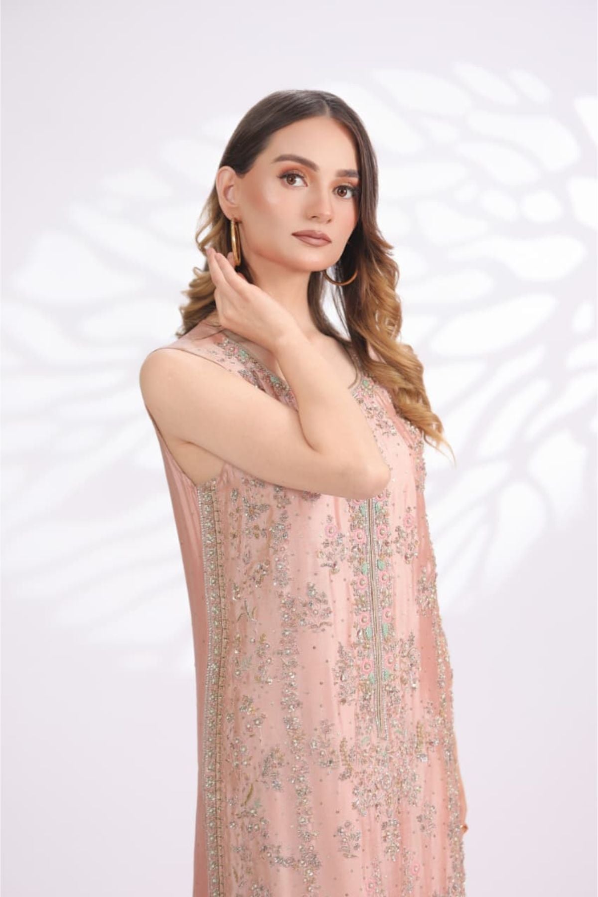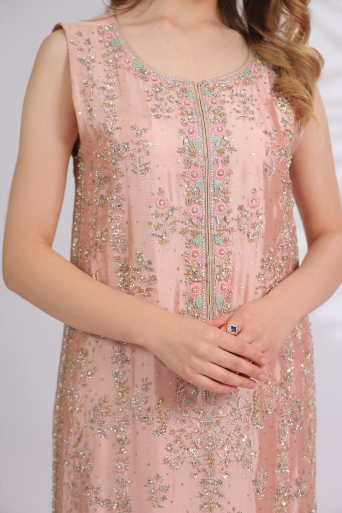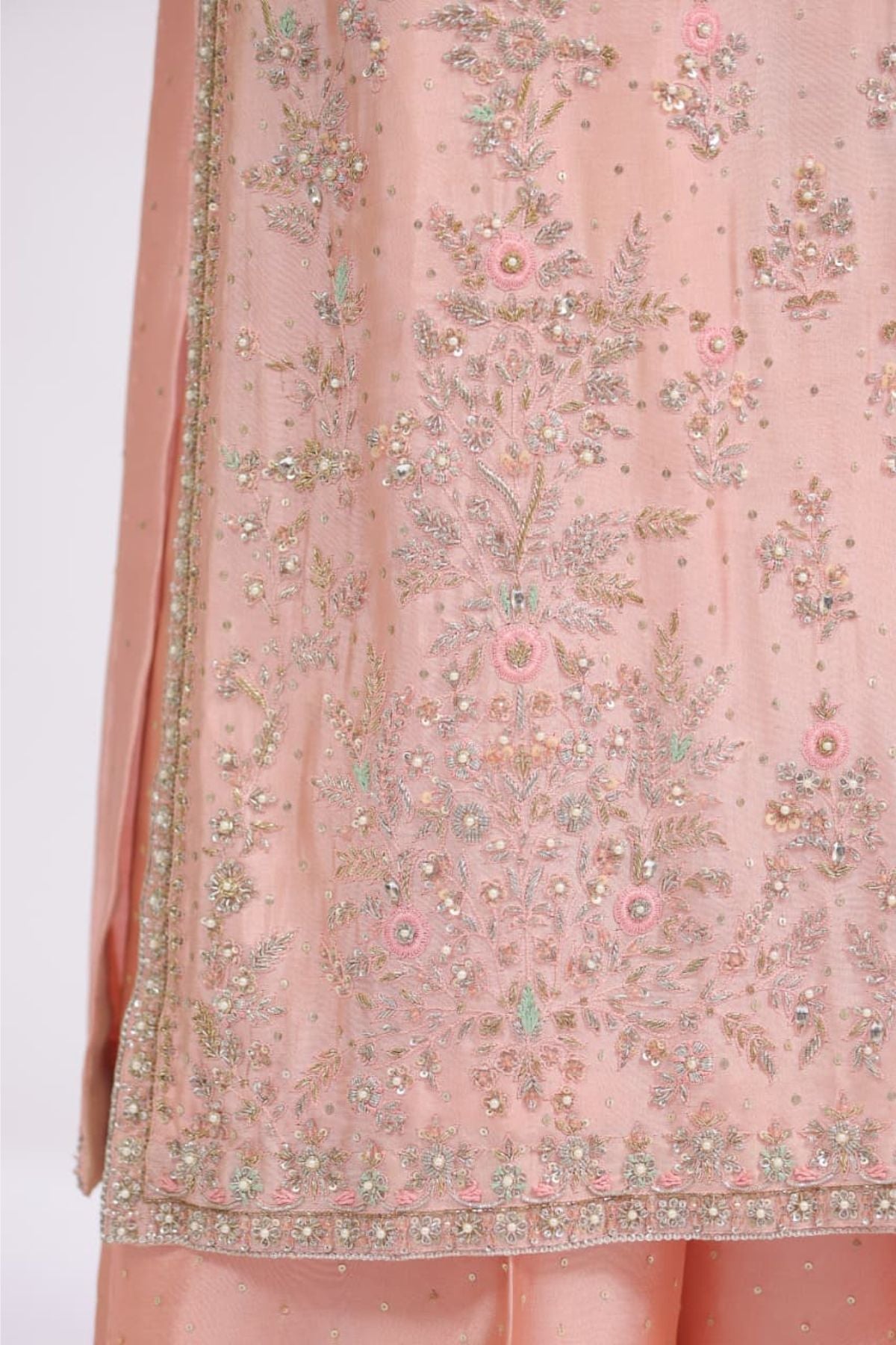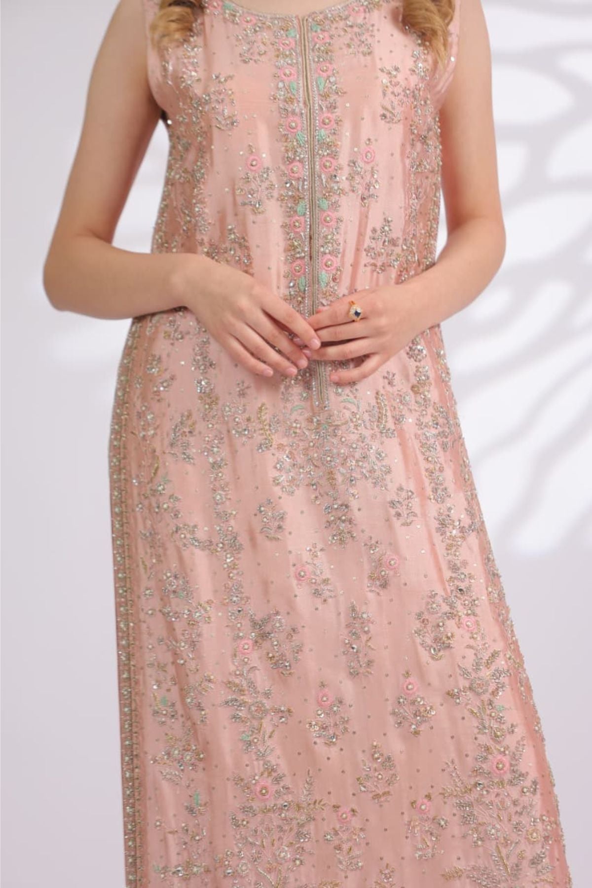 Peach Reverie is a delicate balance of warmth and elegance. Rendered in a soft peach hue, this sleeveless straight-cut ensemble is adorned with fine floral embroidery and subtle shimmer that gently catches the light. The elongated silhouette is finished with a detailed border and paired with sheer matching wide-leg trousers, creating a fluid and graceful look. Perfect for daytime festivities, summer soirées, and intimate celebrations, Peach Reverie embodies effortless charm with a refined, modern touch.