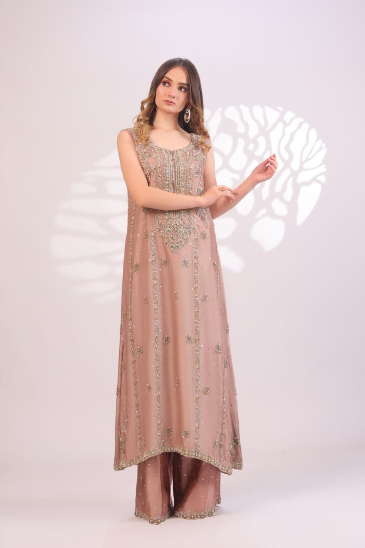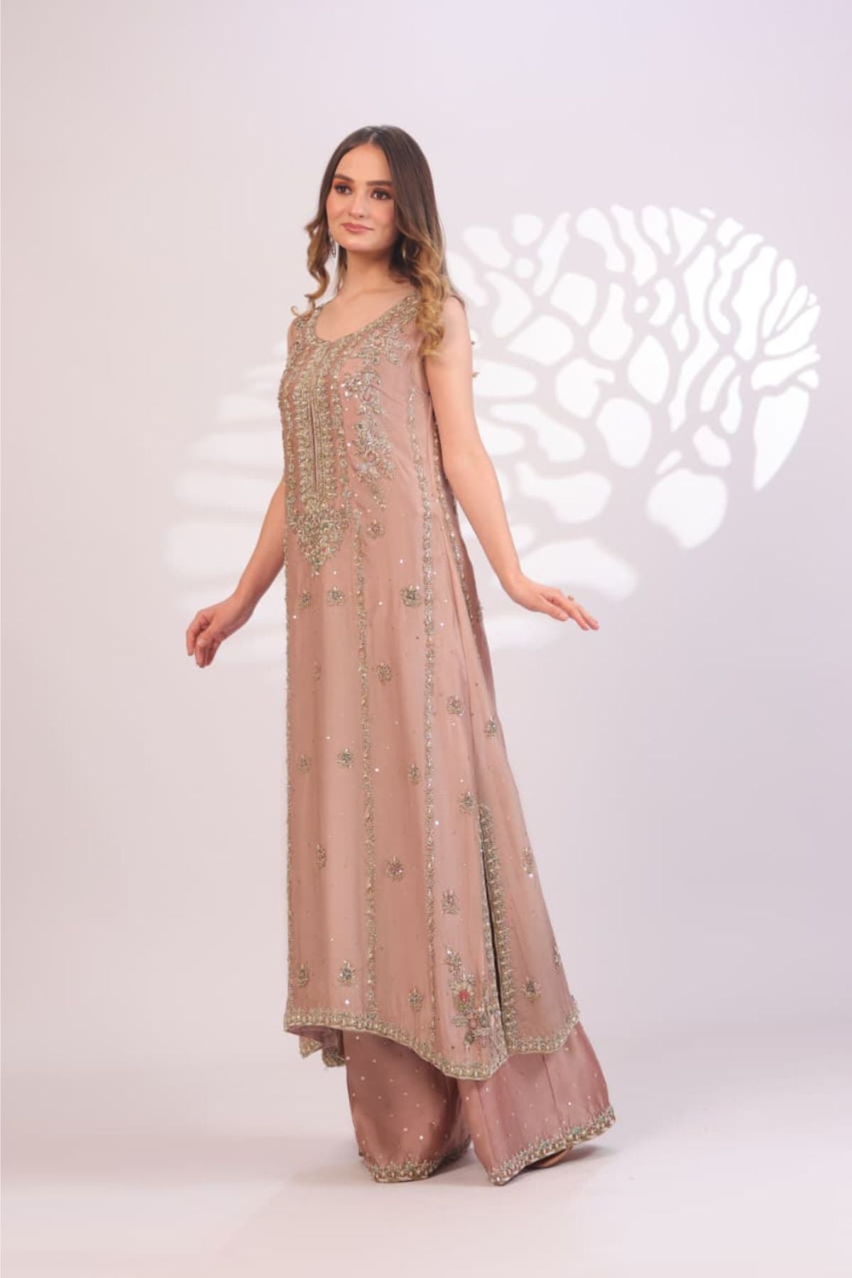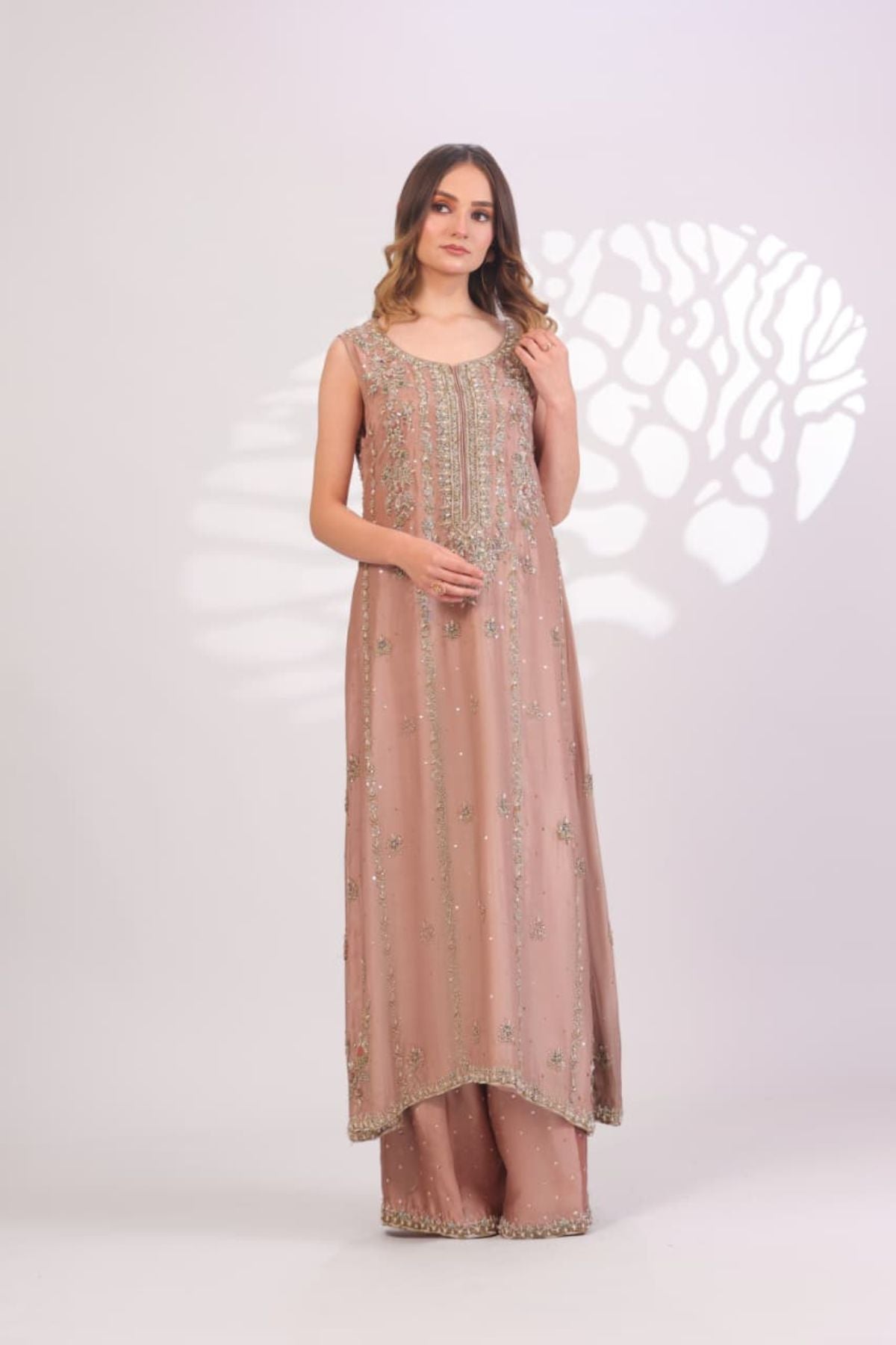 The Pink Sand Embroidered Set is a delicate expression of modern elegance and timeless charm. Designed in a soft pink sand hue, the sleeveless long silhouette is adorned with intricate gold embroidery and subtle sequin detailing arranged in graceful vertical patterns. The embellished neckline adds a refined focal point, while the fluid hemline enhances the overall flow of the design. Paired with matching wide-leg trousers, this ensemble is ideal for festive daytime occasions, formal gatherings, or intimate celebrations, offering effortless sophistication with a soft, luxurious finish.