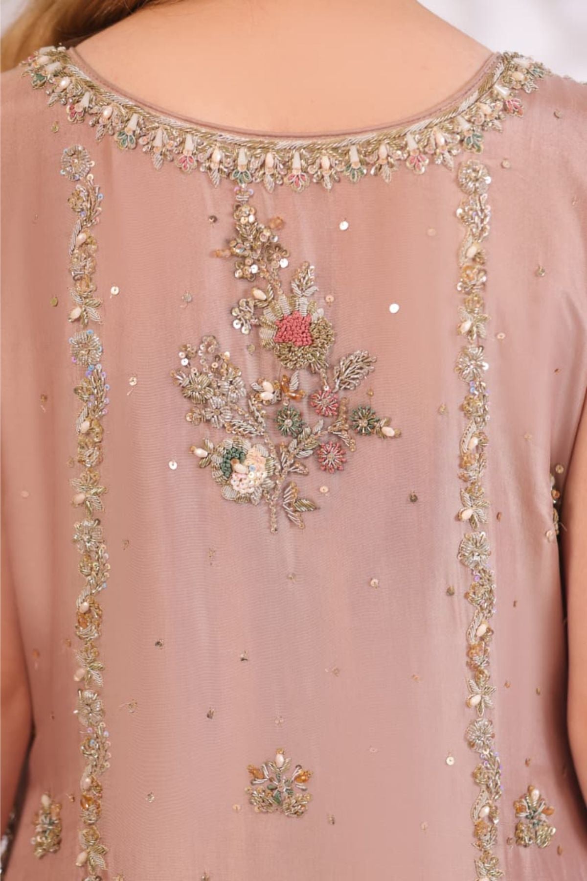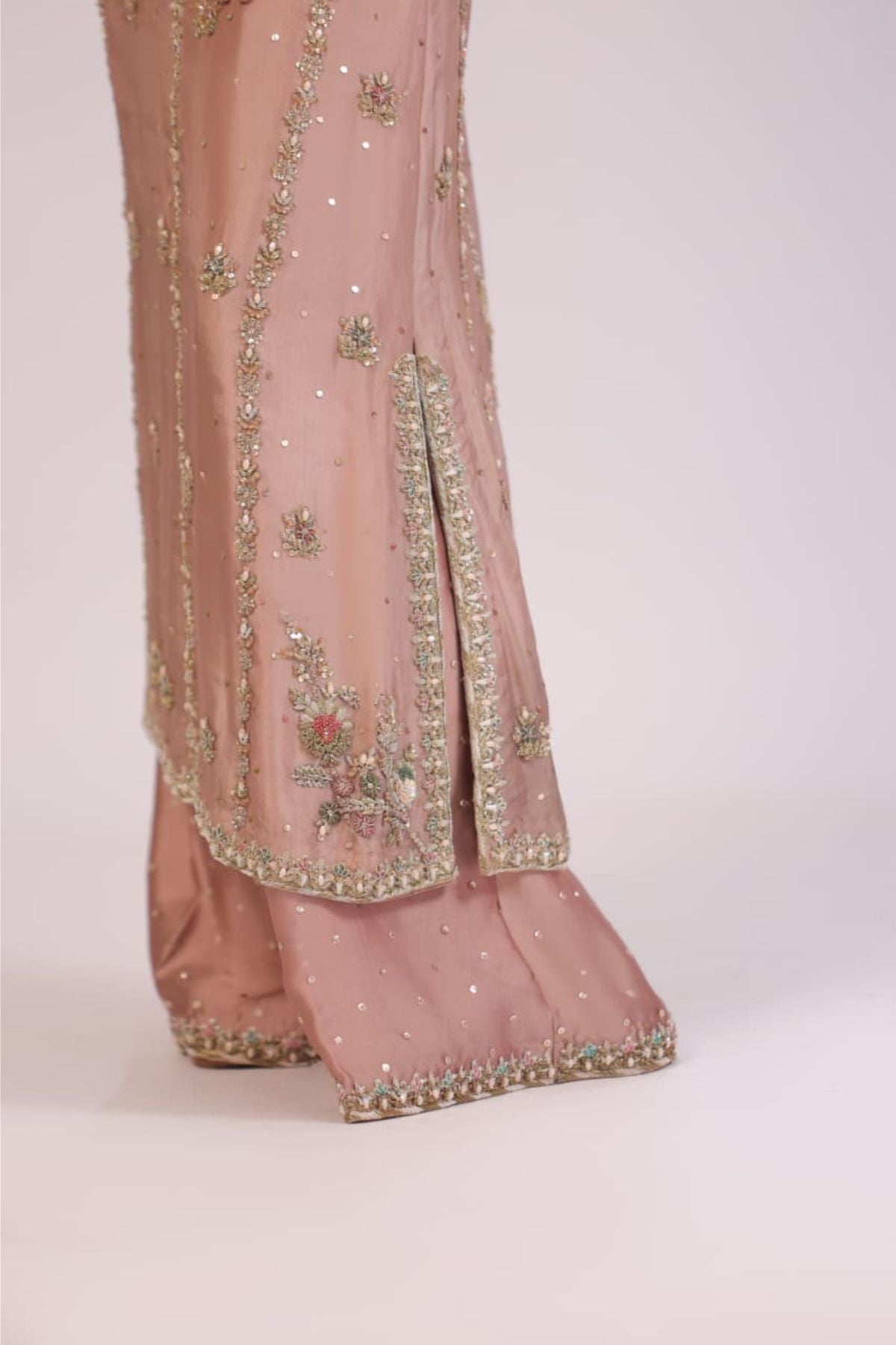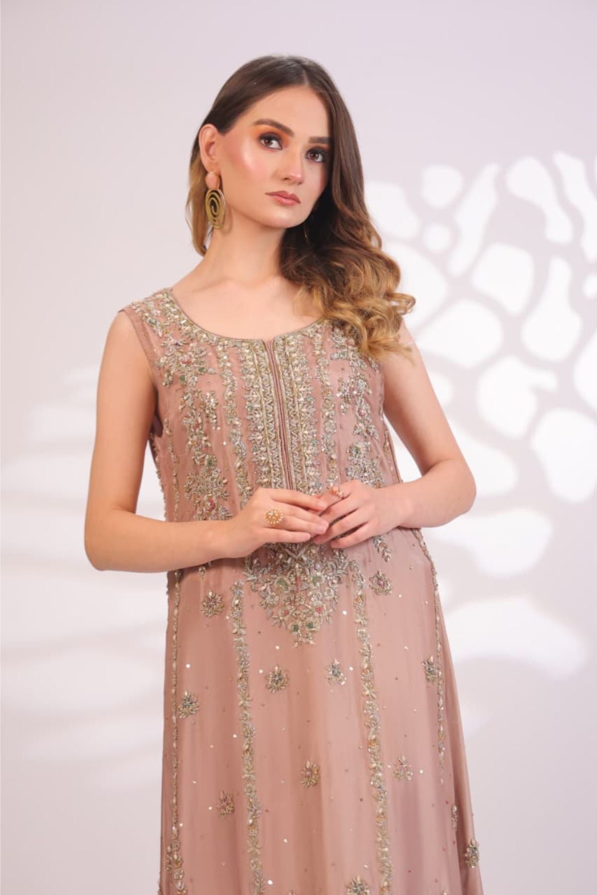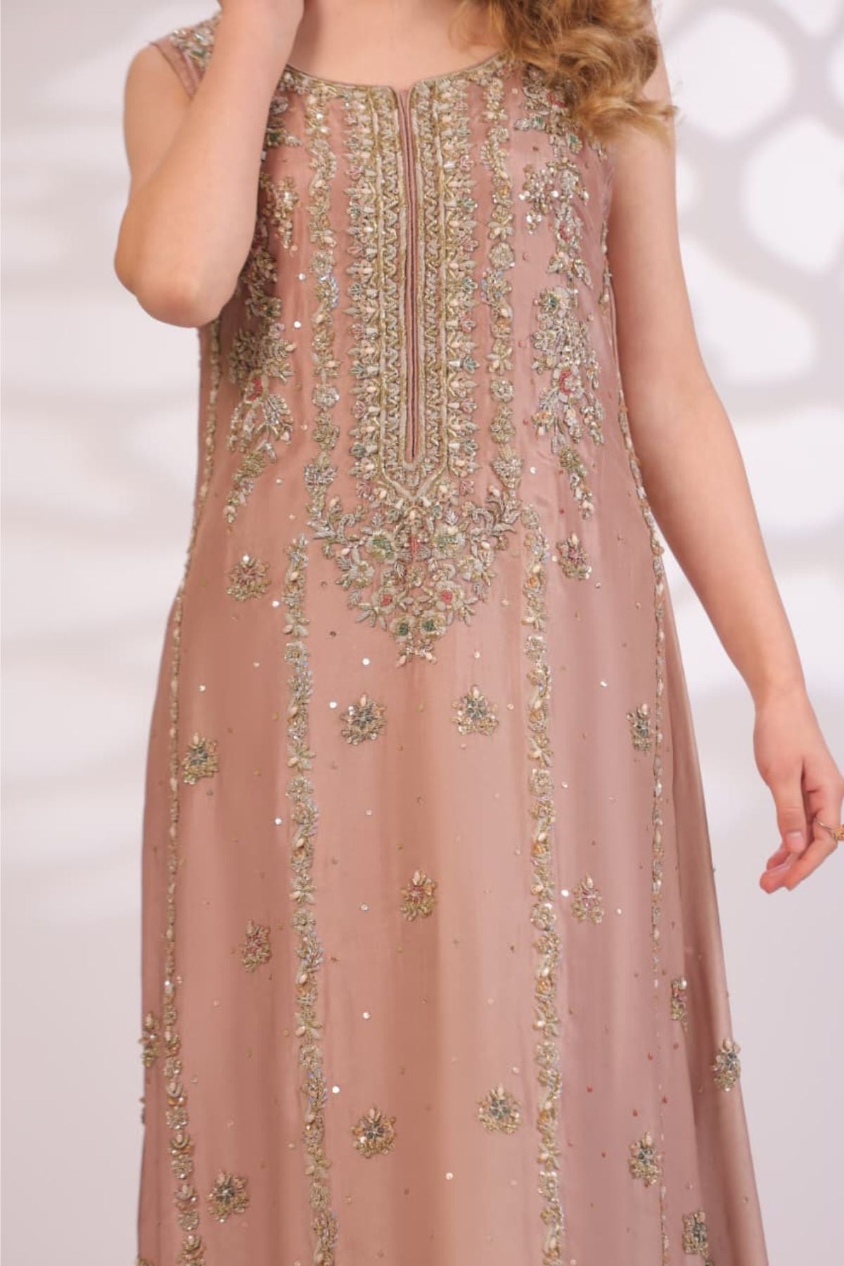 The Pink Sand Embroidered Set is a delicate expression of modern elegance and timeless charm. Designed in a soft pink sand hue, the sleeveless long silhouette is adorned with intricate gold embroidery and subtle sequin detailing arranged in graceful vertical patterns. The embellished neckline adds a refined focal point, while the fluid hemline enhances the overall flow of the design. Paired with matching wide-leg trousers, this ensemble is ideal for festive daytime occasions, formal gatherings, or intimate celebrations, offering effortless sophistication with a soft, luxurious finish.