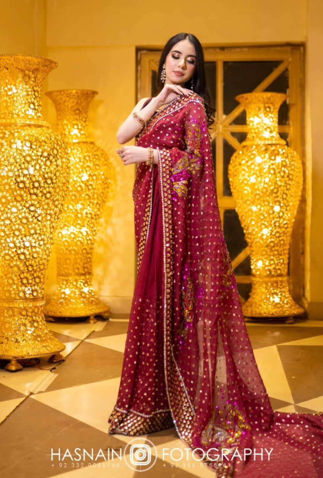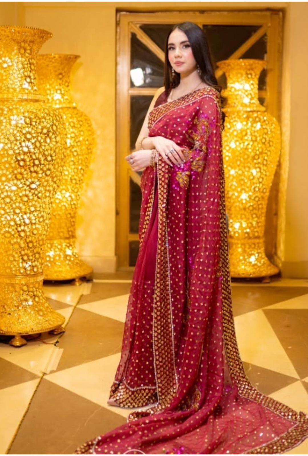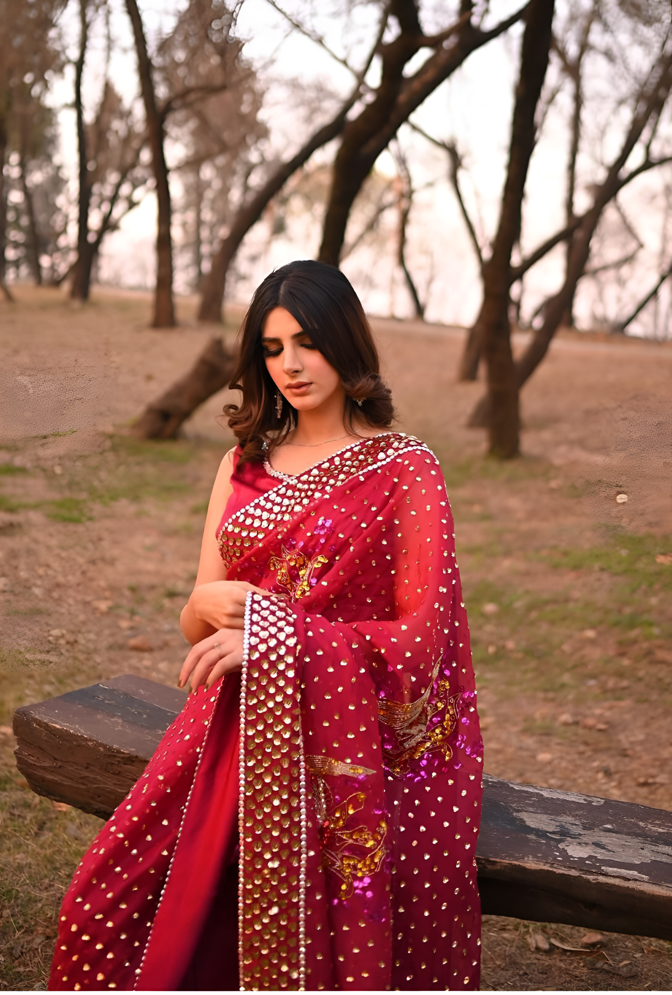 "Rapture" design by Usama Silk is a celebration of grace and beauty, meticulously crafted on pure organza. Embellished with delicate sequins and shimmering crystal flowers, this masterpiece exudes sophistication. Every detail whispers of luxury and charm, making it a truly enchanting creation.