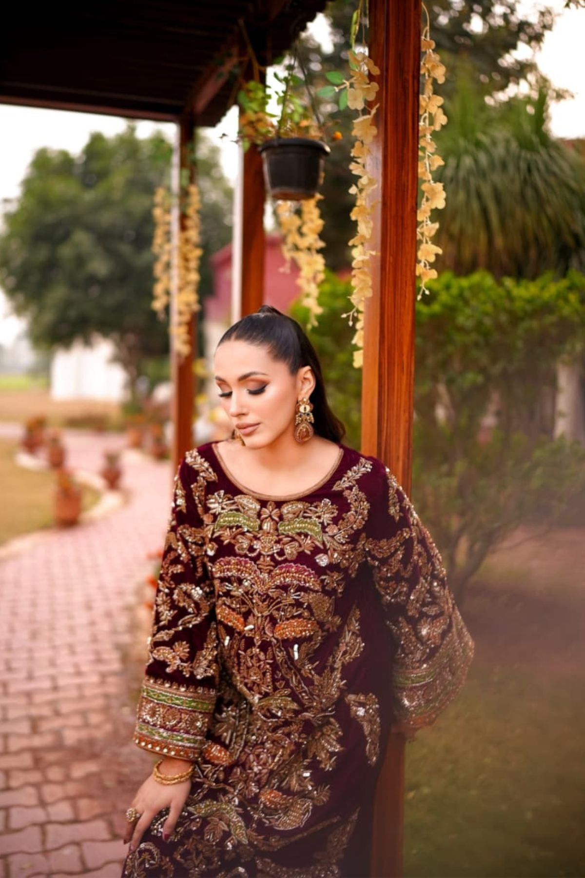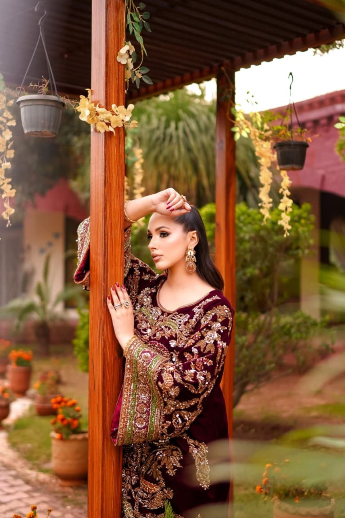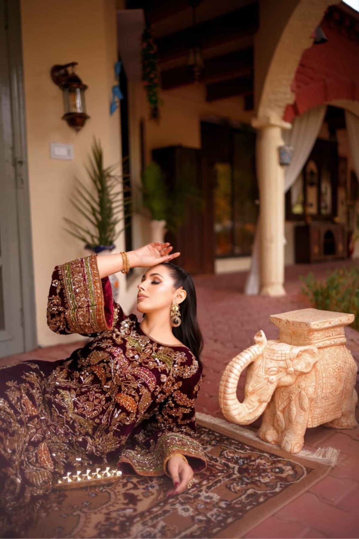 The Ravayah Maroon Embroidered Kaftan is a celebration of timeless grandeur and traditional craftsmanship. Crafted in a deep maroon hue, this statement piece features rich antique-gold embroidery with intricate floral and architectural motifs spread across the silhouette. The wide, embellished sleeves and ornate borders add dramatic elegance, while the flowing kaftan cut ensures a regal yet comfortable drape. Perfect for weddings, festive soirées, and formal evenings, Mehrbano embodies old-world luxury with a refined, contemporary presence.