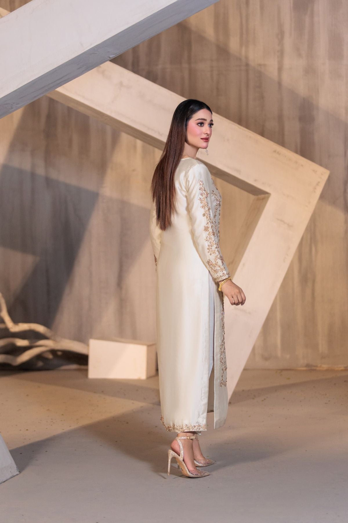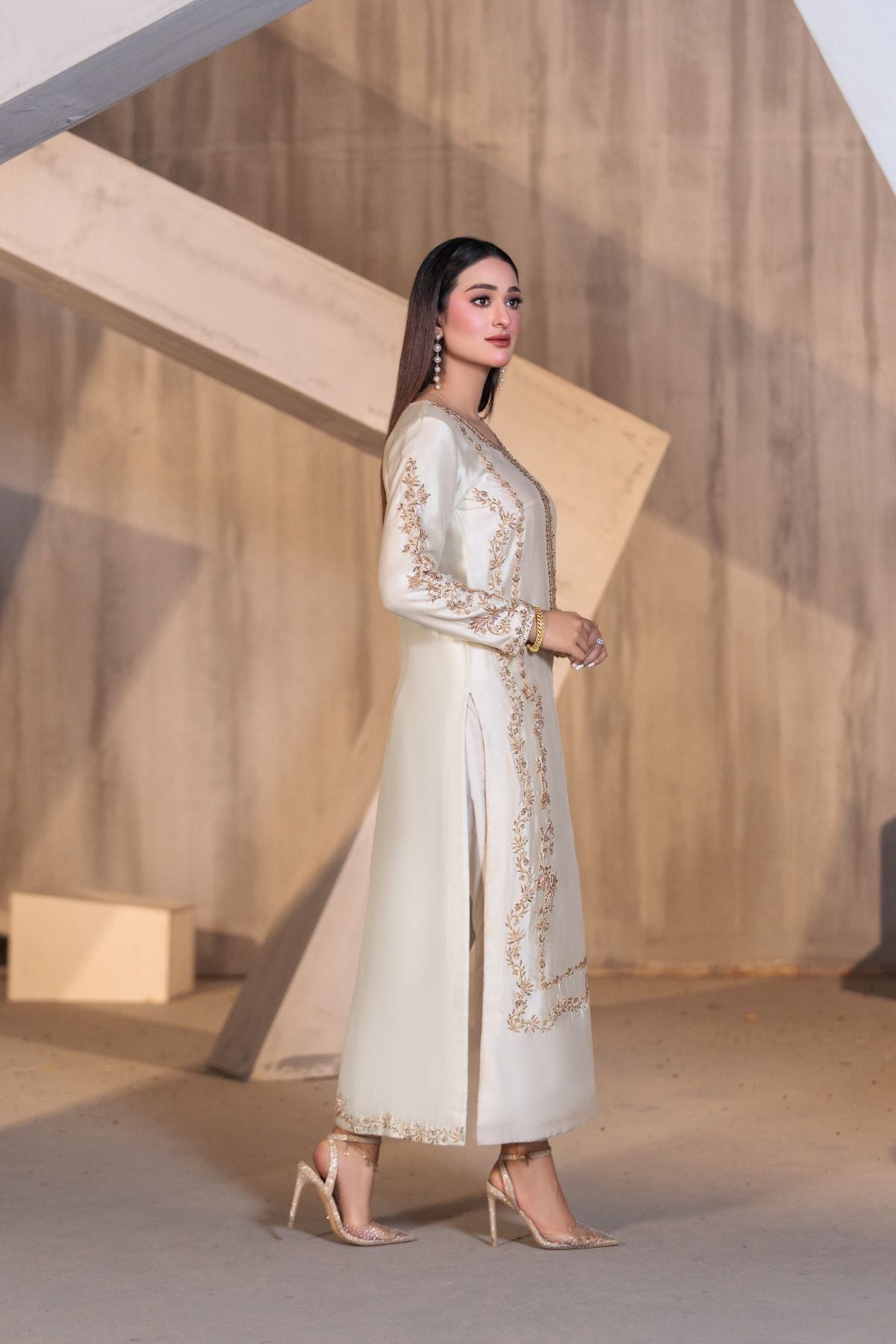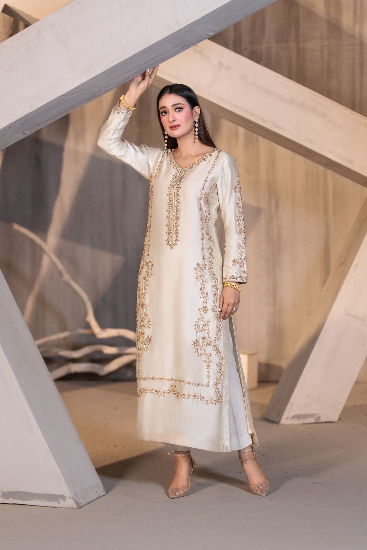 Exude timeless grace in this ivory-hued formal ensemble, delicately adorned with golden thread embroidery. The long silhouette features a soft sheen fabric that enhances its regal charm, while intricate motifs cascade along the neckline, sleeves, and hem for a refined finish. Perfect for festive gatherings, weddings, or evening soirées, this piece pairs elegance with understated sophistication.