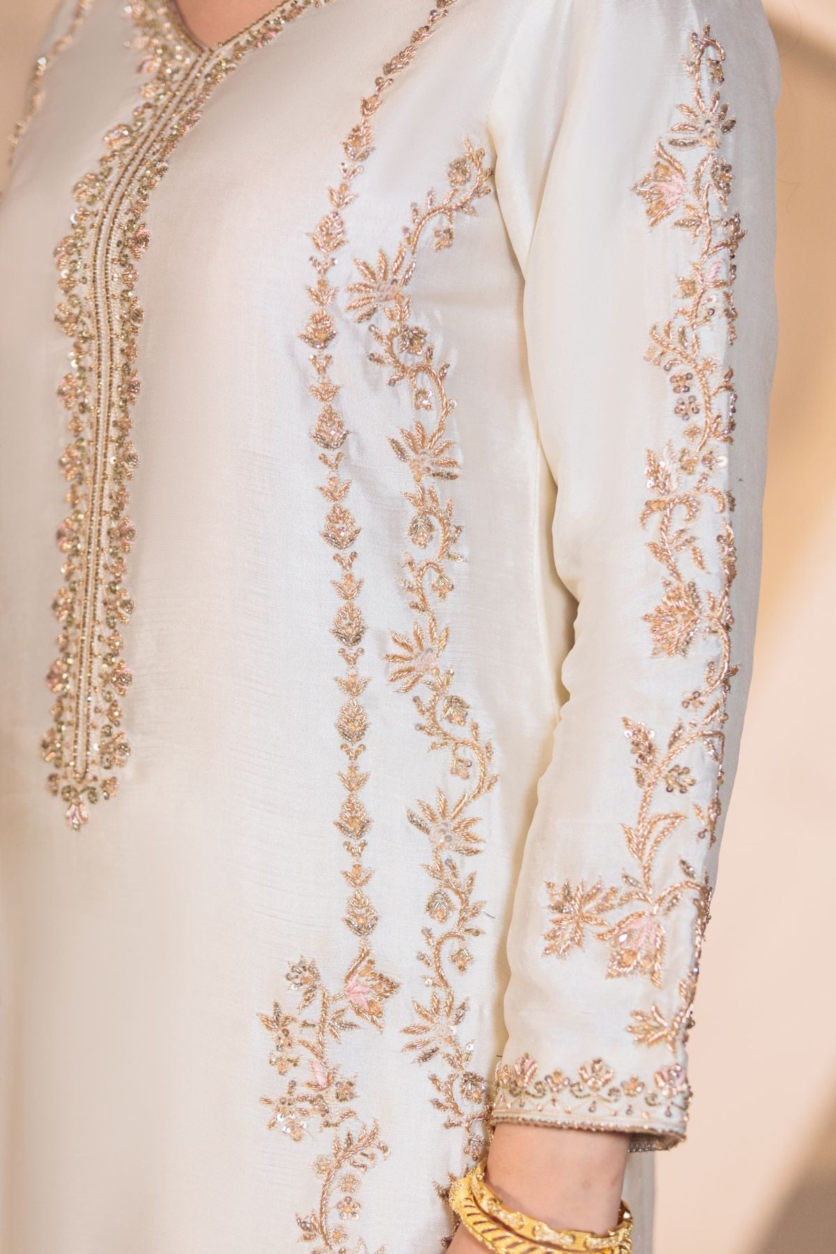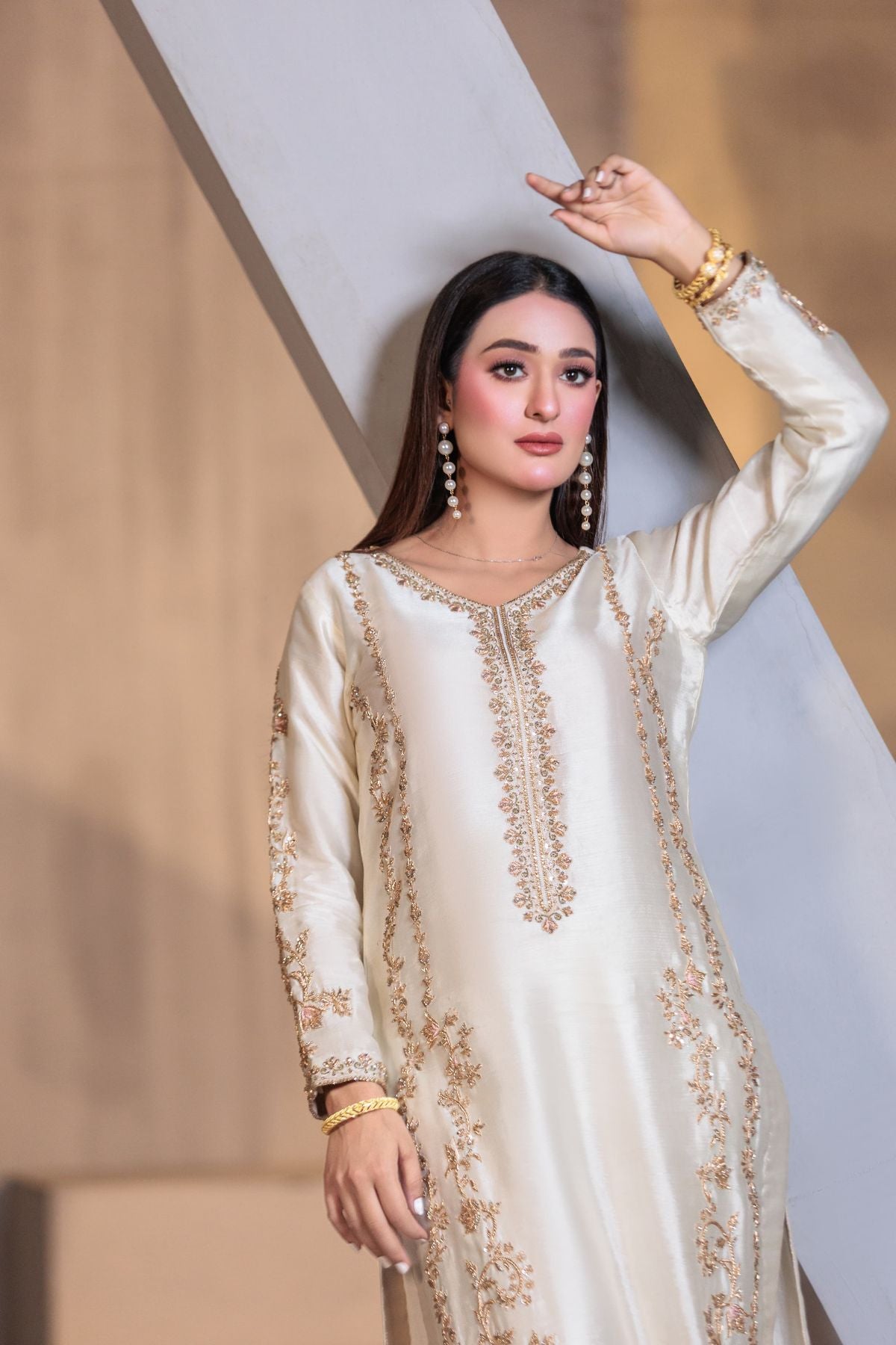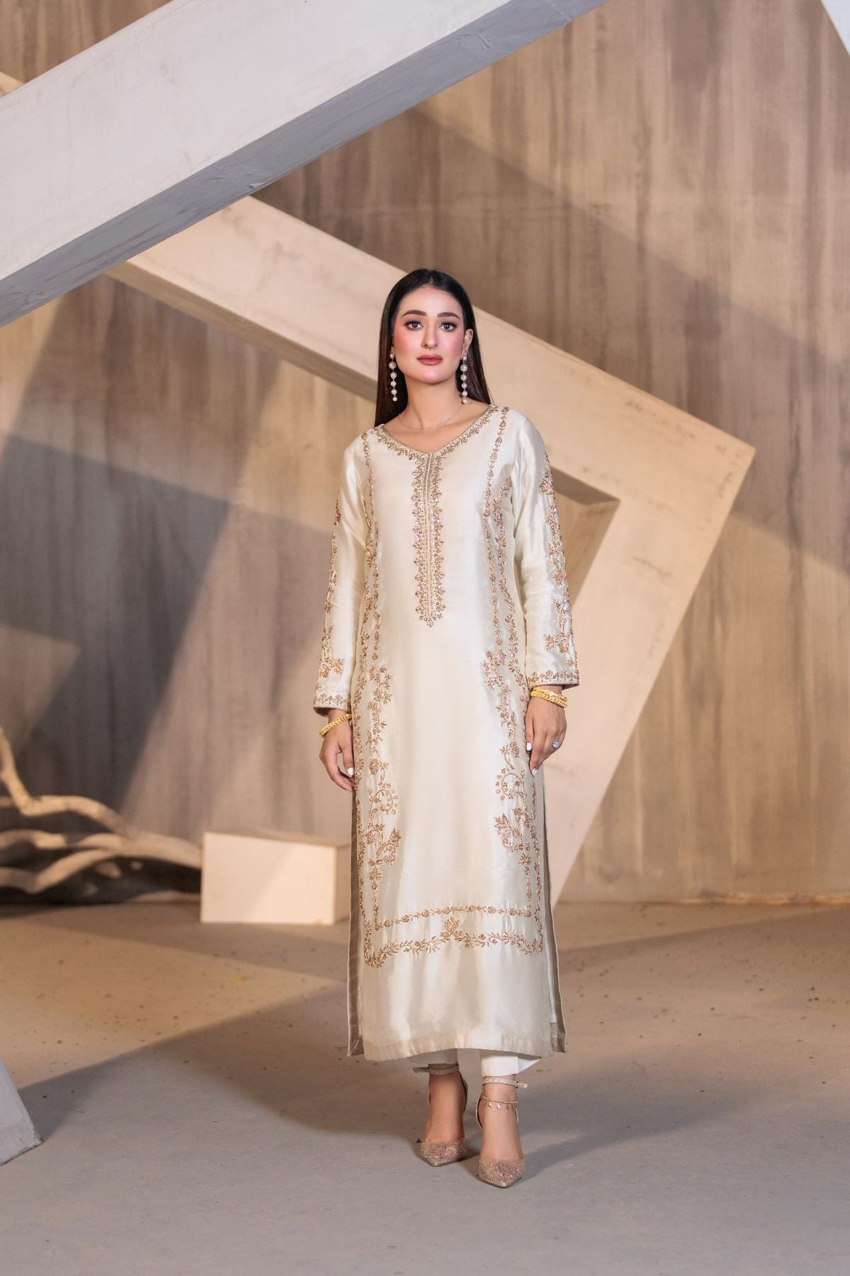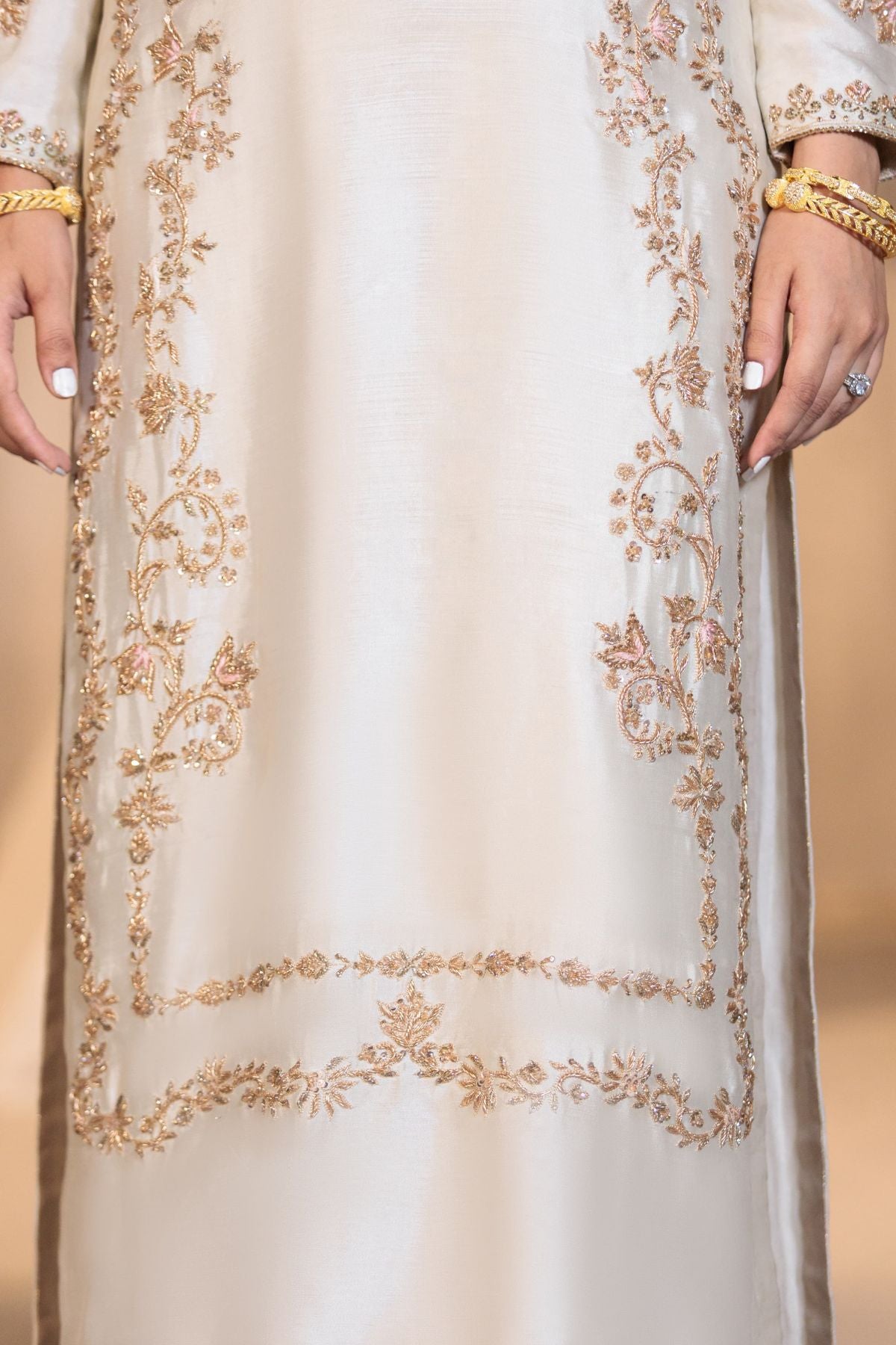 Exude timeless grace in this ivory-hued formal ensemble, delicately adorned with golden thread embroidery. The long silhouette features a soft sheen fabric that enhances its regal charm, while intricate motifs cascade along the neckline, sleeves, and hem for a refined finish. Perfect for festive gatherings, weddings, or evening soirées, this piece pairs elegance with understated sophistication.