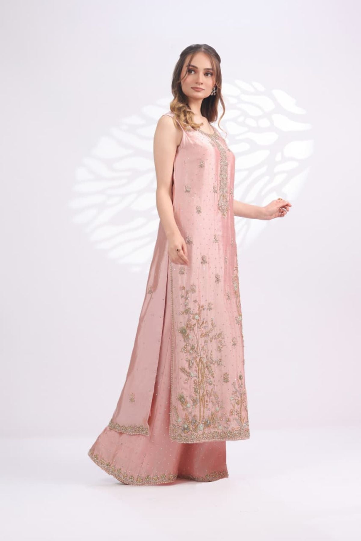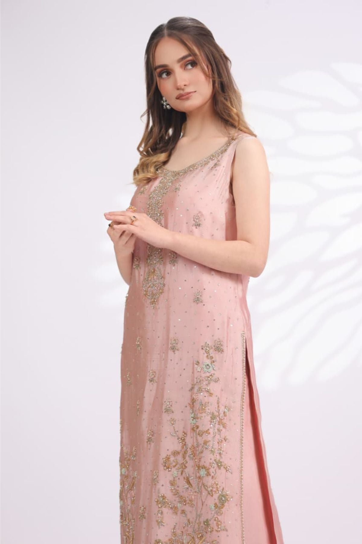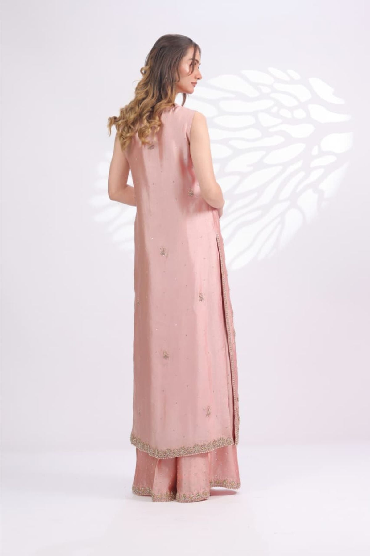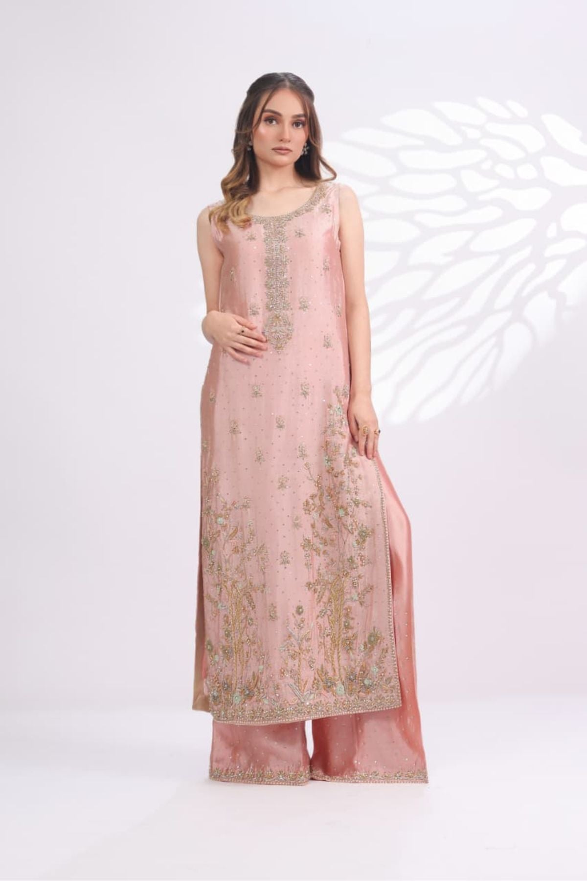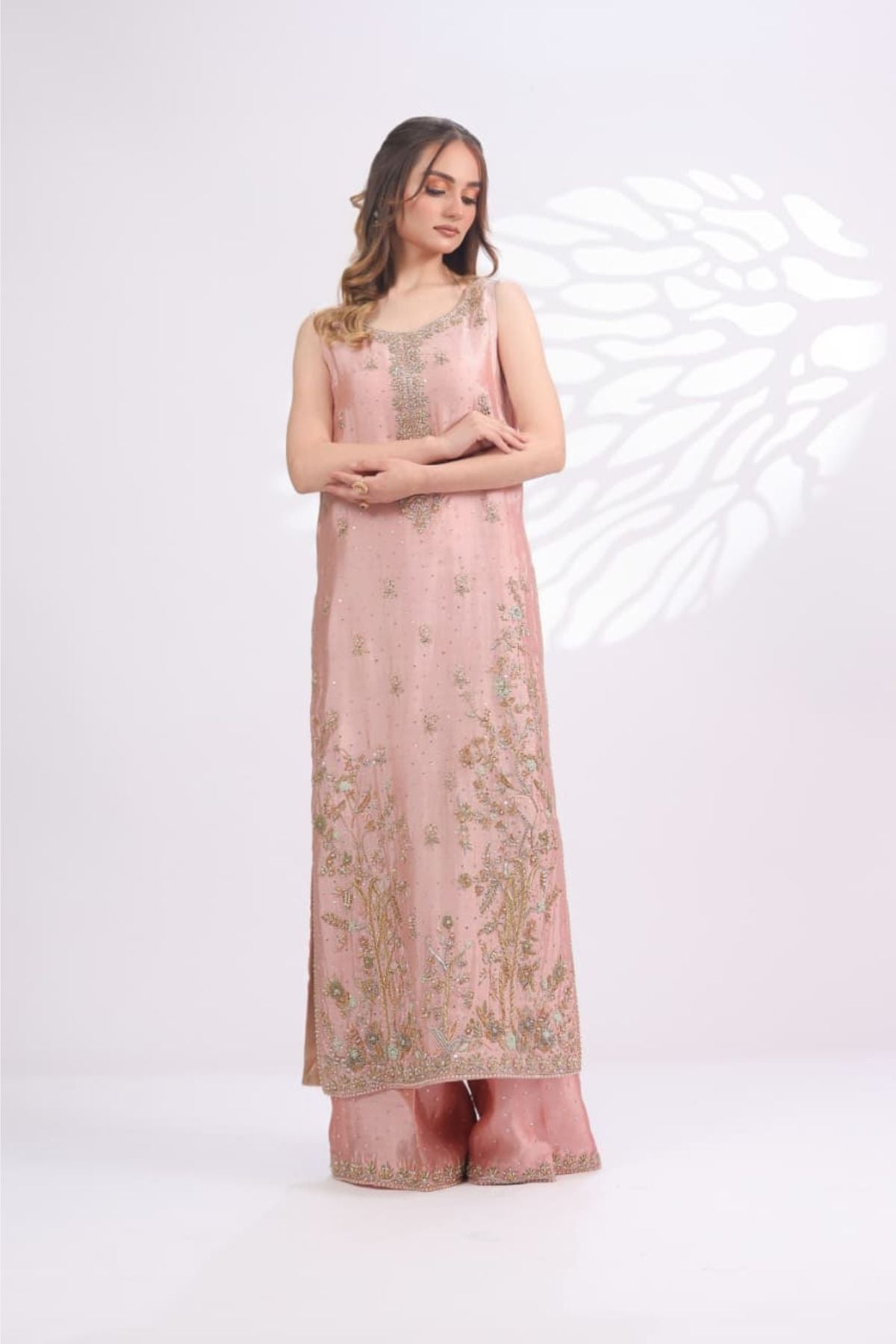 The Roselle Blush Embroidered Set is the embodiment of soft elegance and understated luxury. Crafted in a delicate blush pink tone, the long silhouette is adorned with fine gold embroidery and subtle sequin accents that create a graceful, feminine flow. The sleeveless shirt features detailed neckline work and intricate motifs cascading toward the hem, paired beautifully with matching wide-leg trousers finished with an embroidered border. Ideal for festive luncheons, engagement events, or formal daytime occasions, Roselle Blush offers a timeless, effortlessly polished look.