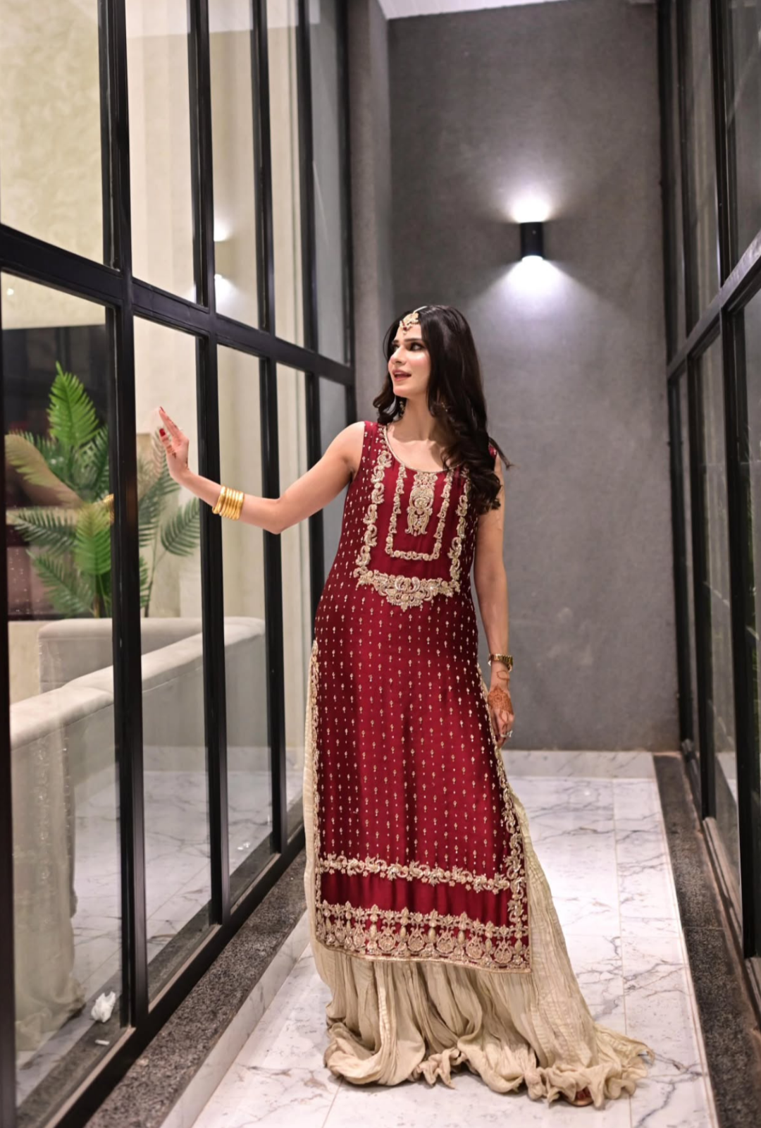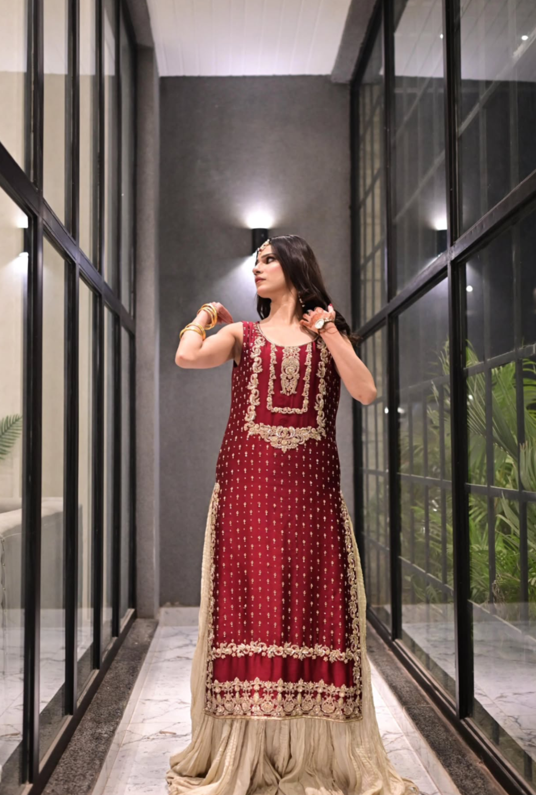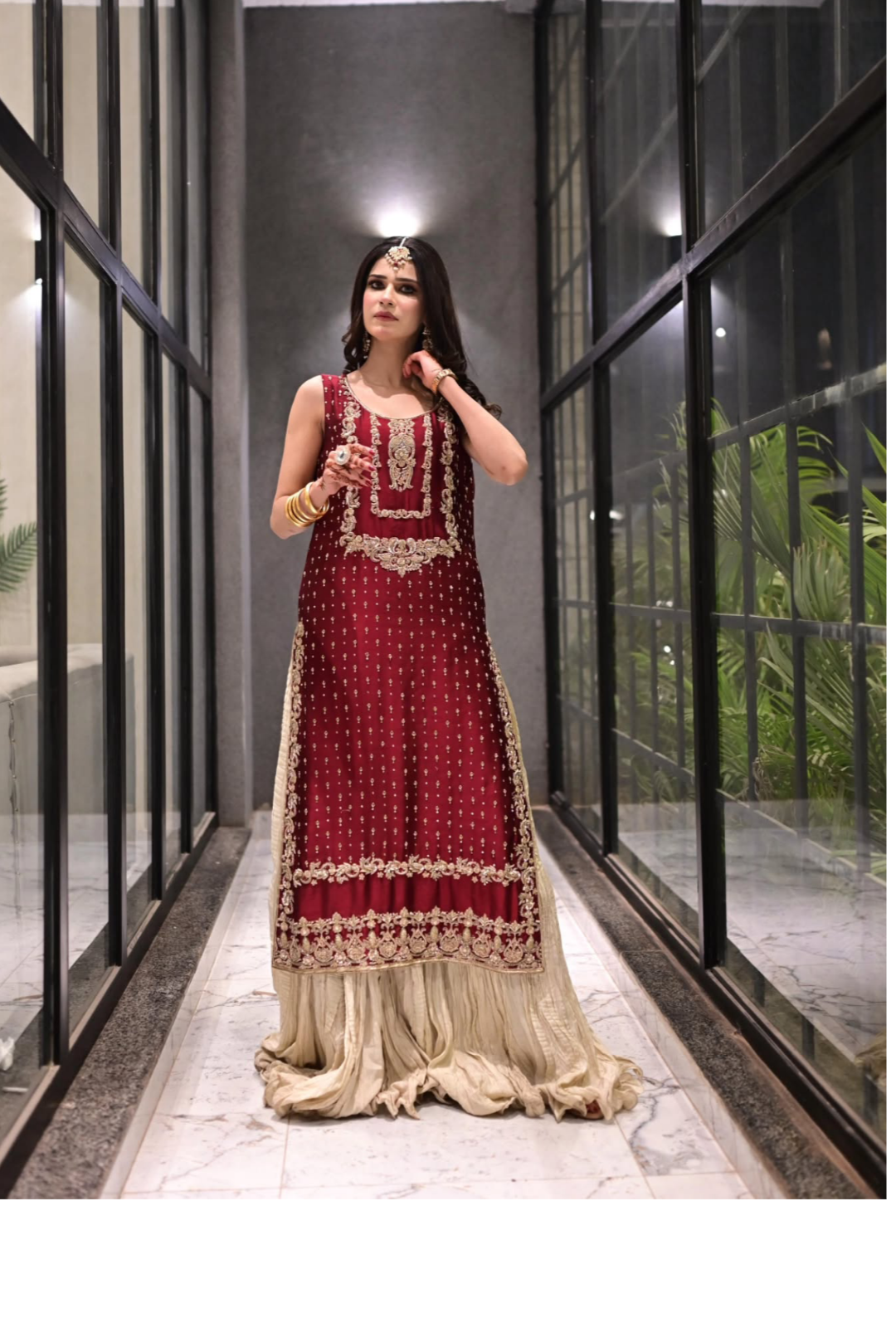 The Ruby dress is a stunning piece adorned with intricate resham, dabka, and naqshi work, showcasing a blend of traditional craftsmanship and modern elegance. It features sparkling crystals and sequins that add a touch of glamour, while bajra moti embellishments enhance its luxurious appeal. Perfect for formal occasions, this dress ensures your little one stands out with grace and sophistication.