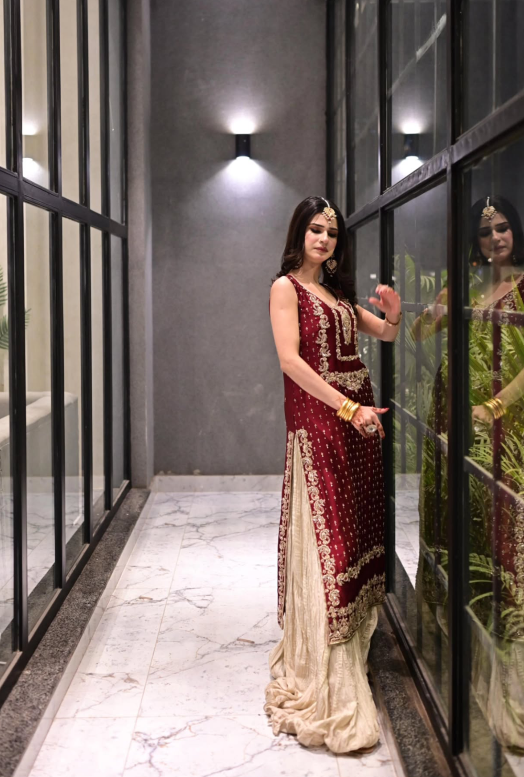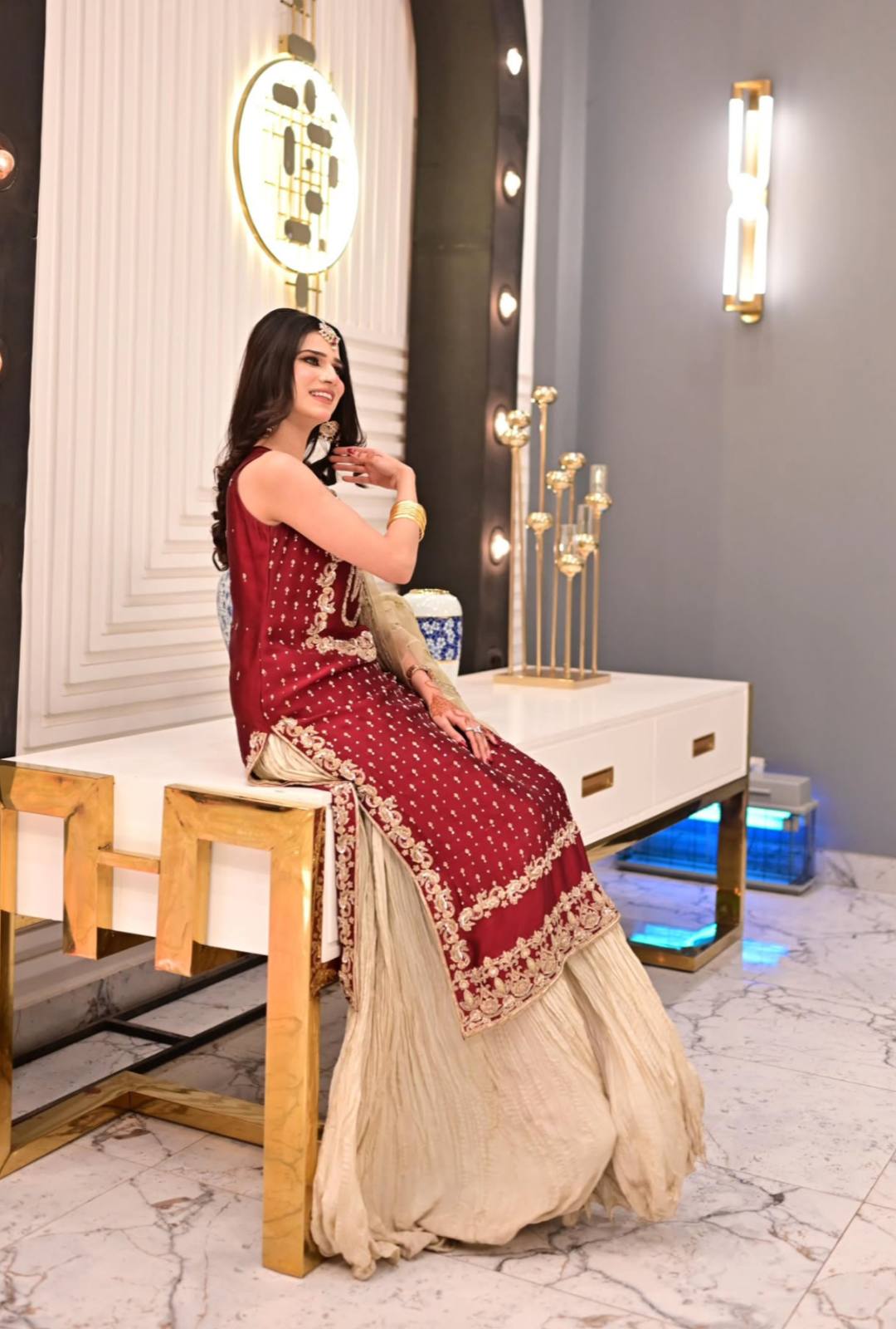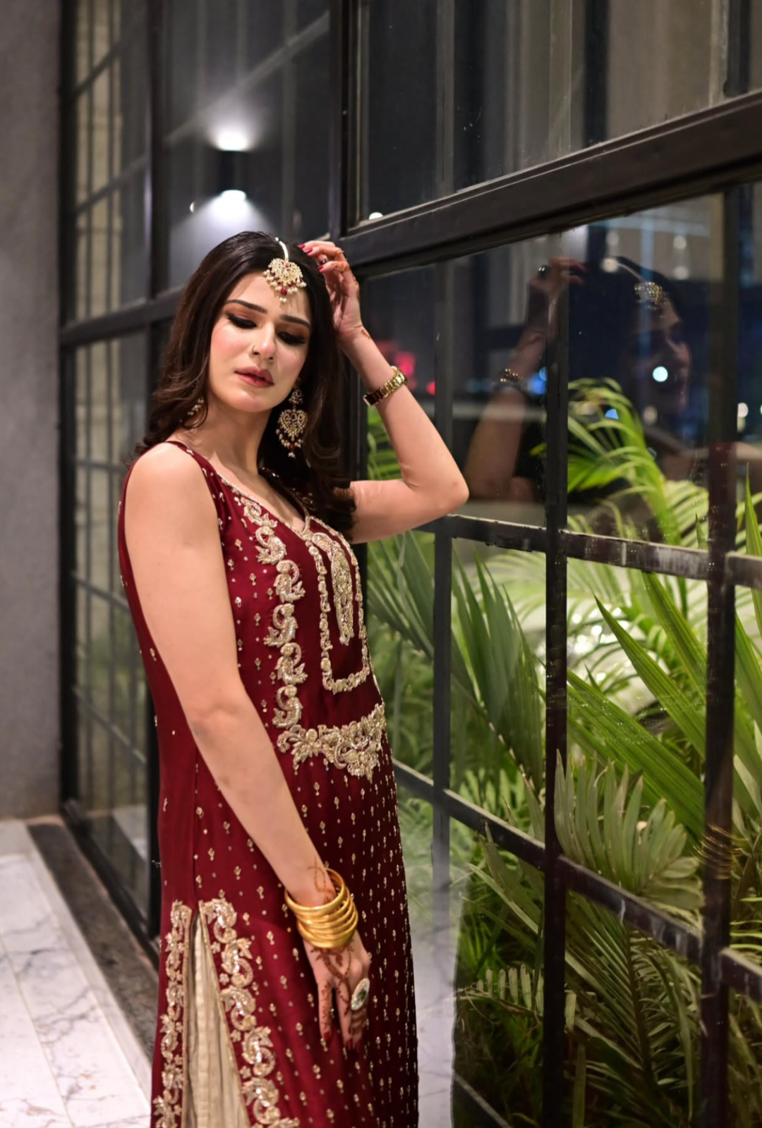 The Ruby dress is a stunning piece adorned with intricate resham, dabka, and naqshi work, showcasing a blend of traditional craftsmanship and modern elegance. It features sparkling crystals and sequins that add a touch of glamour, while bajra moti embellishments enhance its luxurious appeal. Perfect for formal occasions, this dress ensures your little one stands out with grace and sophistication.