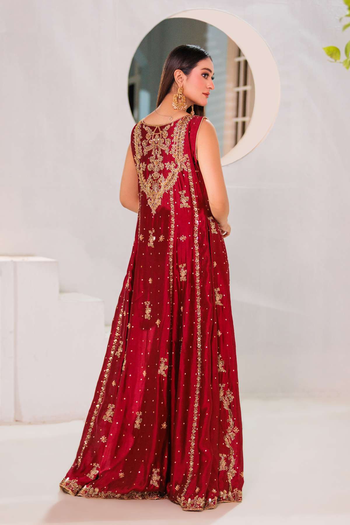 Make a grand entrance with Zeenat, a stunning maroon maxi dress designed for festive and formal occasions. This sleeveless outfit features rich golden embroidery that adds a luxurious and traditional charm to the look.