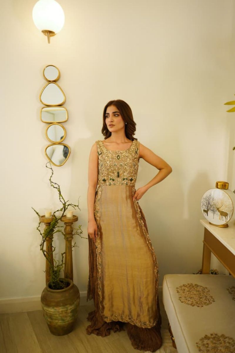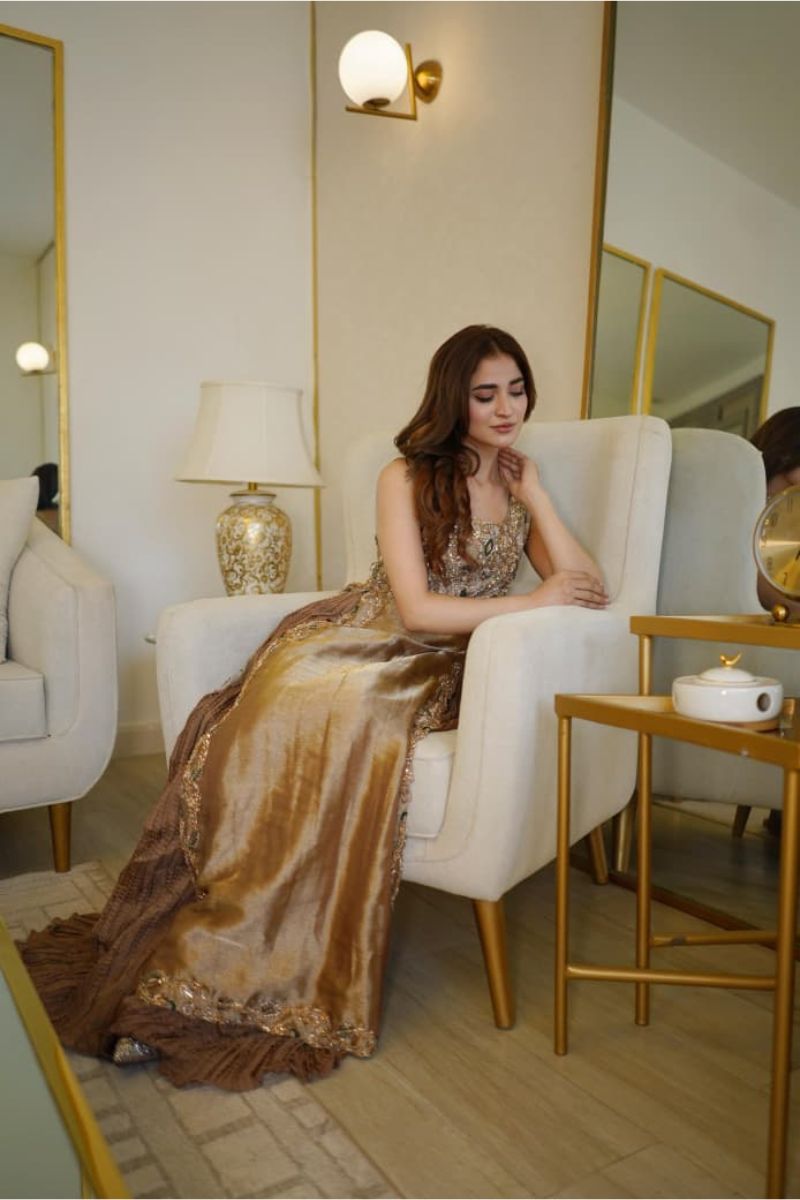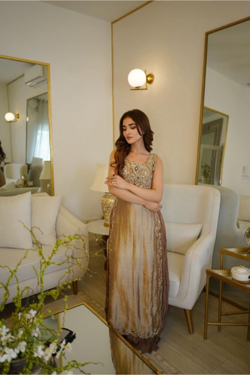 Sovereign Dune embodies the timeless elegance of desert gold and regal heritage. Crafted in a warm golden hue with intricate hand-embellished detailing along the bodice and borders, this ensemble reflects understated luxury and refined craftsmanship. Subtle accents and flowing silhouettes enhance its graceful movement, while the rich textures evoke the grandeur of royal traditions. Perfect for festive gatherings, wedding celebrations, and elegant evenings, Sovereign Dune is a tribute to heritage elegance with a modern regal touch.