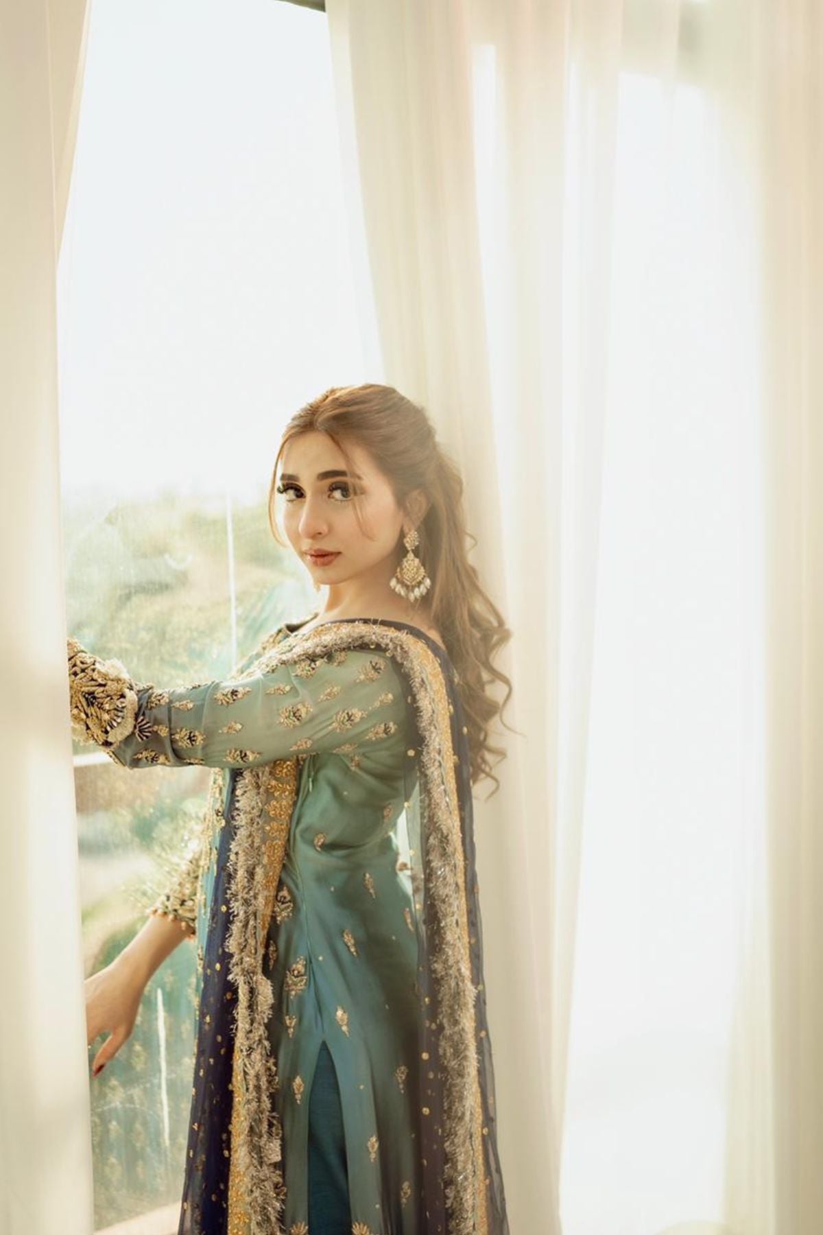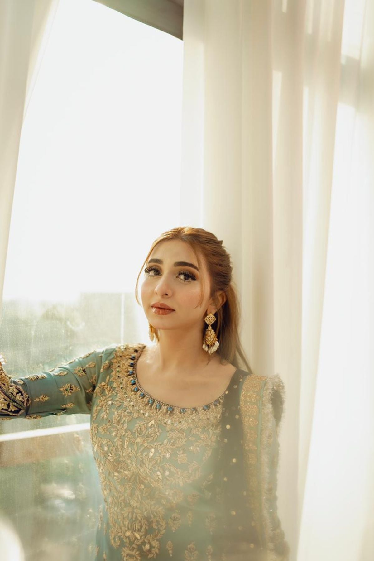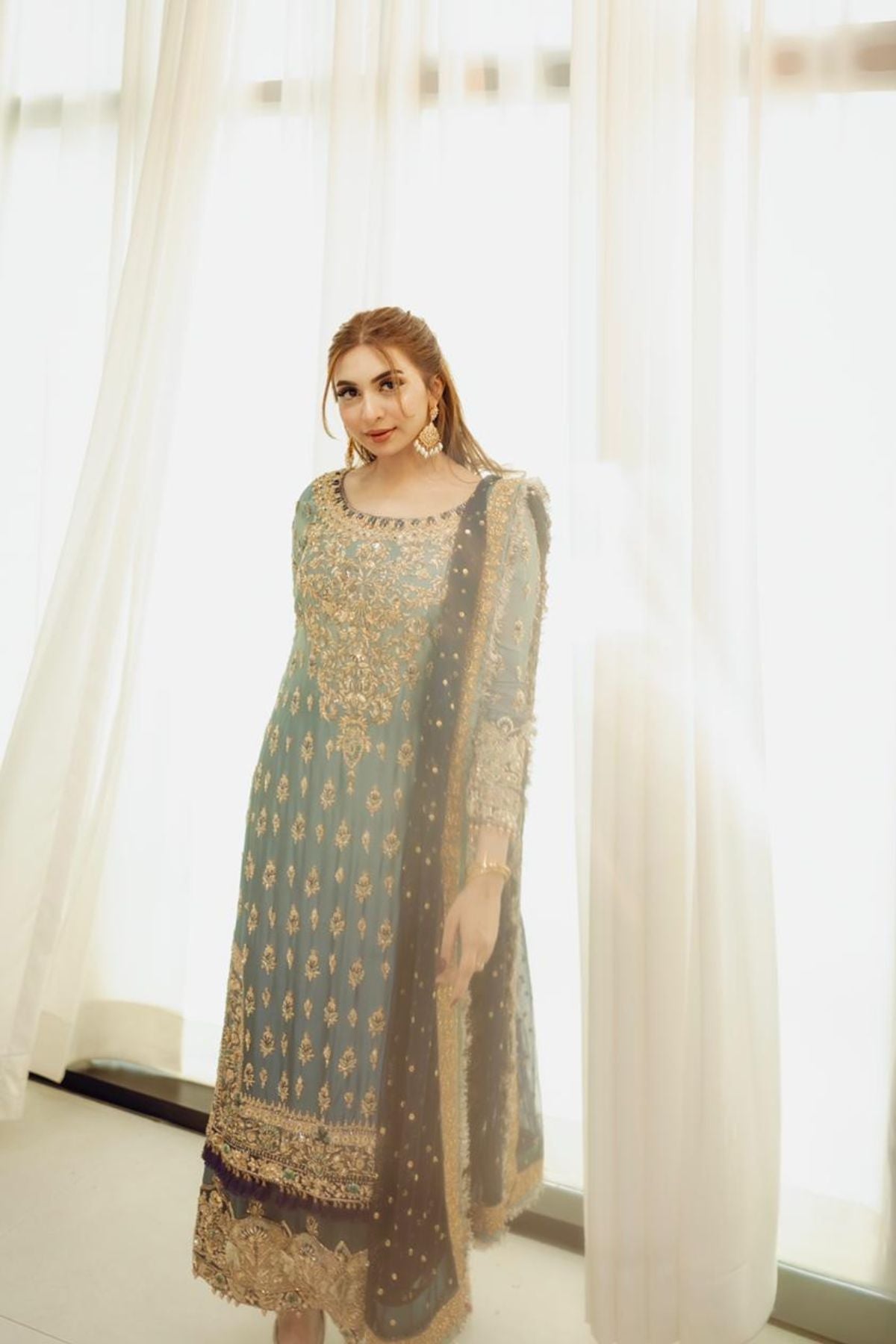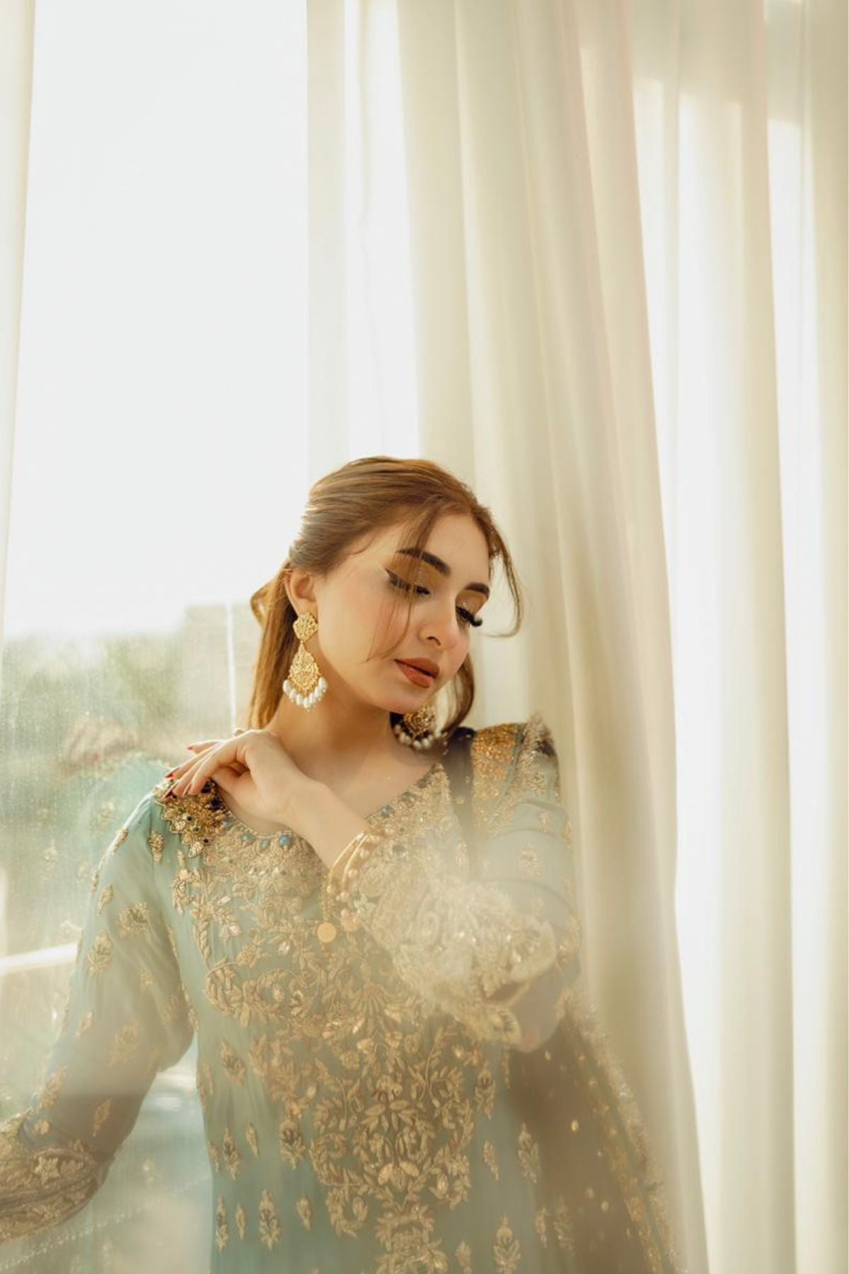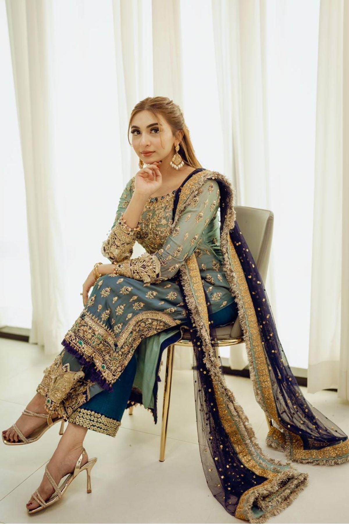 A stunning traditional ensemble crafted in a soft teal hue, intricately embroidered with rich gold threadwork and delicate embellishments. The long kameez features detailed motifs across the neckline, sleeves, and hem, paired with tapered trousers adorned with matching embroidery. The look is completed with a deep navy dupatta trimmed in ornate gold and shimmering accents, adding depth and contrast. Perfect for festive occasions, weddings, or formal gatherings a graceful blend of elegance and craftsmanship.