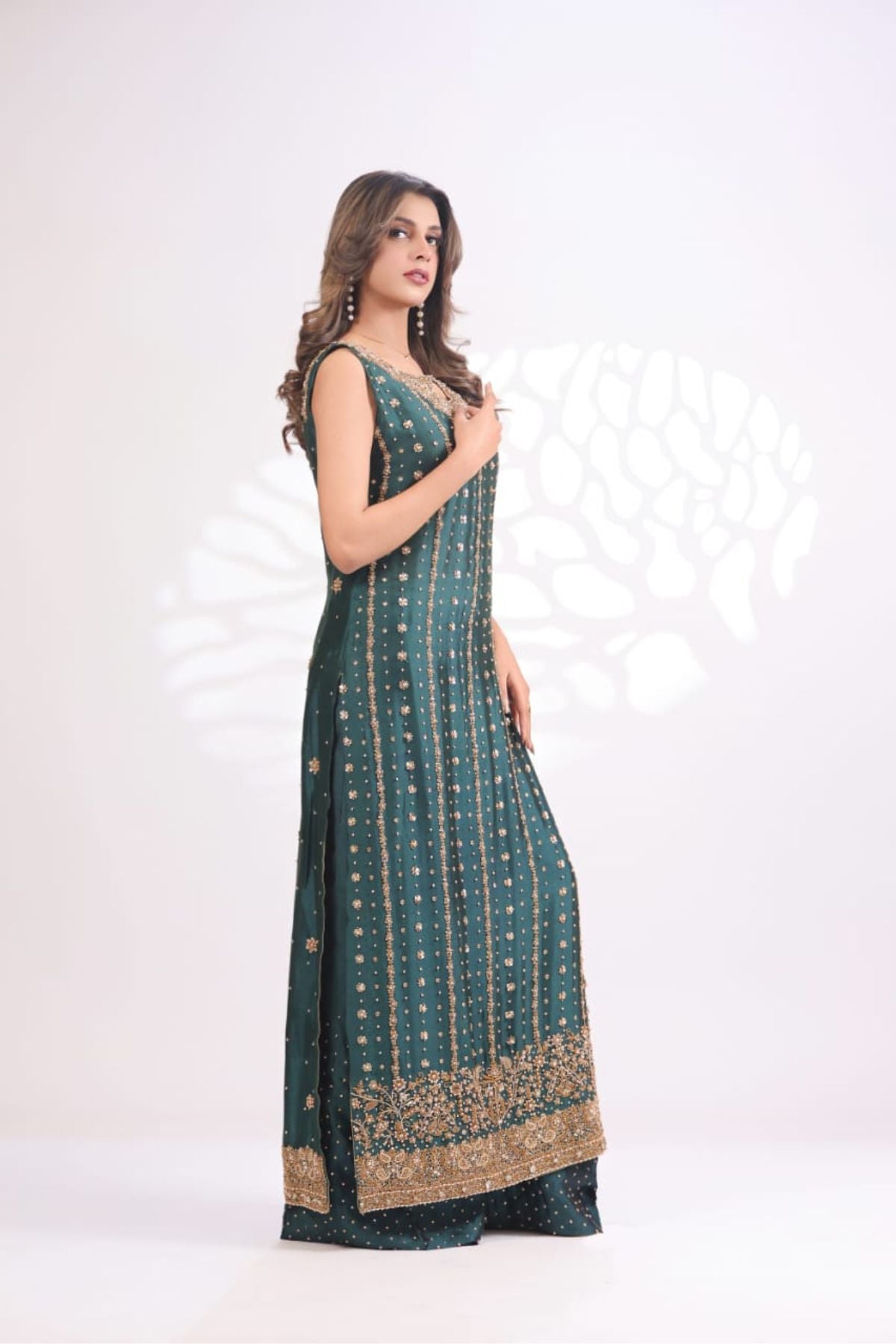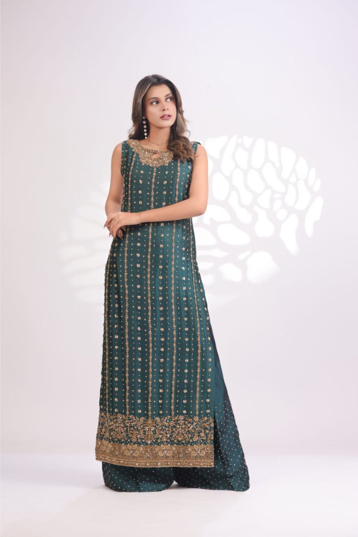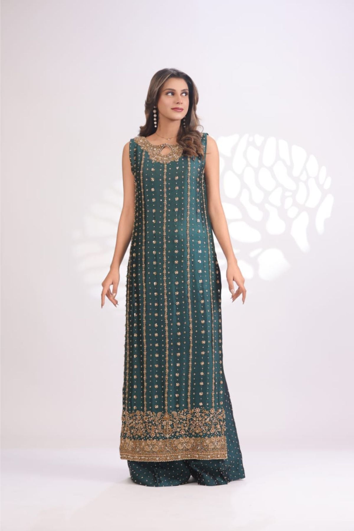Teal Luxe is a statement of refined elegance, crafted in a rich teal hue and adorned with intricate gold embellishments. The sleeveless long shirt features delicate vertical embroidery accented with subtle sequin work, creating a graceful and elongating silhouette. A heavily embellished hem adds depth and richness, while the matching wide-leg trousers complete the look with balanced sophistication. Ideal for festive evenings, formal gatherings, and celebratory occasions, Teal Luxe blends timeless charm with modern luxury.