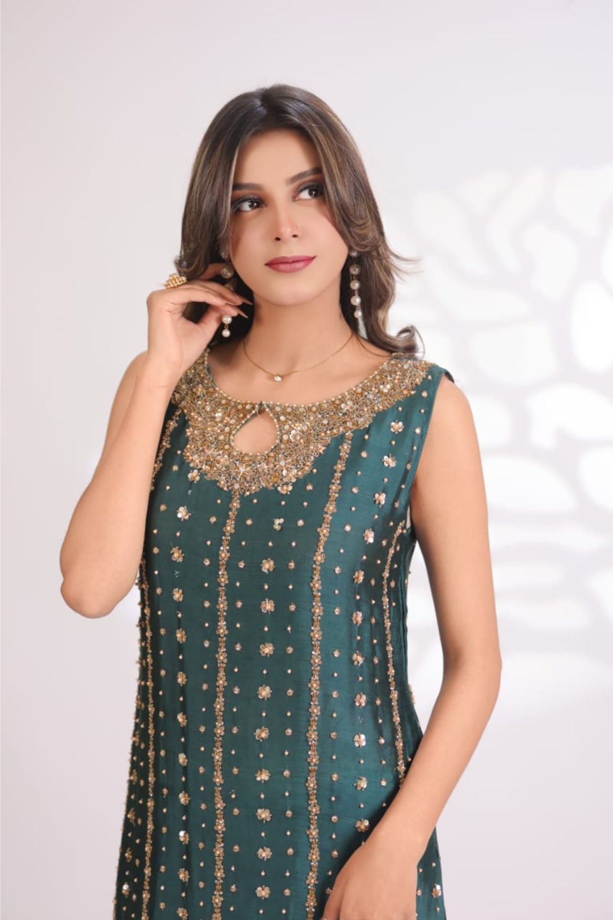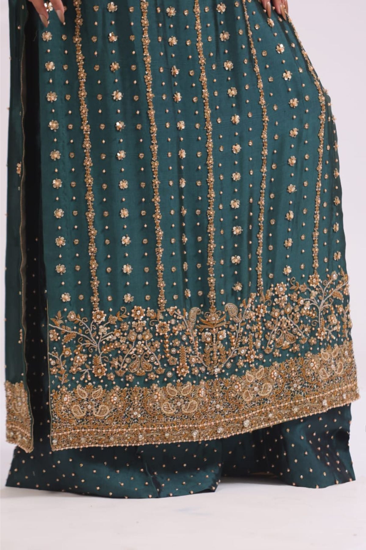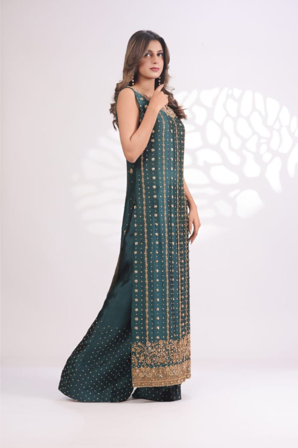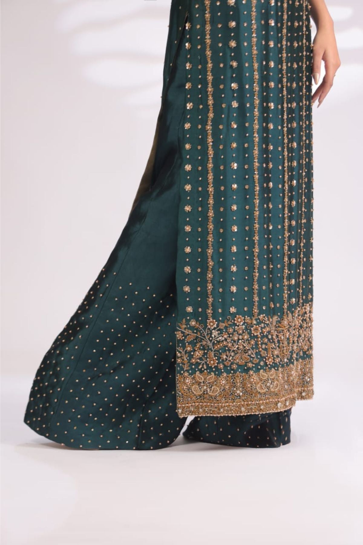 Teal Luxe is a statement of refined elegance, crafted in a rich teal hue and adorned with intricate gold embellishments. The sleeveless long shirt features delicate vertical embroidery accented with subtle sequin work, creating a graceful and elongating silhouette. A heavily embellished hem adds depth and richness, while the matching wide-leg trousers complete the look with balanced sophistication. Ideal for festive evenings, formal gatherings, and celebratory occasions, Teal Luxe blends timeless charm with modern luxury.