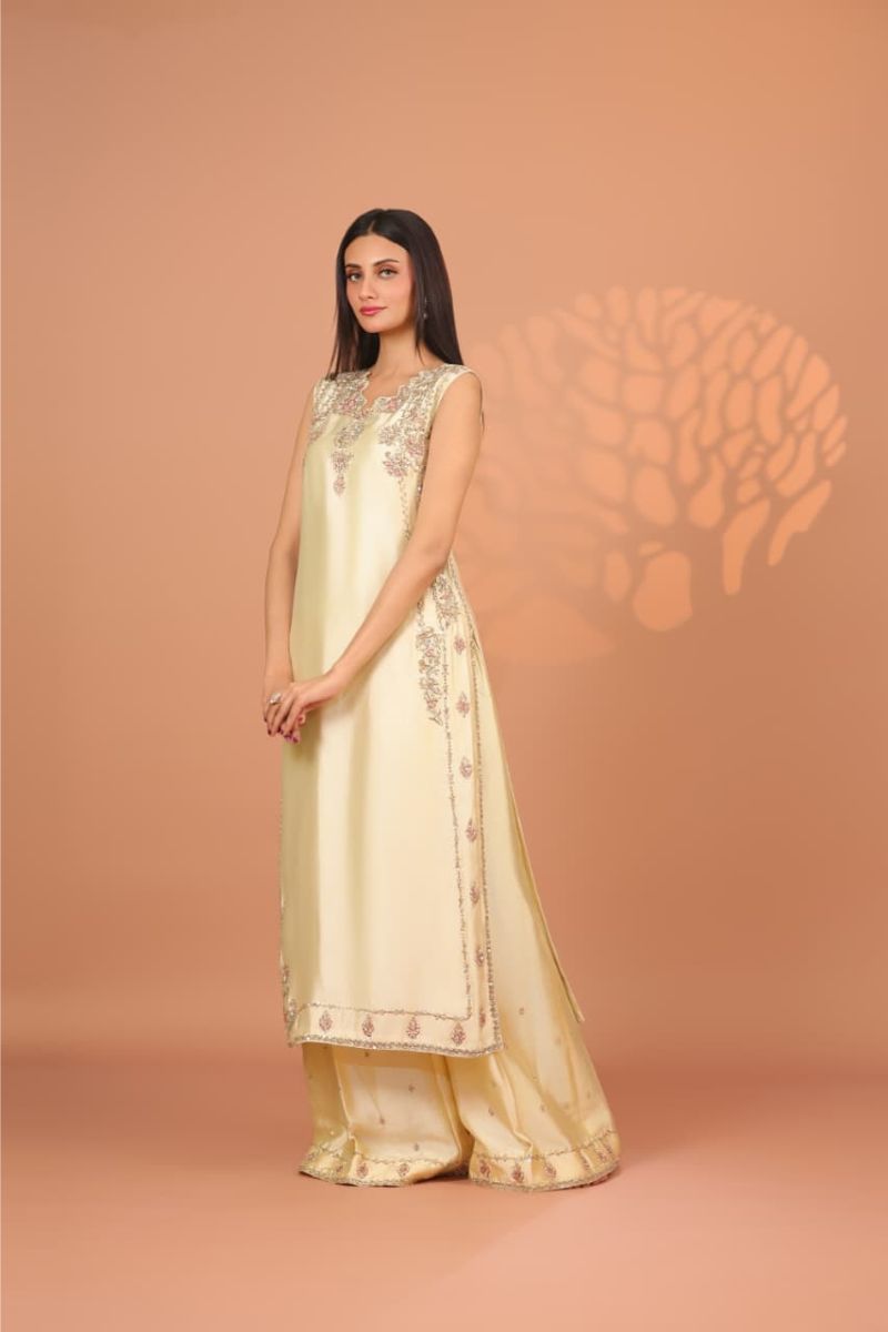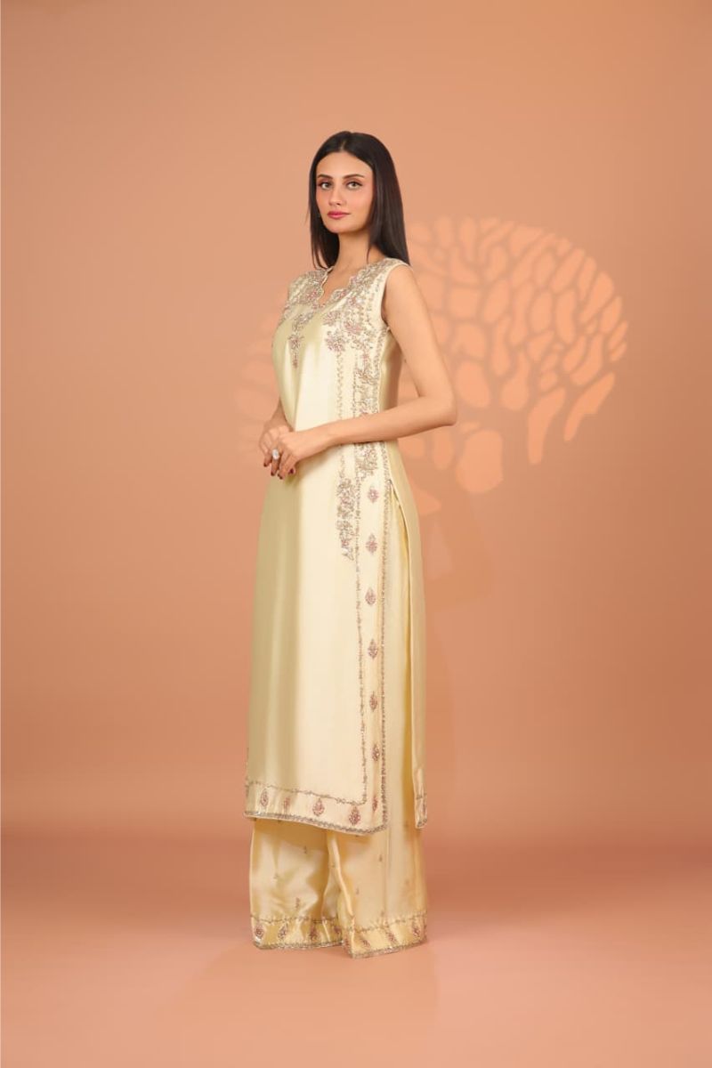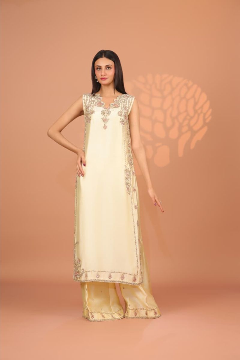 Vanilla Crest embodies understated elegance with a regal touch. Rendered in a delicate vanilla-cream hue, this ensemble radiates softness and sophistication. The subtle embellishments along the neckline and hem add a refined shimmer, while the fluid silhouette creates a timeless and graceful presence. Designed for intimate celebrations, festive gatherings, and elegant daytime affairs, Vanilla Crest is a statement in quiet luxury and effortless charm.