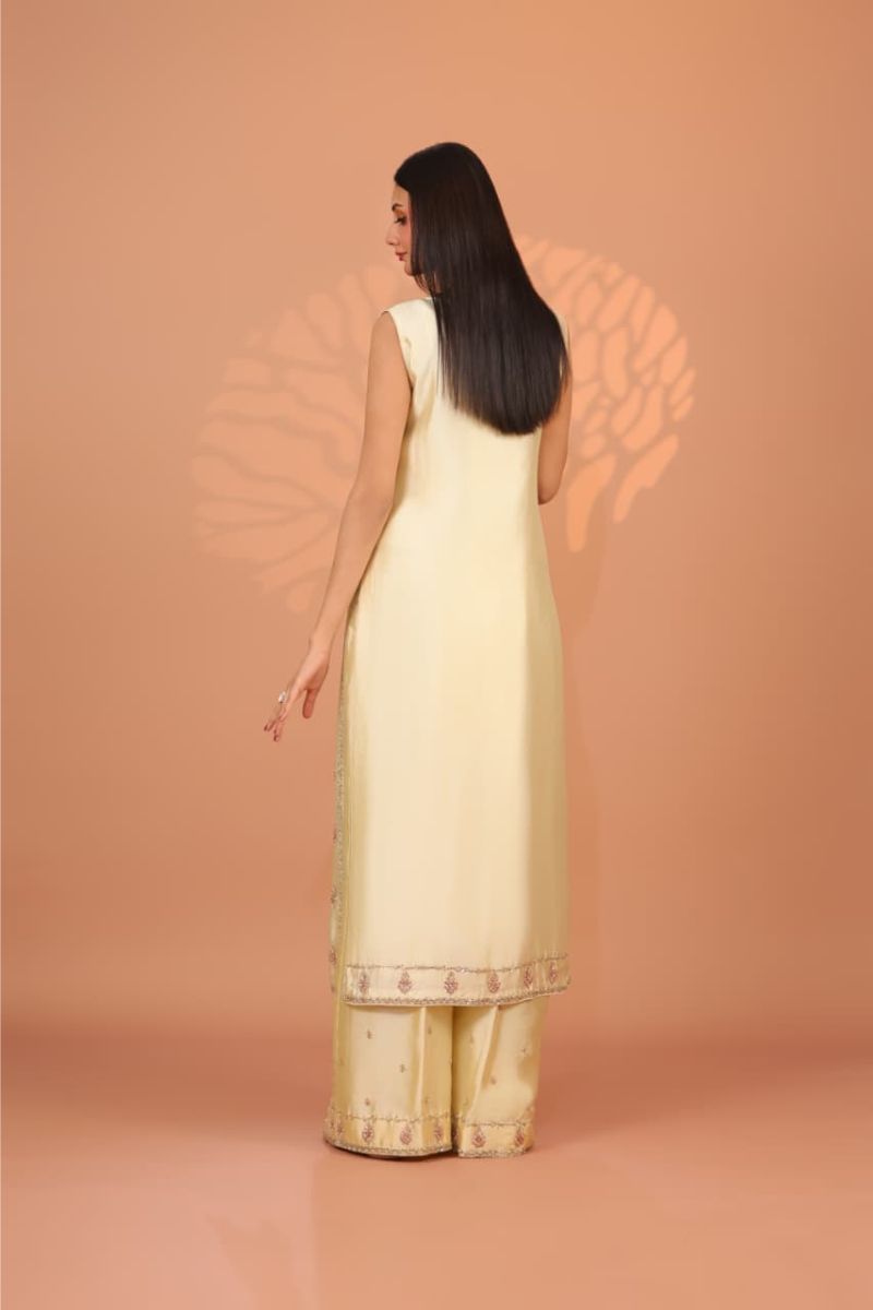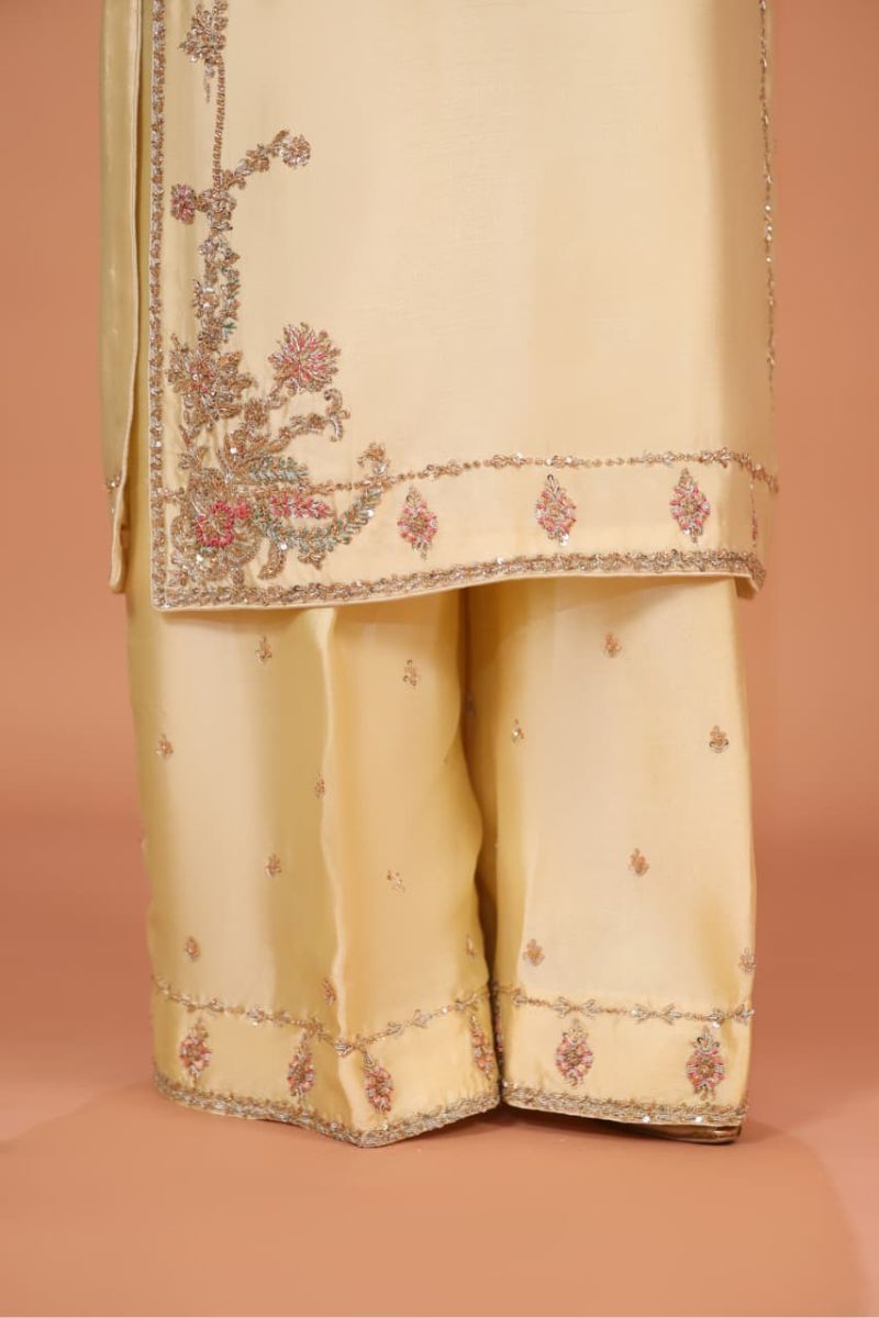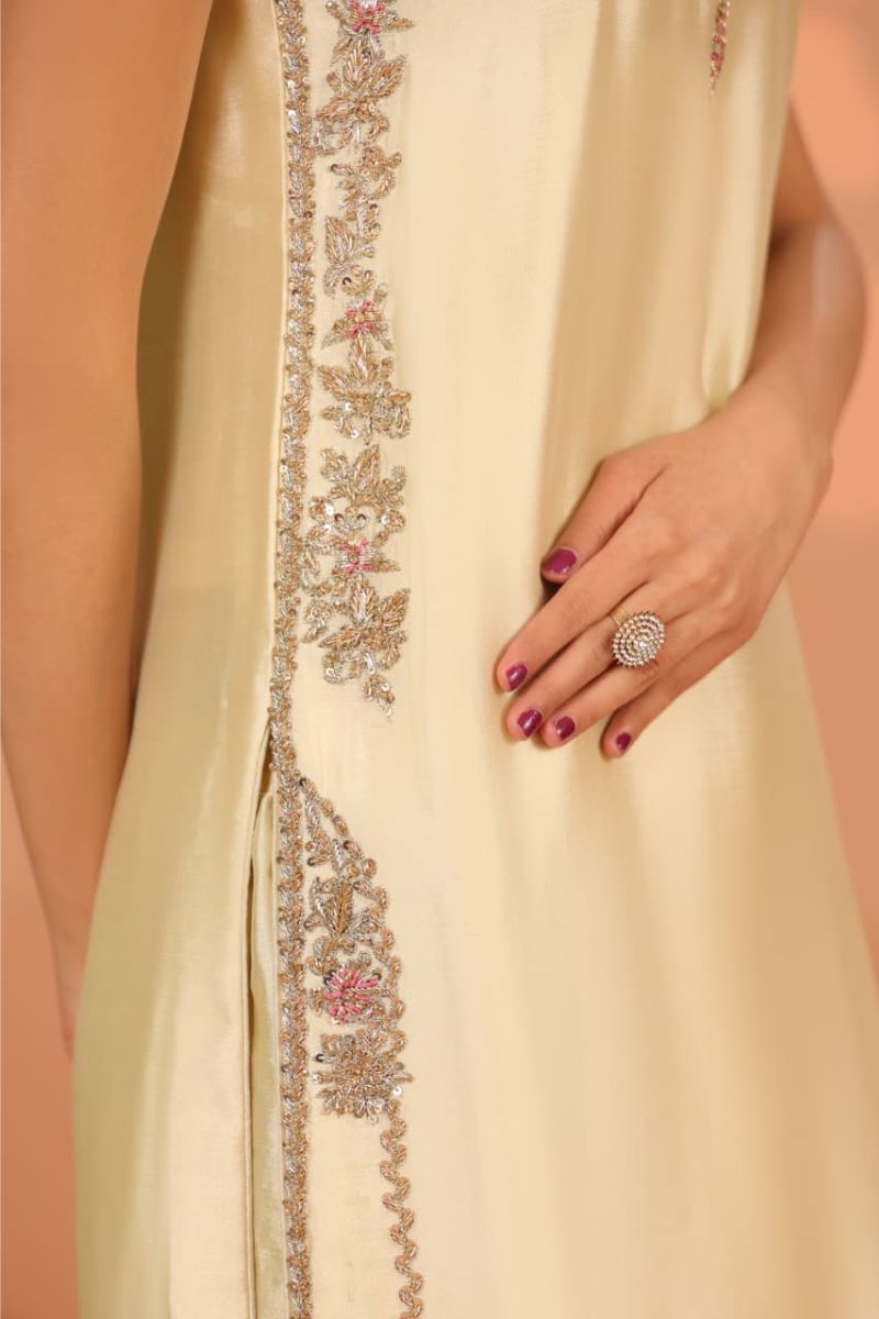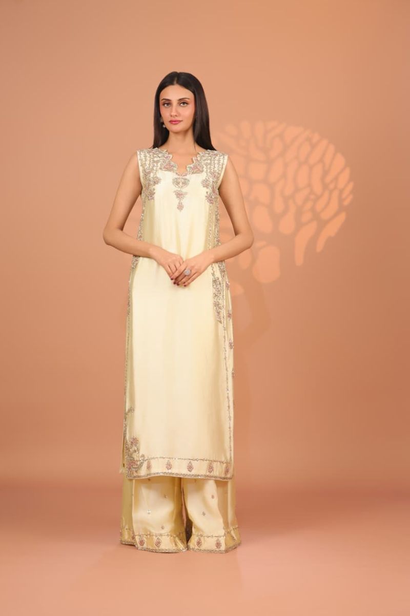 Vanilla Crest embodies understated elegance with a regal touch. Rendered in a delicate vanilla-cream hue, this ensemble radiates softness and sophistication. The subtle embellishments along the neckline and hem add a refined shimmer, while the fluid silhouette creates a timeless and graceful presence. Designed for intimate celebrations, festive gatherings, and elegant daytime affairs, Vanilla Crest is a statement in quiet luxury and effortless charm.